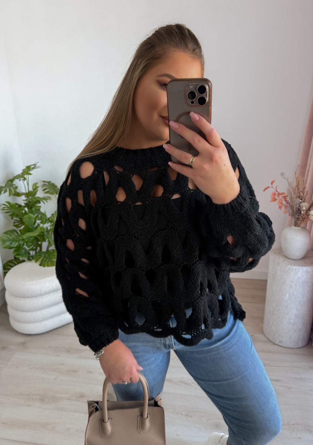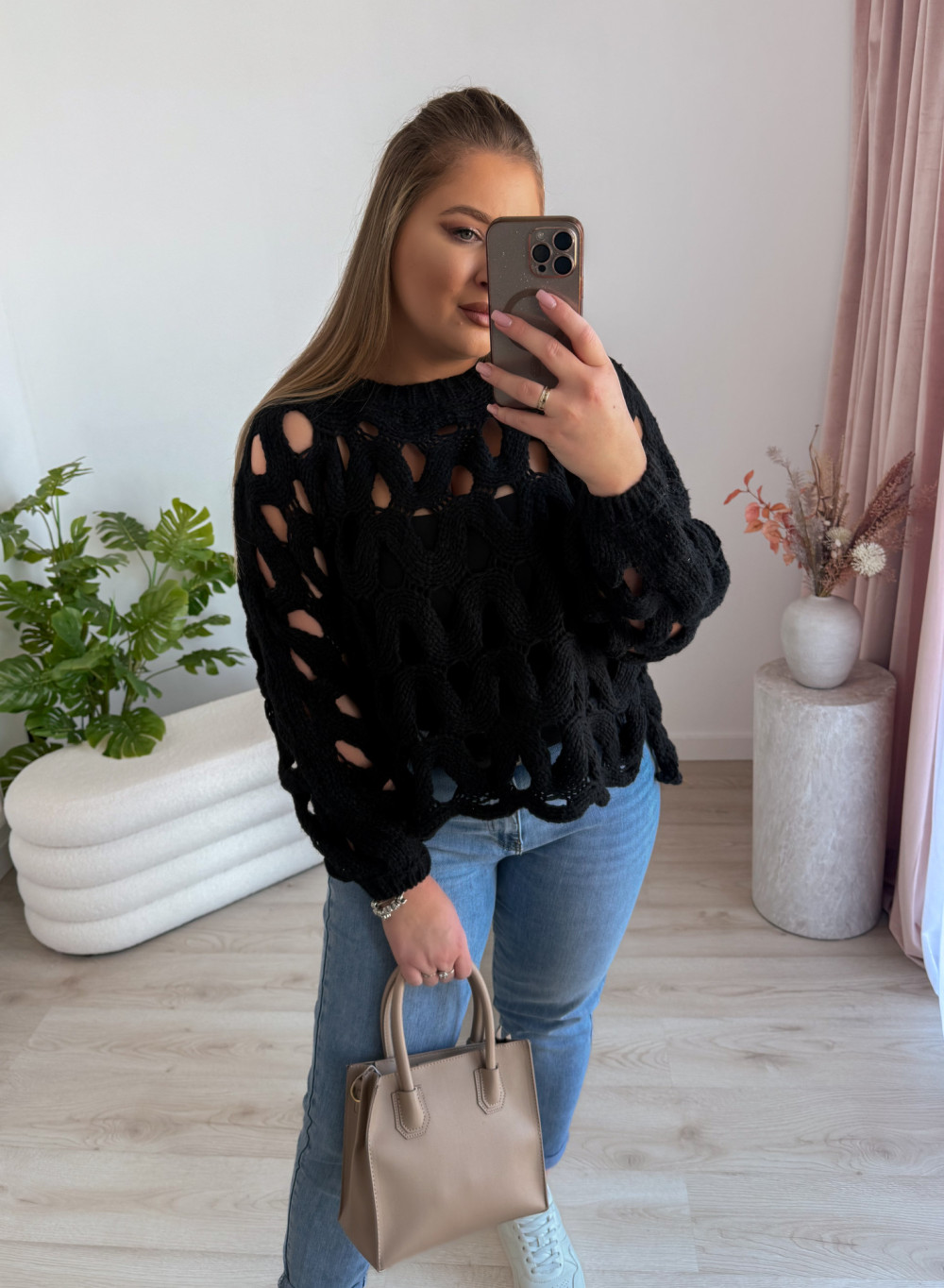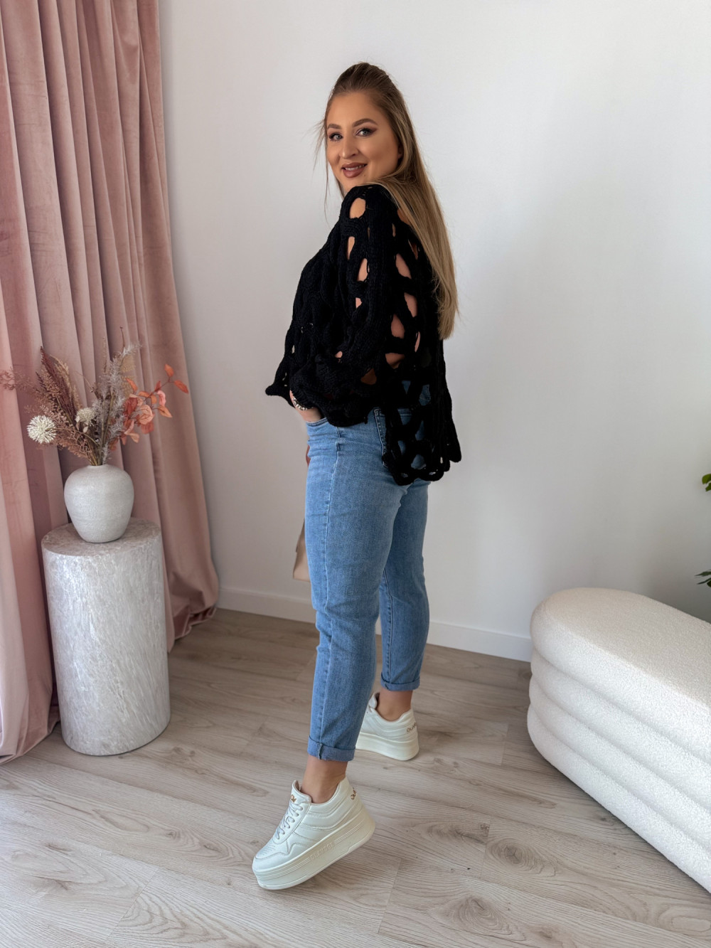 Ten ażurowy sweter o nietoperzowym kroju to połączenie lekkości i wygody, które doda charakteru każdej stylizacji. Idealny zarówno do casualowych looków, jak i na bardziej kobiece zestawienia.