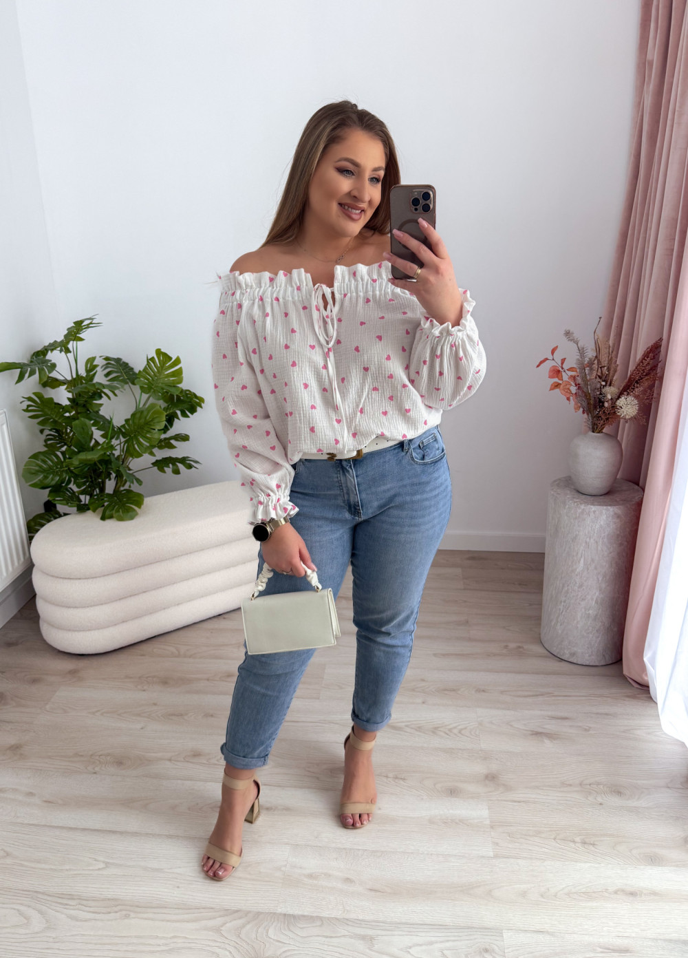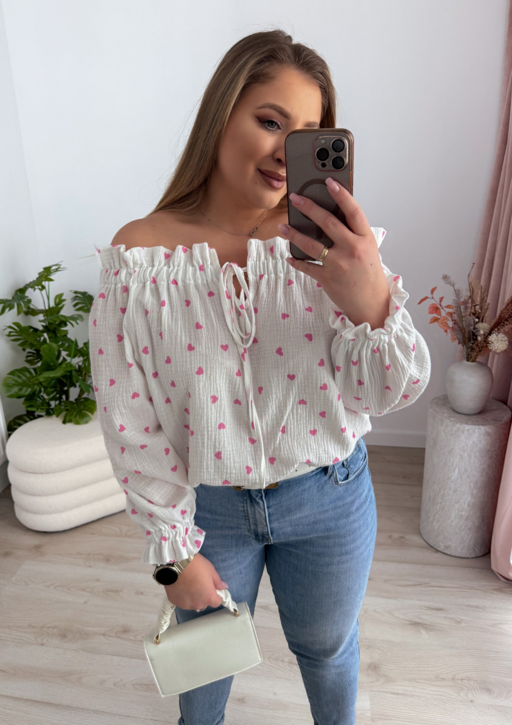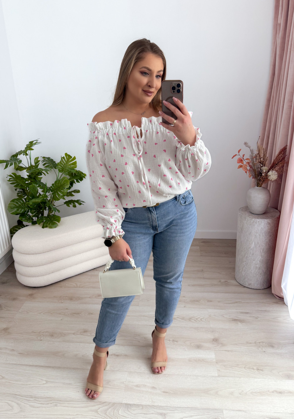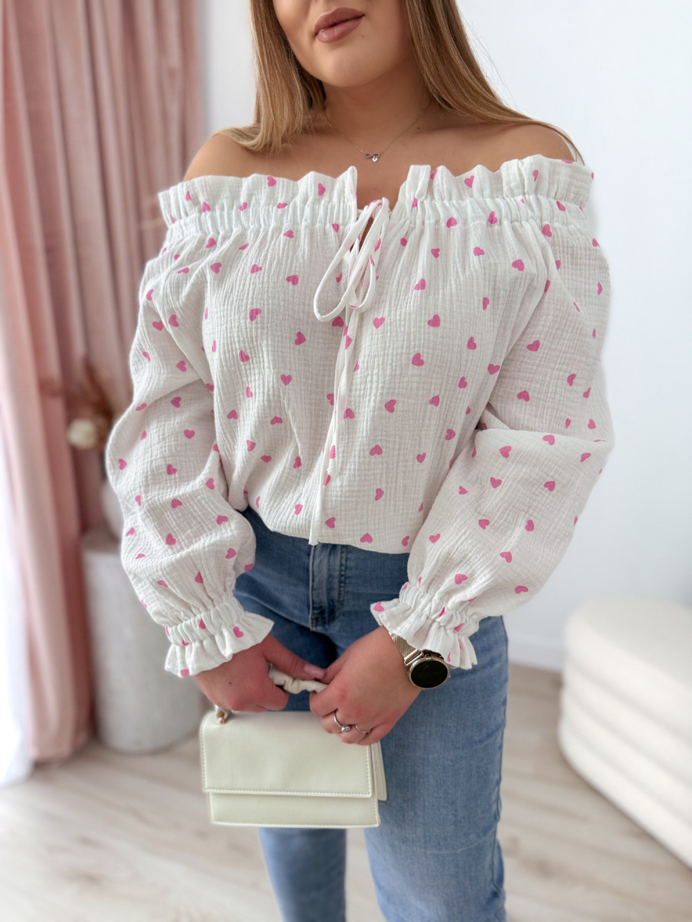 Ta muślinowa bluzka hiszpanka w serduszka to idealna propozycja na wiosenne i letnie dni, pełna lekkości i dziewczęcego uroku. Odkryte ramiona w stylu hiszpanki pięknie podkreślają sylwetkę i dodają romantycznego charakteru.