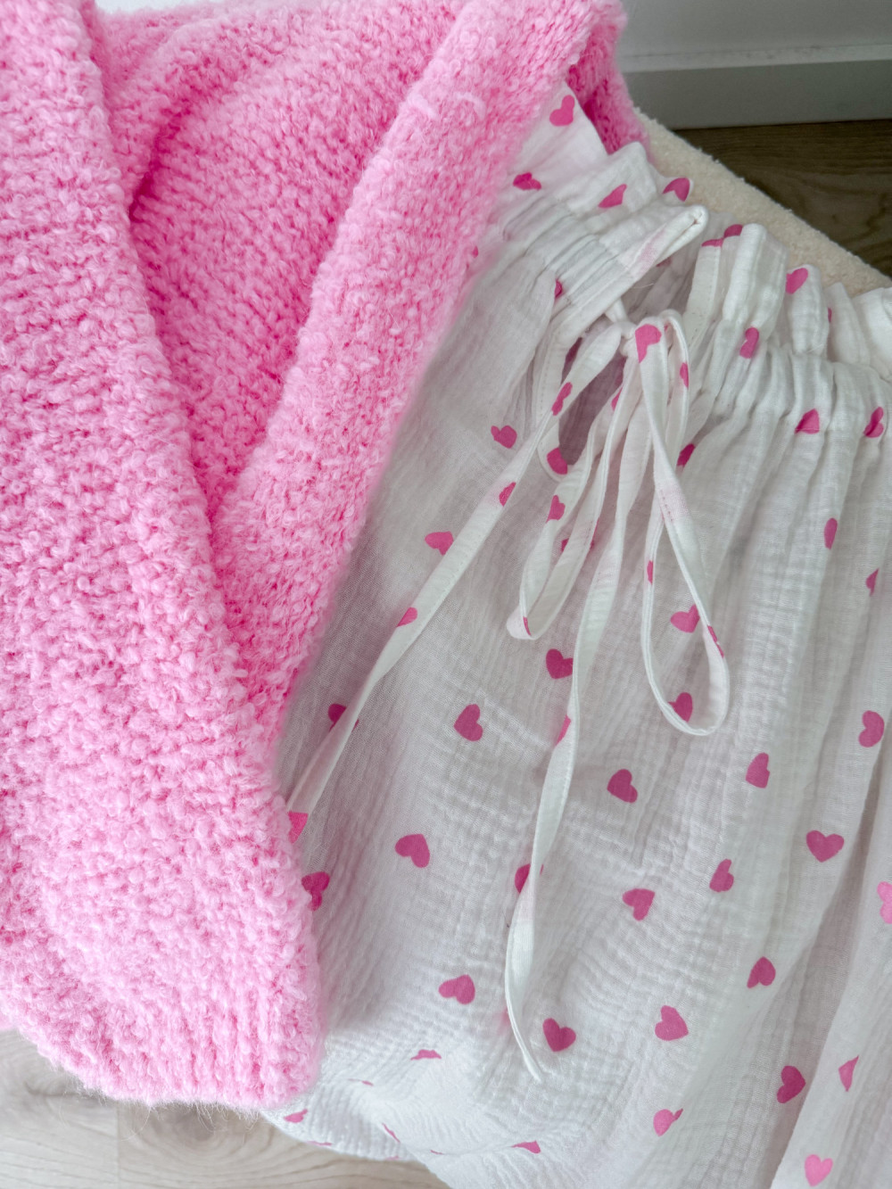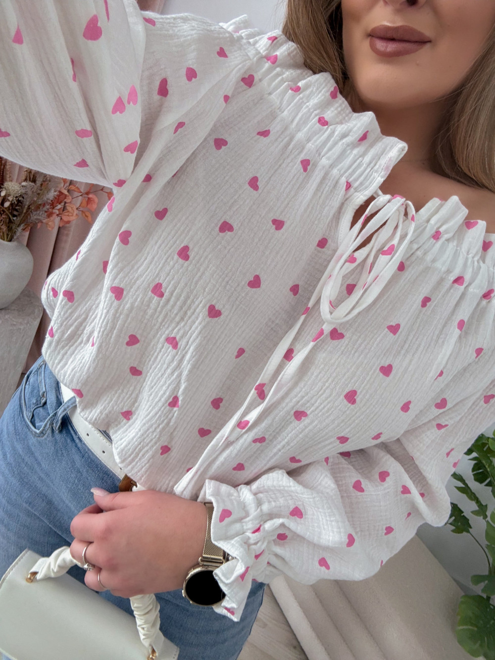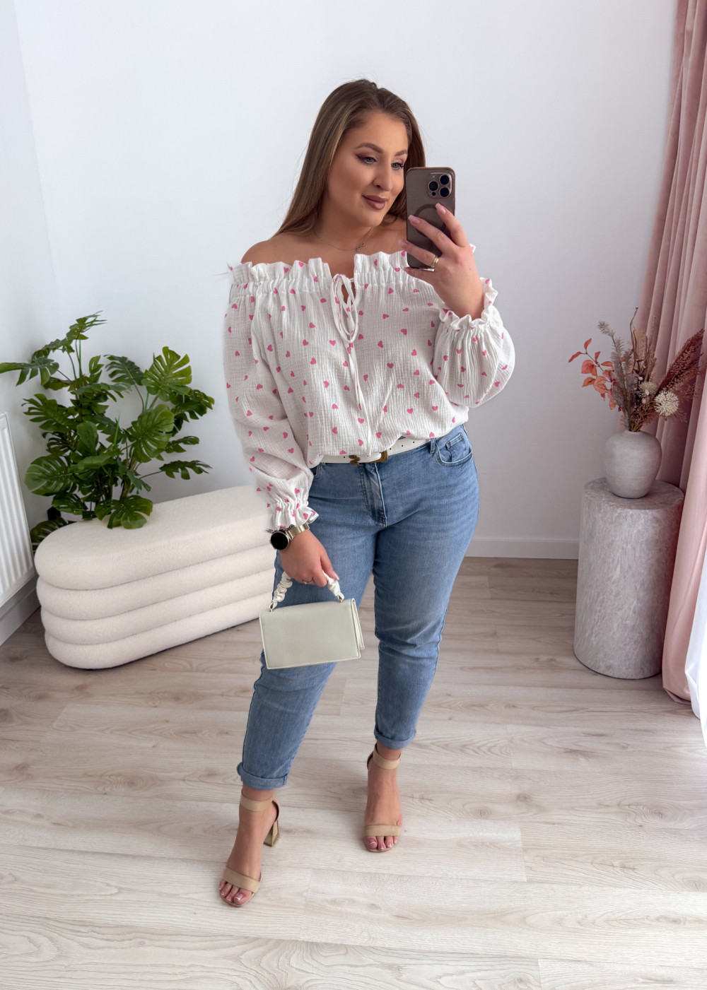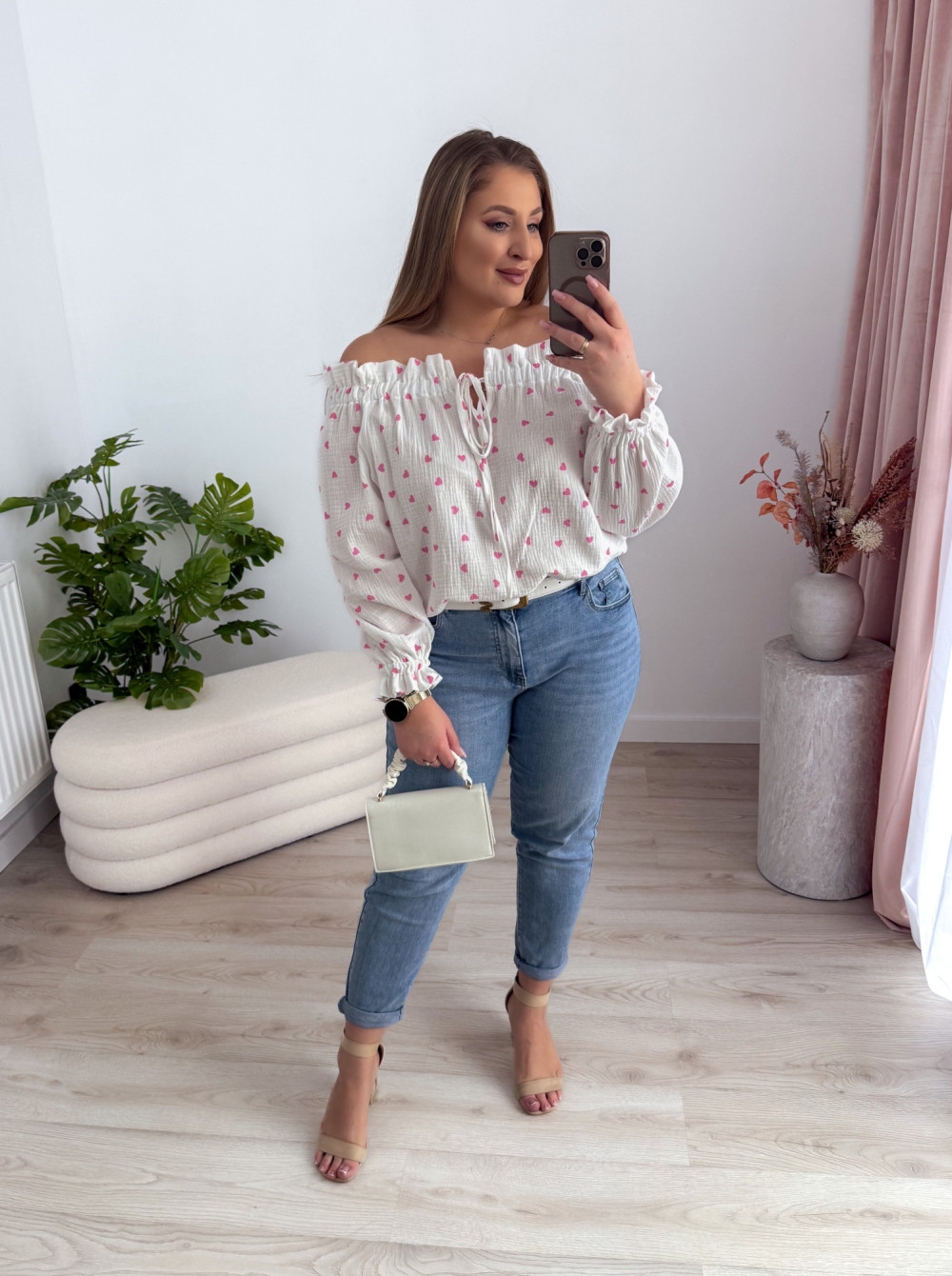 Ta muślinowa bluzka hiszpanka w serduszka to idealna propozycja na wiosenne i letnie dni, pełna lekkości i dziewczęcego uroku. Odkryte ramiona w stylu hiszpanki pięknie podkreślają sylwetkę i dodają romantycznego charakteru.