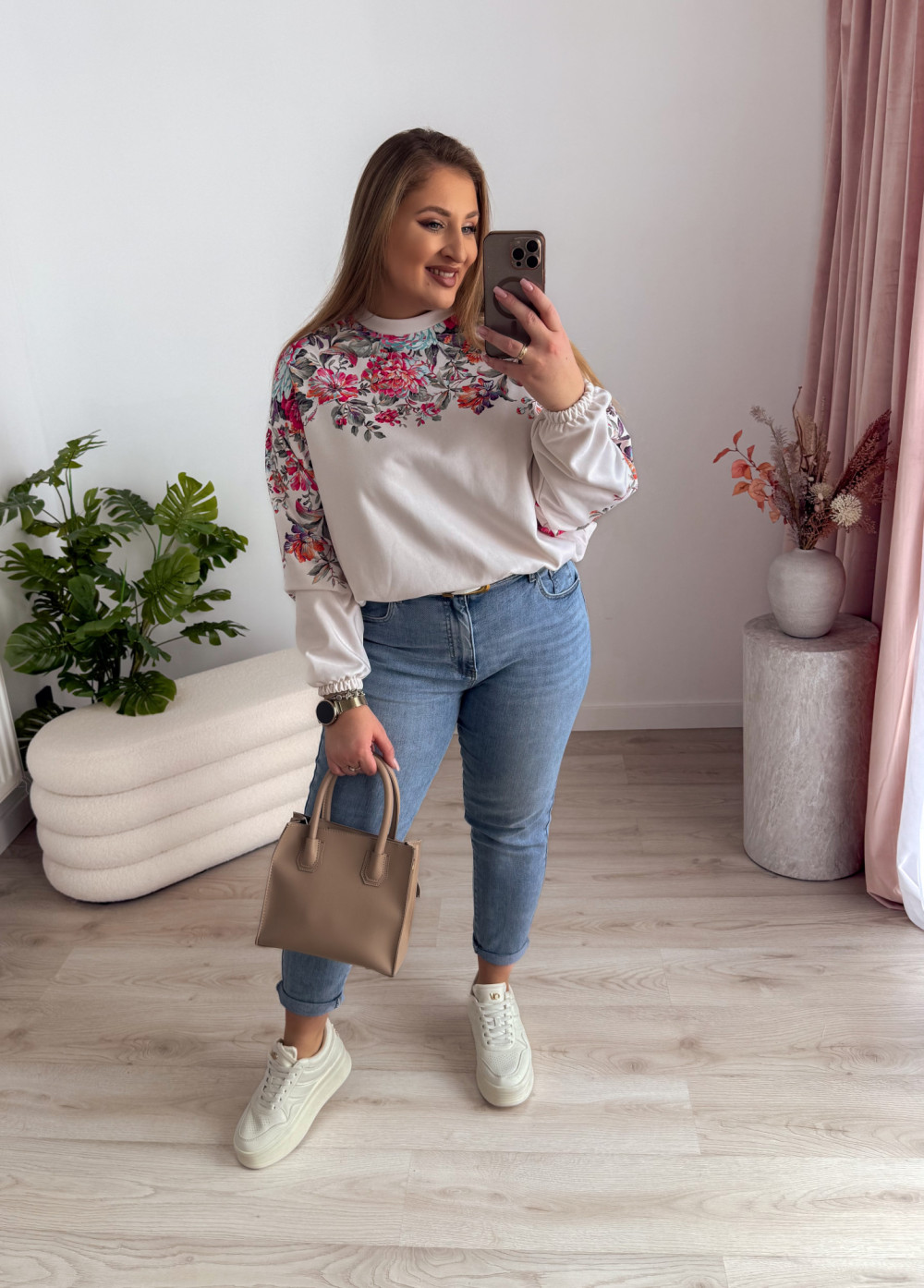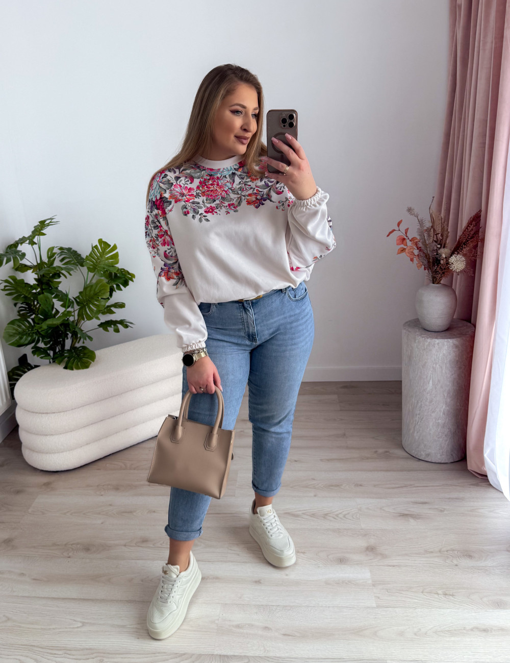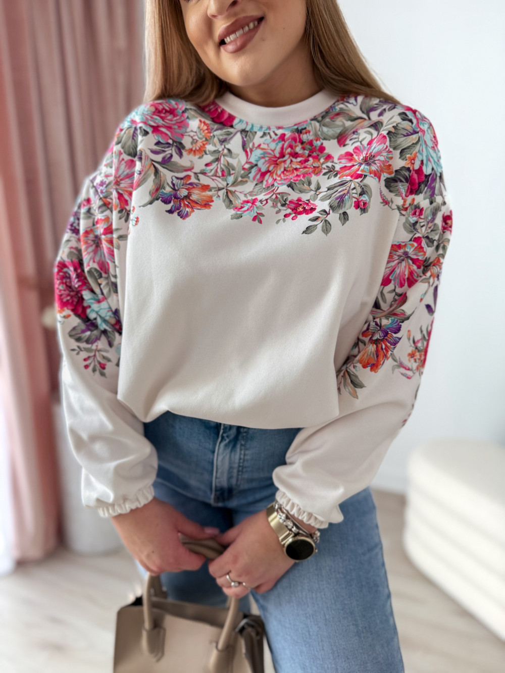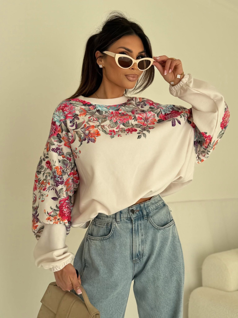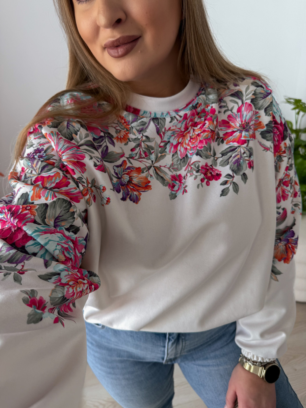 - kwiatowy wzór na rękawach i w górnej części bluzy dodaje wiosennego uroku