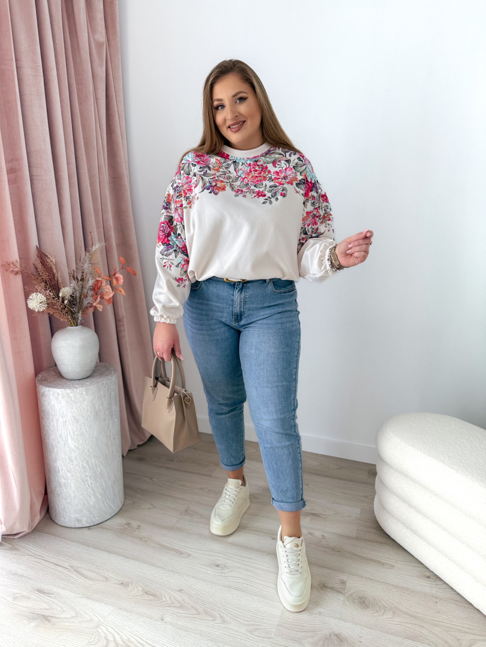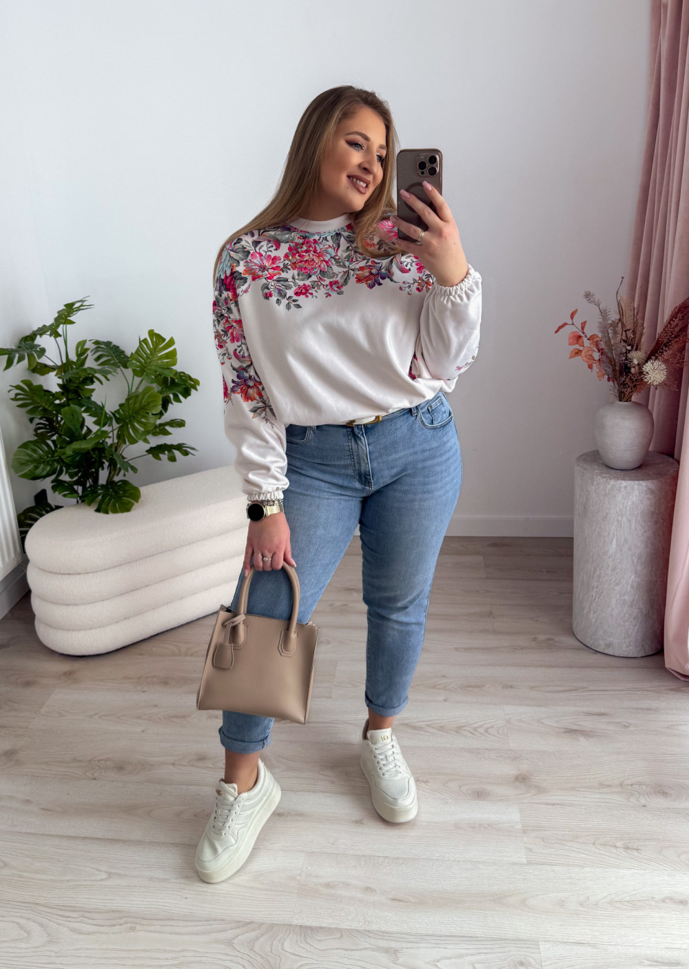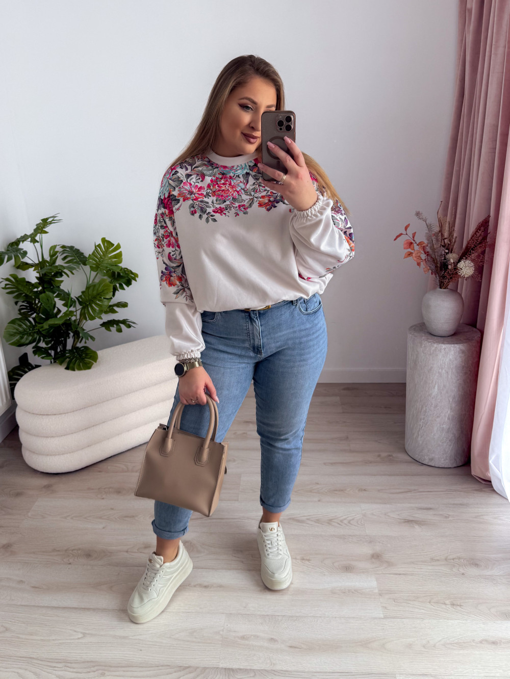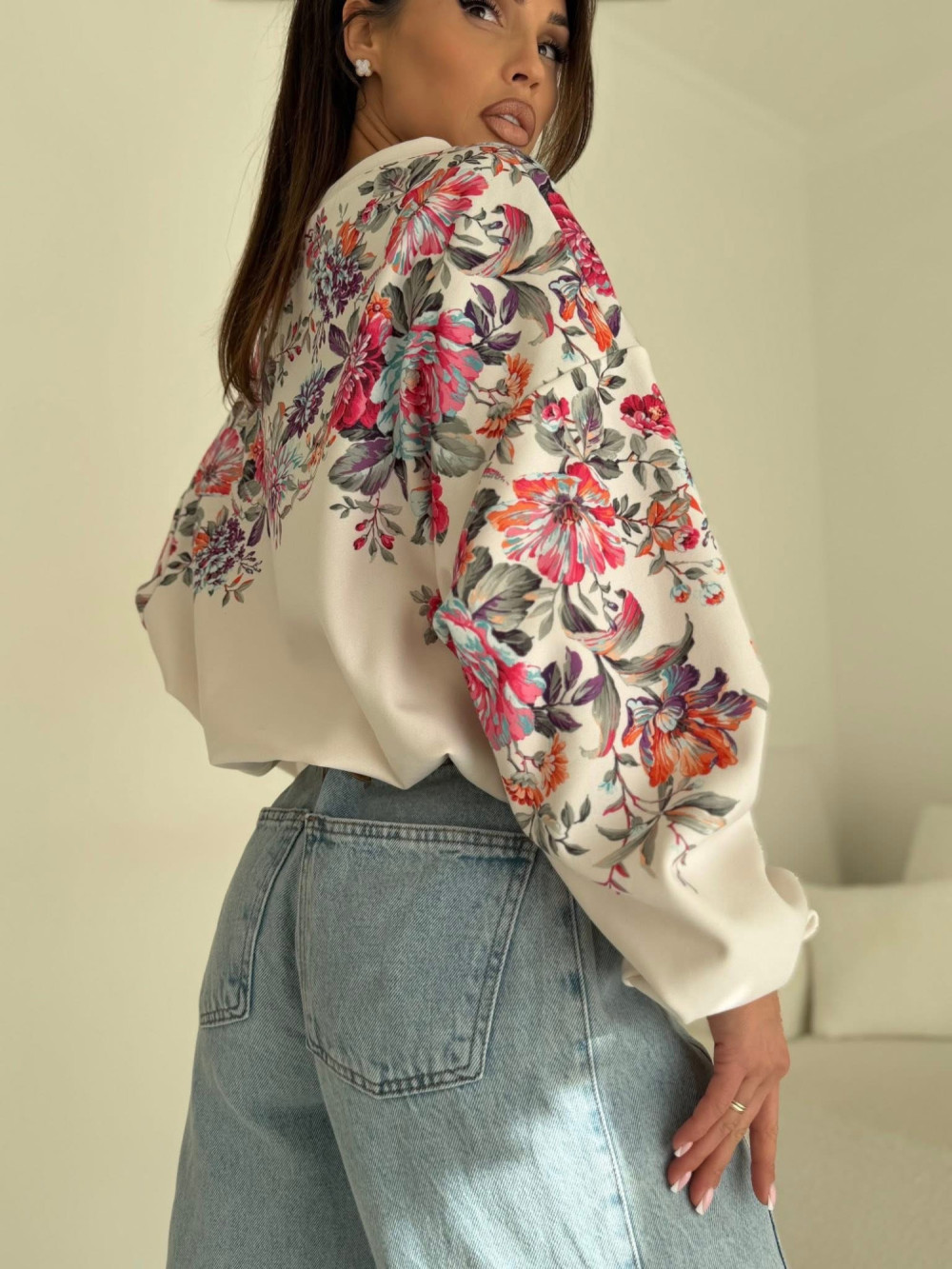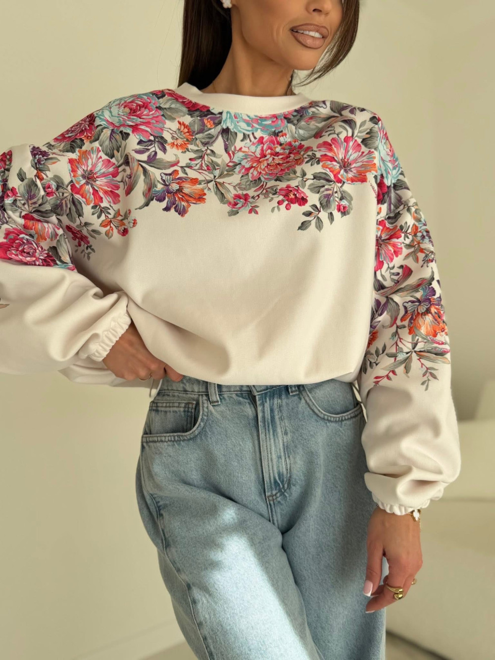 - kwiatowy wzór na rękawach i w górnej części bluzy dodaje wiosennego uroku