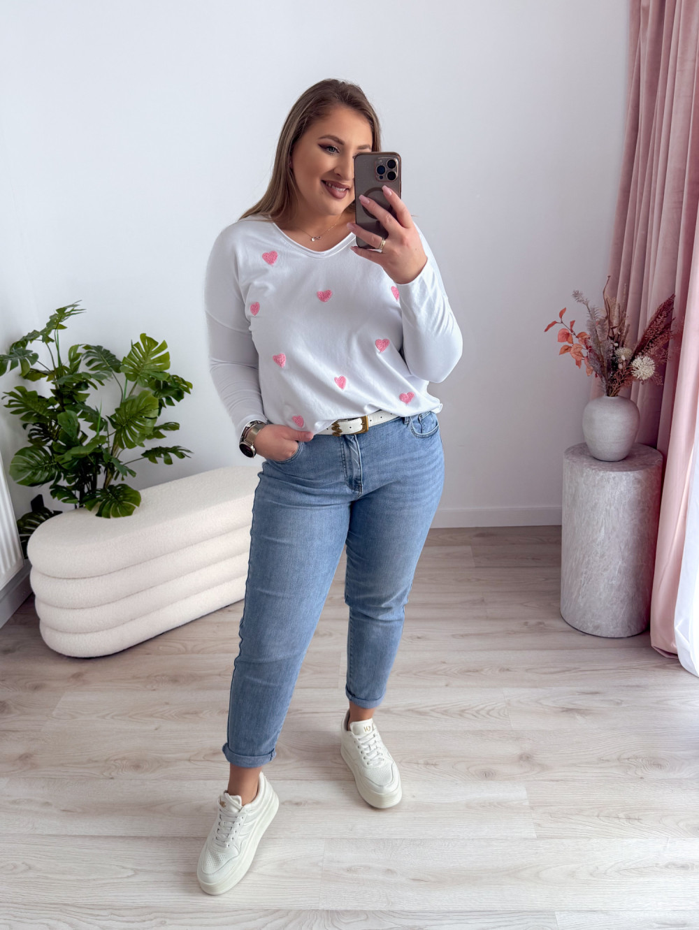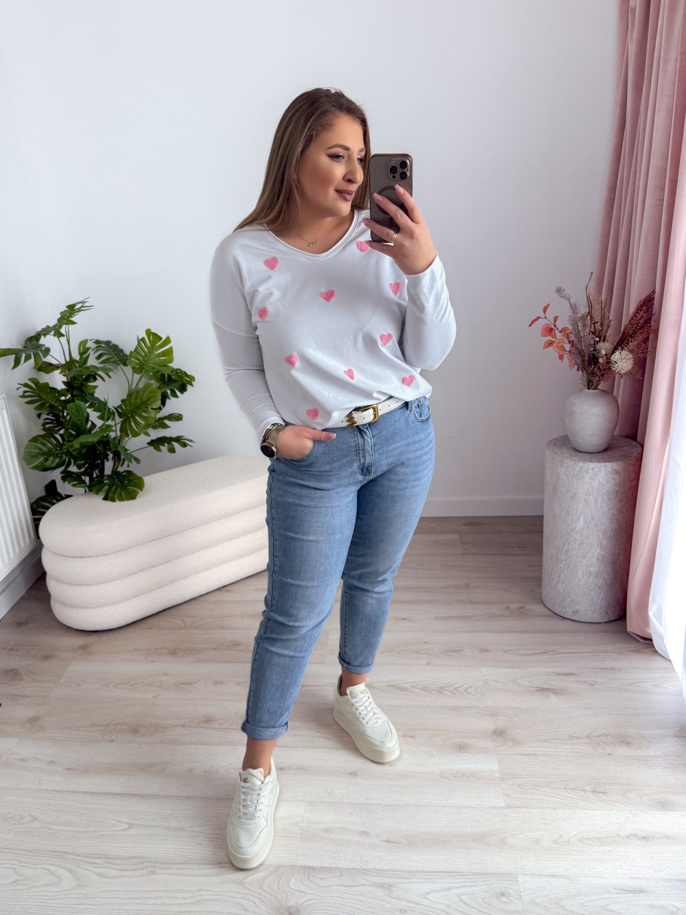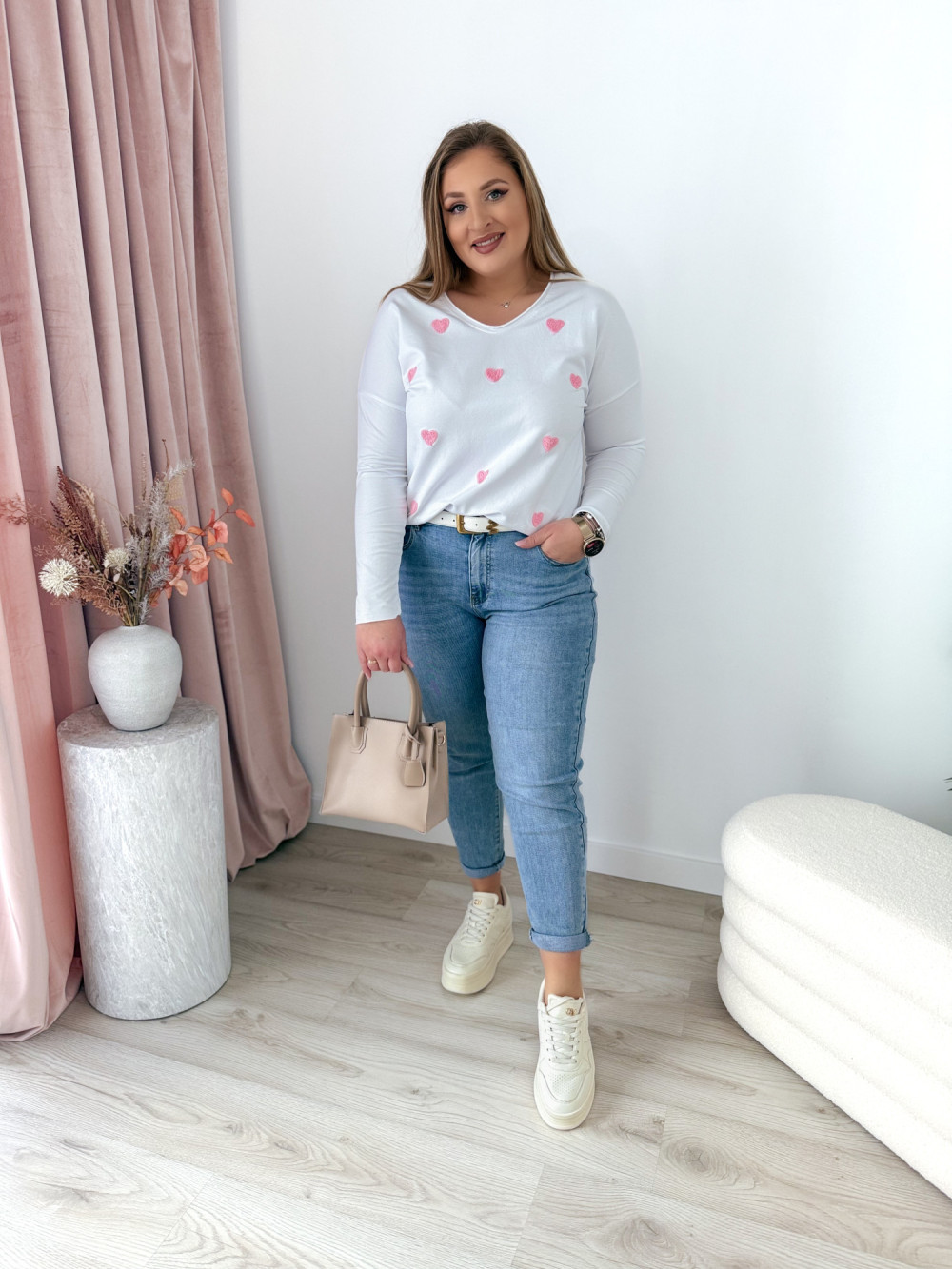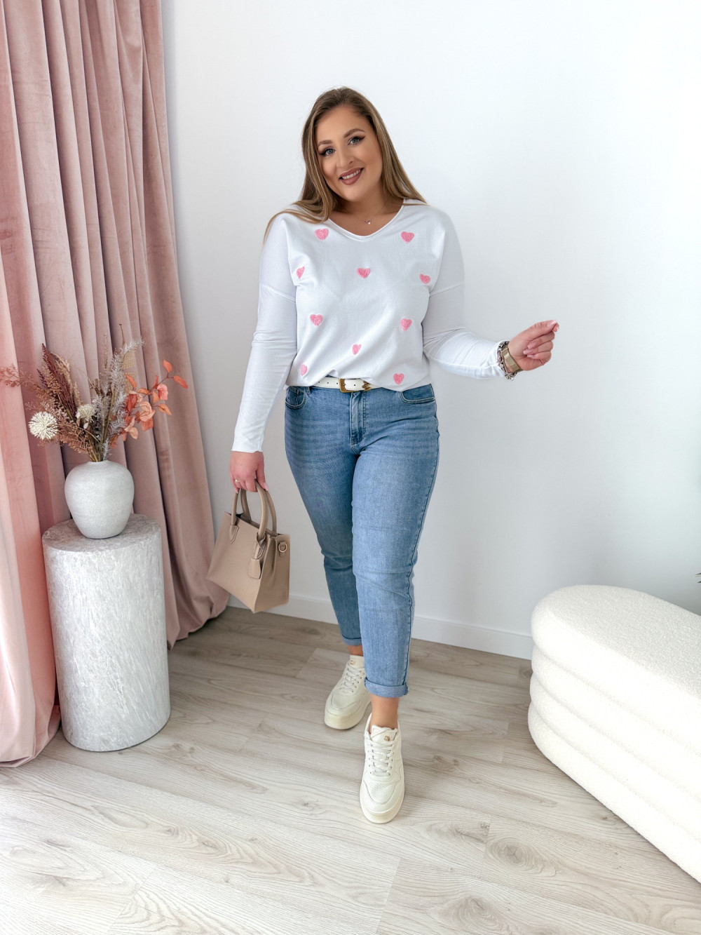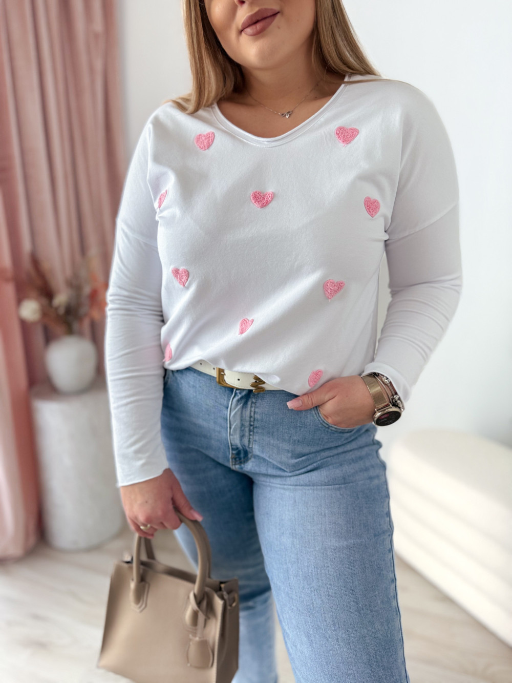 Ta bluzka z dekoltem w serek to idealna propozycja dla miłośniczek subtelnych, kobiecych detali. Naszywane serduszka dodają jej uroku i romantycznego charakteru, a długi rękaw sprawia, że świetnie sprawdzi się także w chłodniejsze dni.