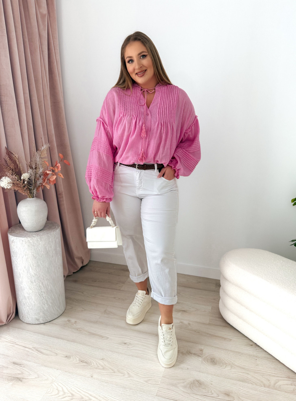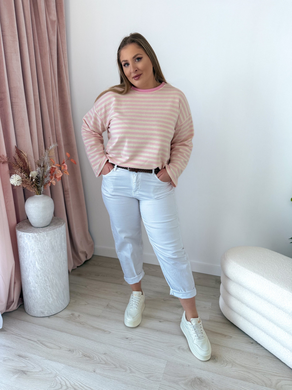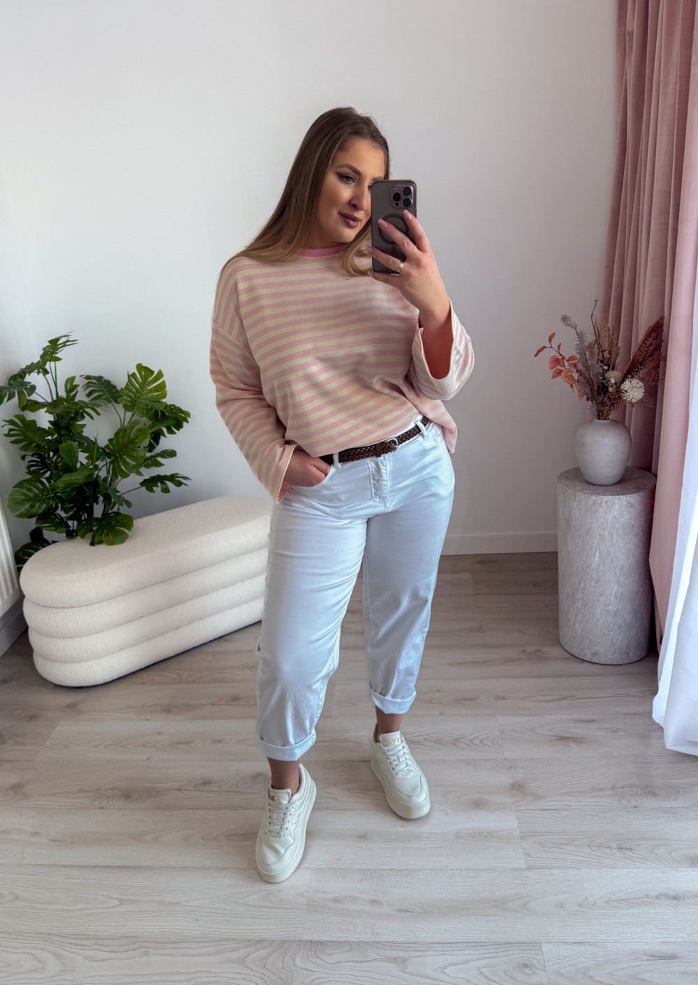 - krój mom fit pięknie podkreślający sylwetkę