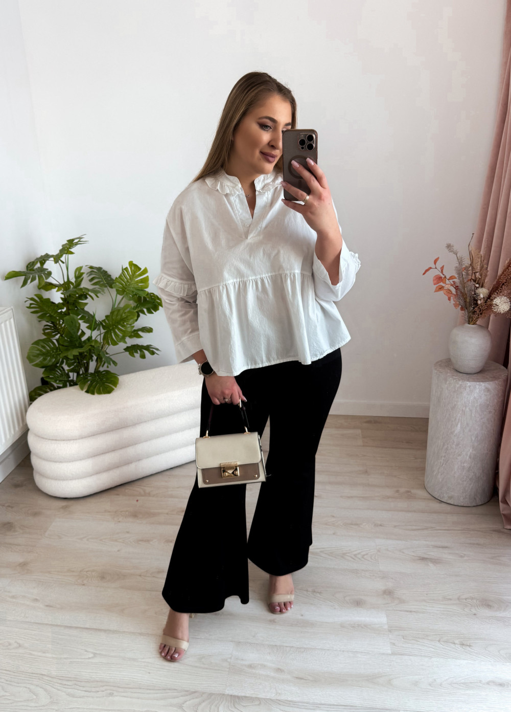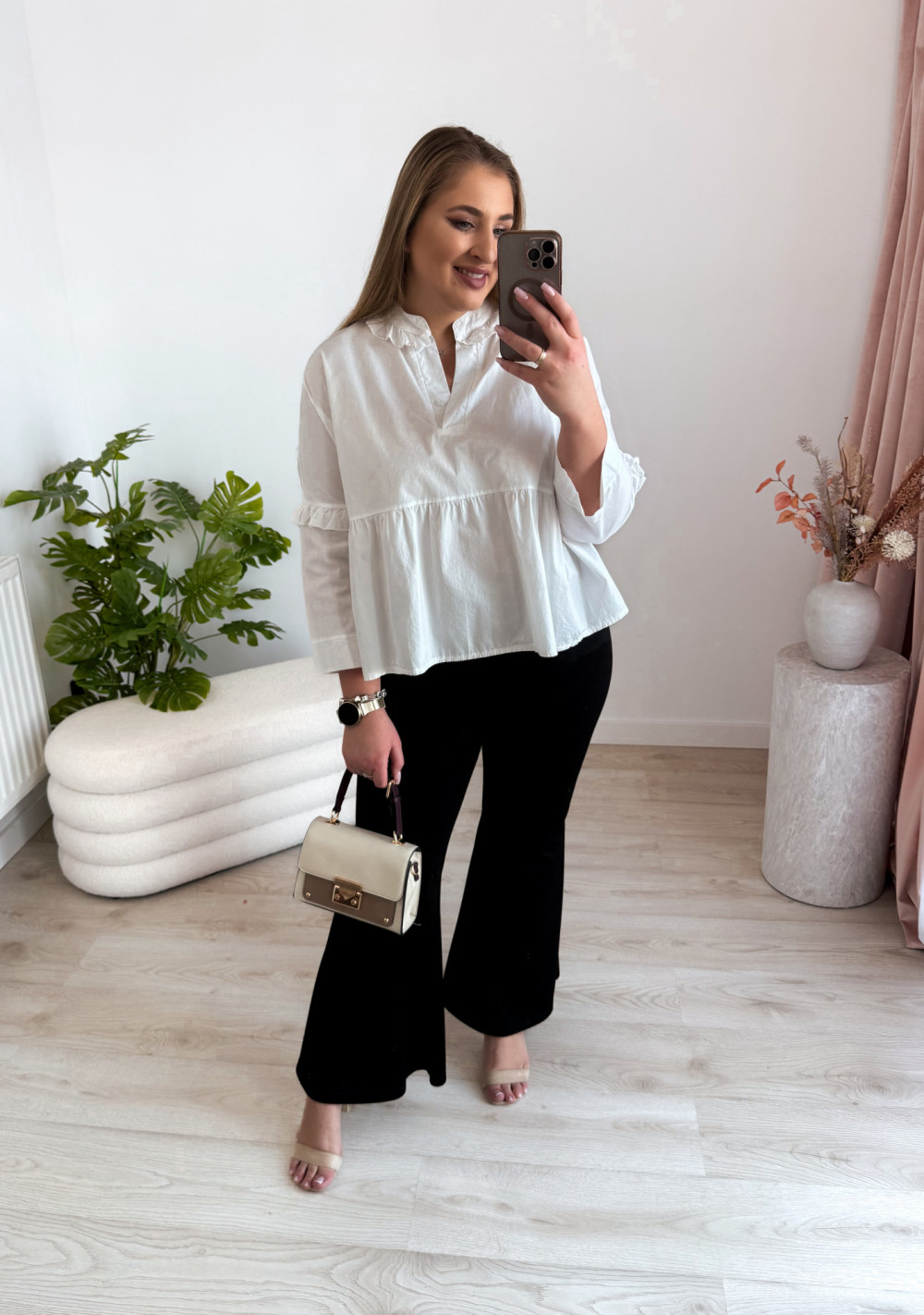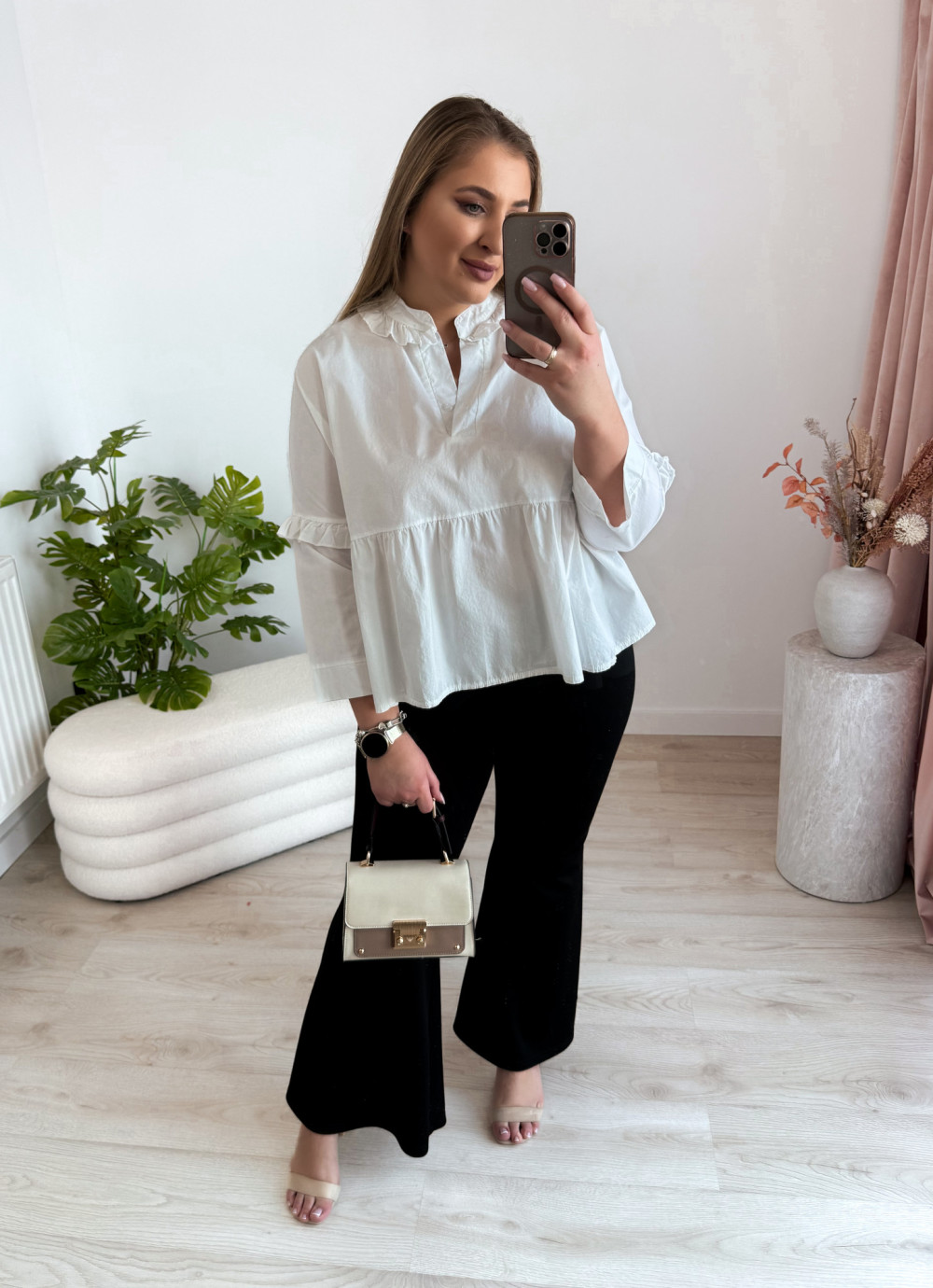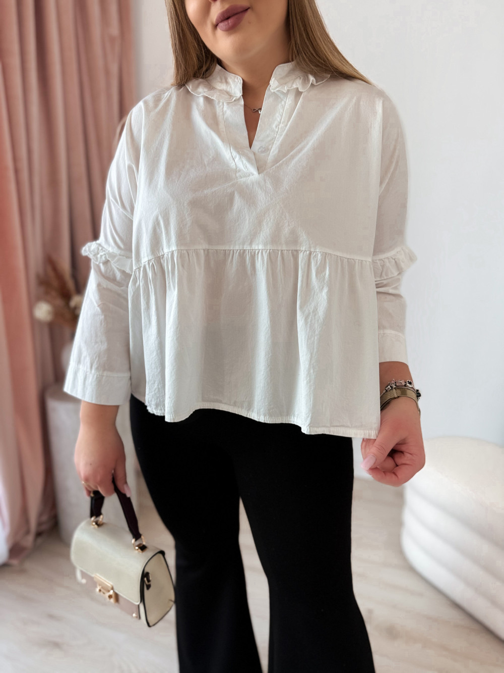 Koszula z baskinką to świetny wybór dla kobiet, które lubią połączenie wygody i kobiecego fasonu. Delikatny dekolt w kształcie litery V pięknie podkreśla szyję i dodaje lekkości całej stylizacji.