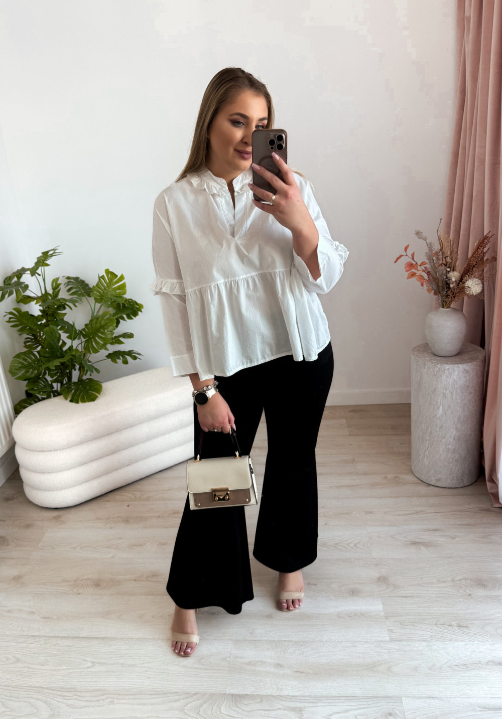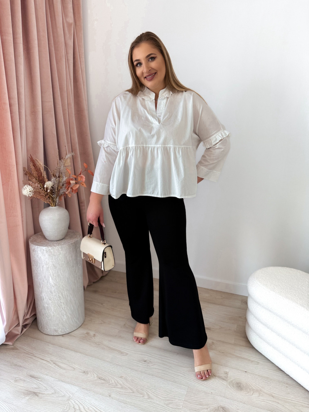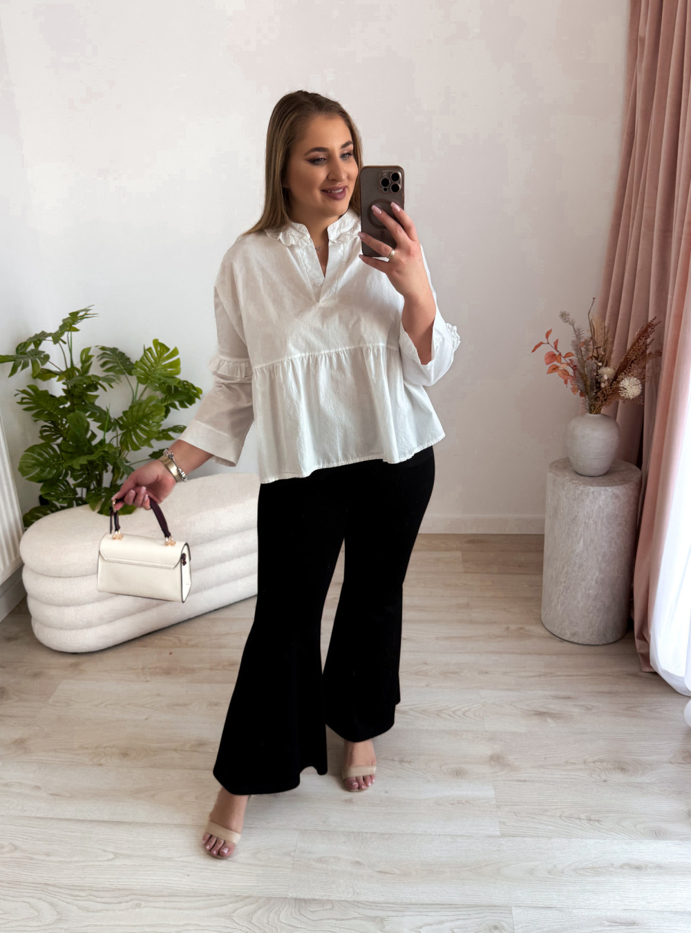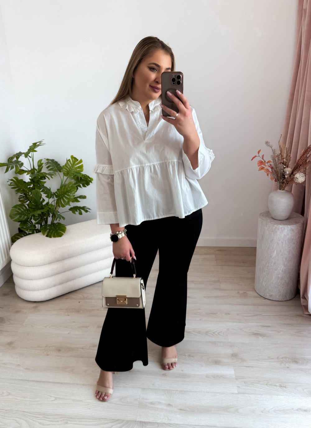 Koszula z baskinką to świetny wybór dla kobiet, które lubią połączenie wygody i kobiecego fasonu. Delikatny dekolt w kształcie litery V pięknie podkreśla szyję i dodaje lekkości całej stylizacji.