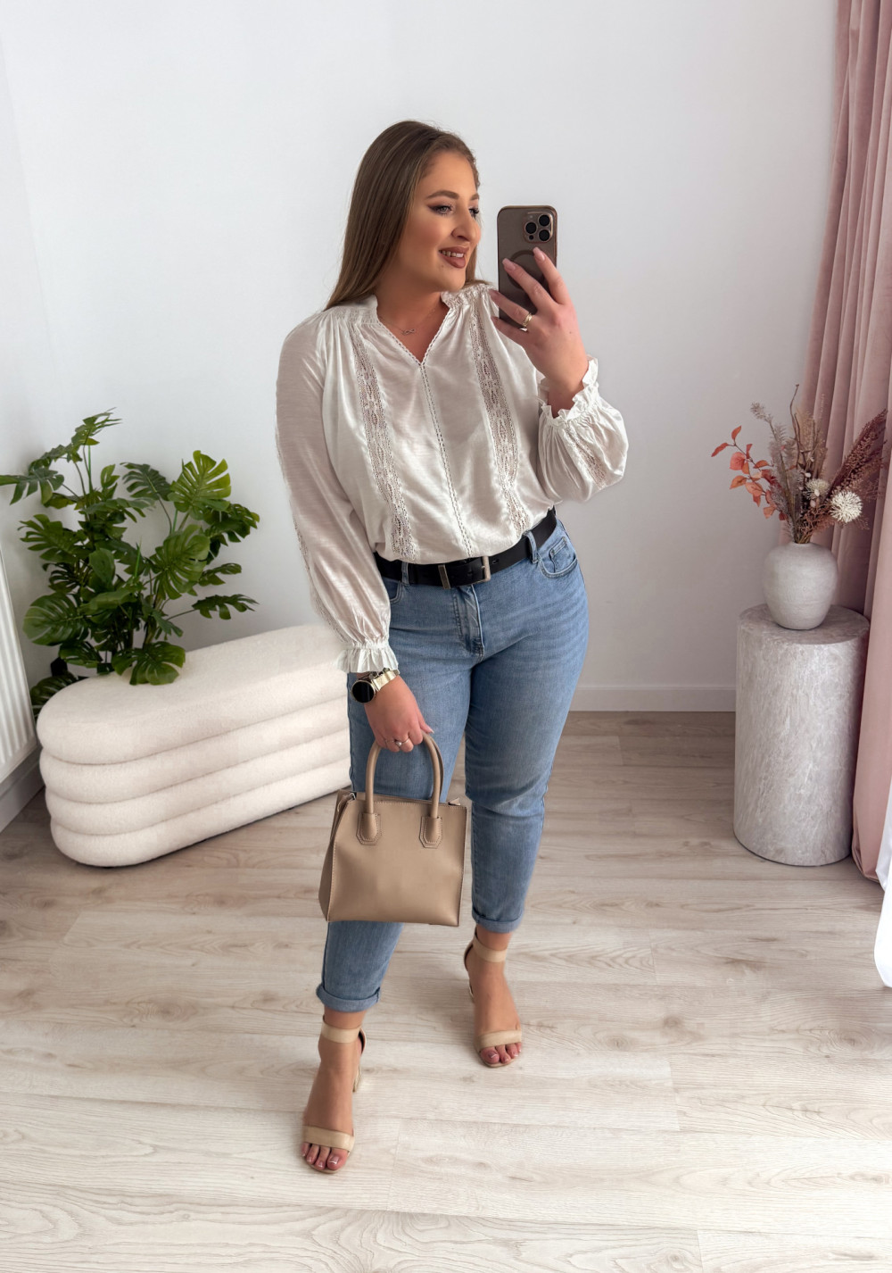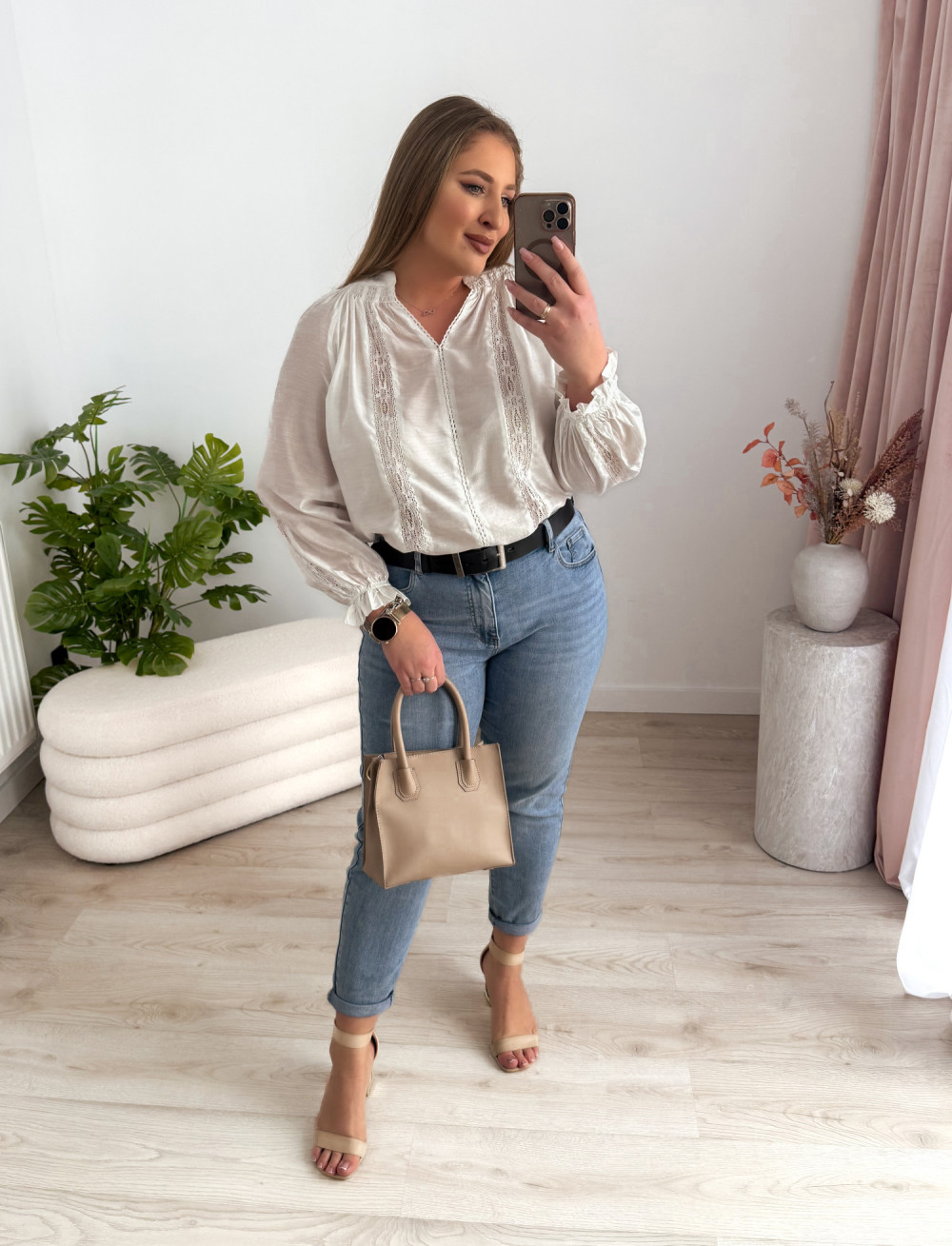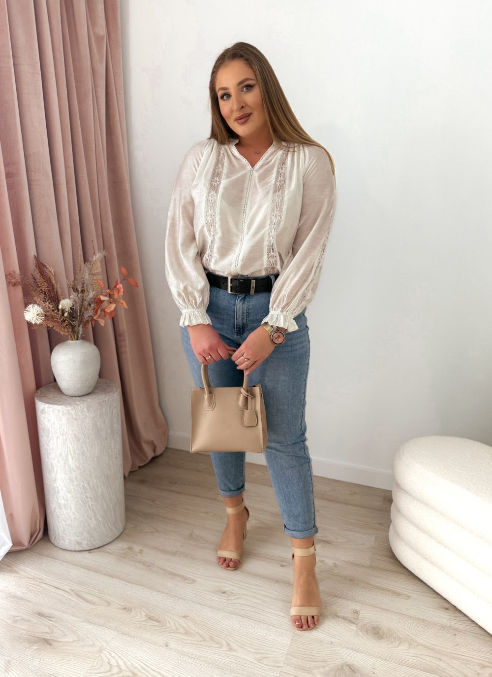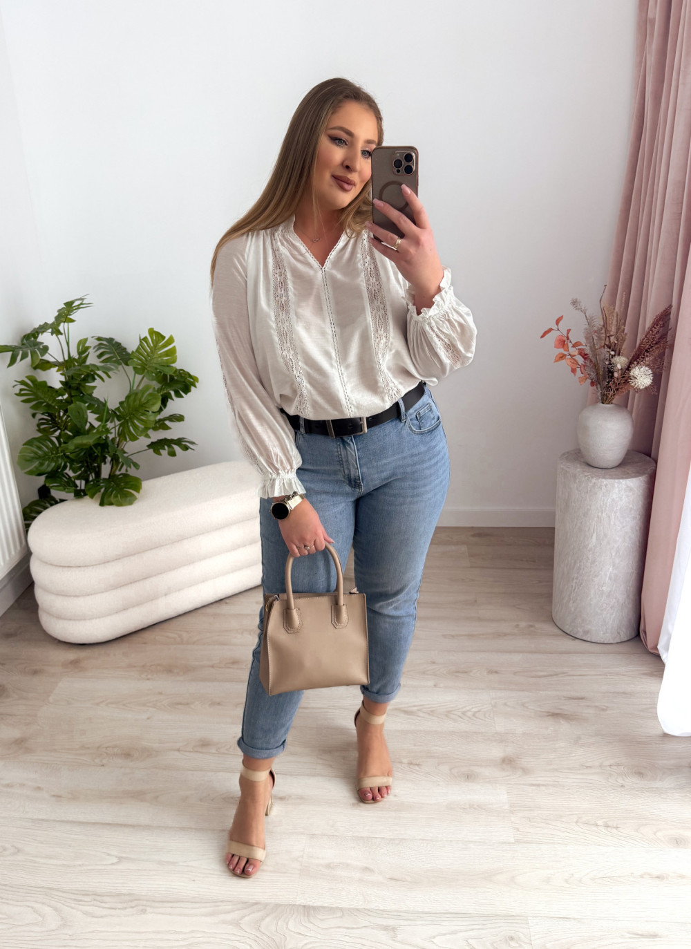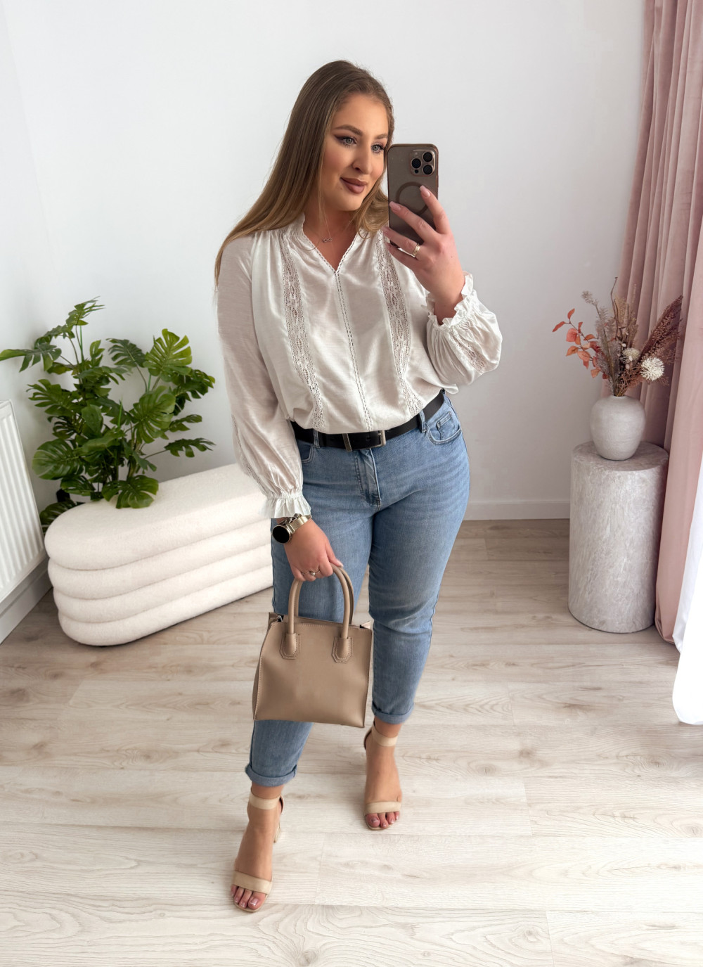 Koszula wkładana przez głowę to połączenie wygody i kobiecej subtelności. Koronkowe wstawki oraz delikatna falbanka przy rękawach dodają jej romantycznego uroku, a dekolt w kształcie litery V pięknie podkreśla szyję.