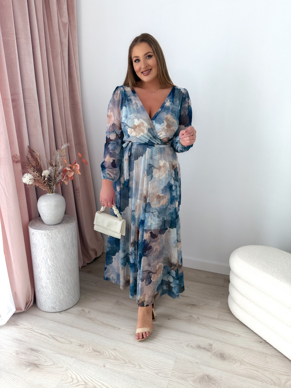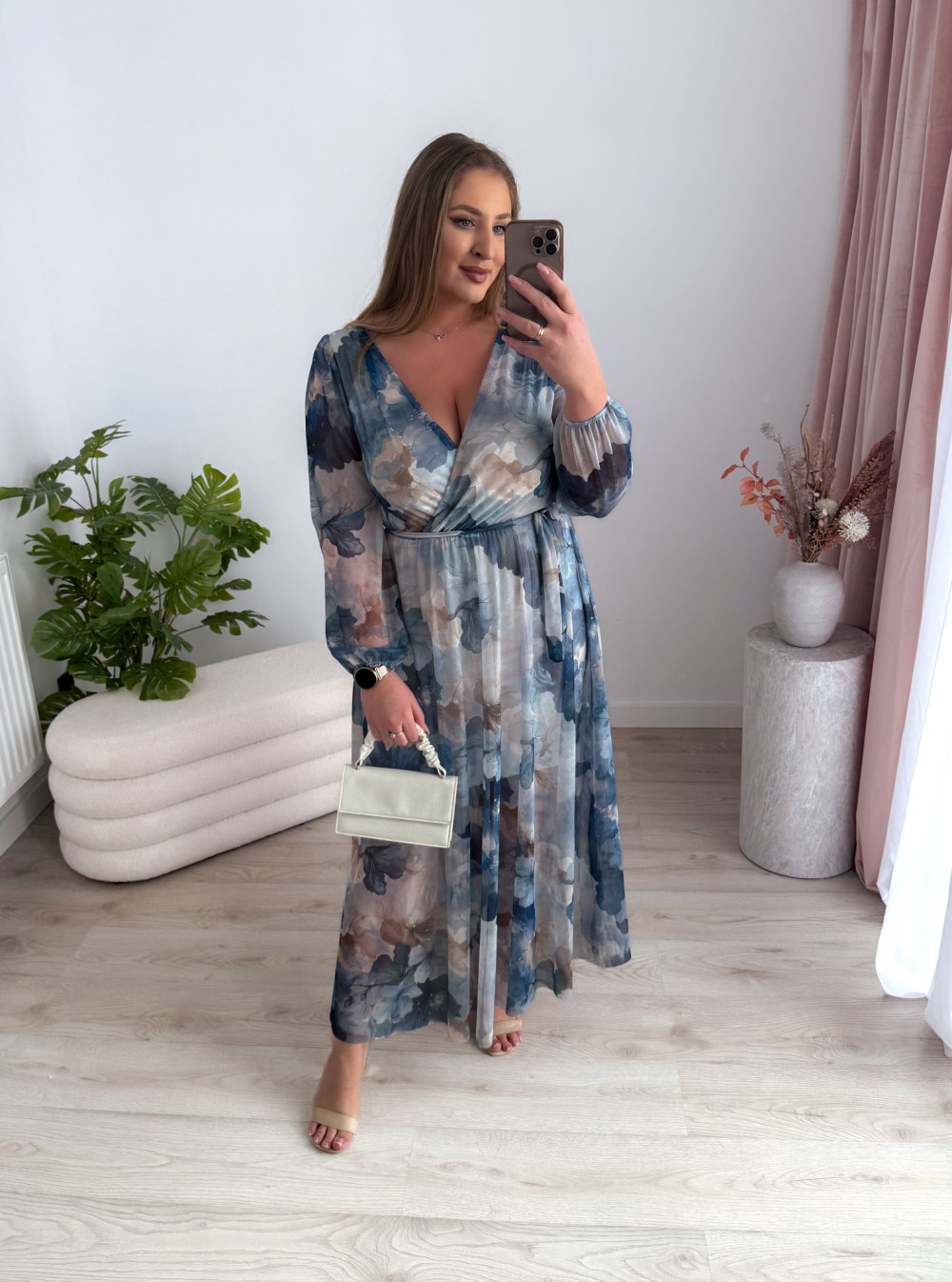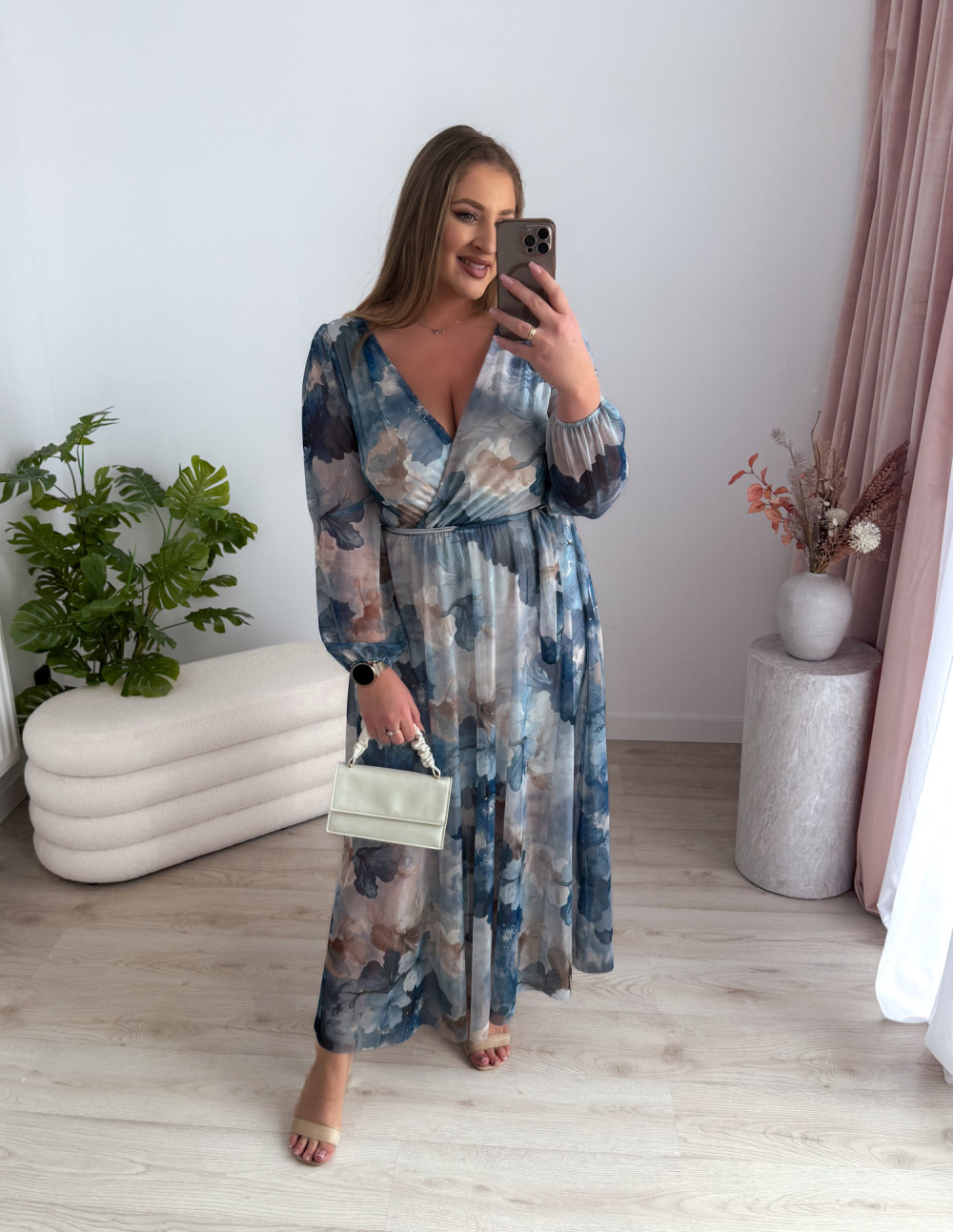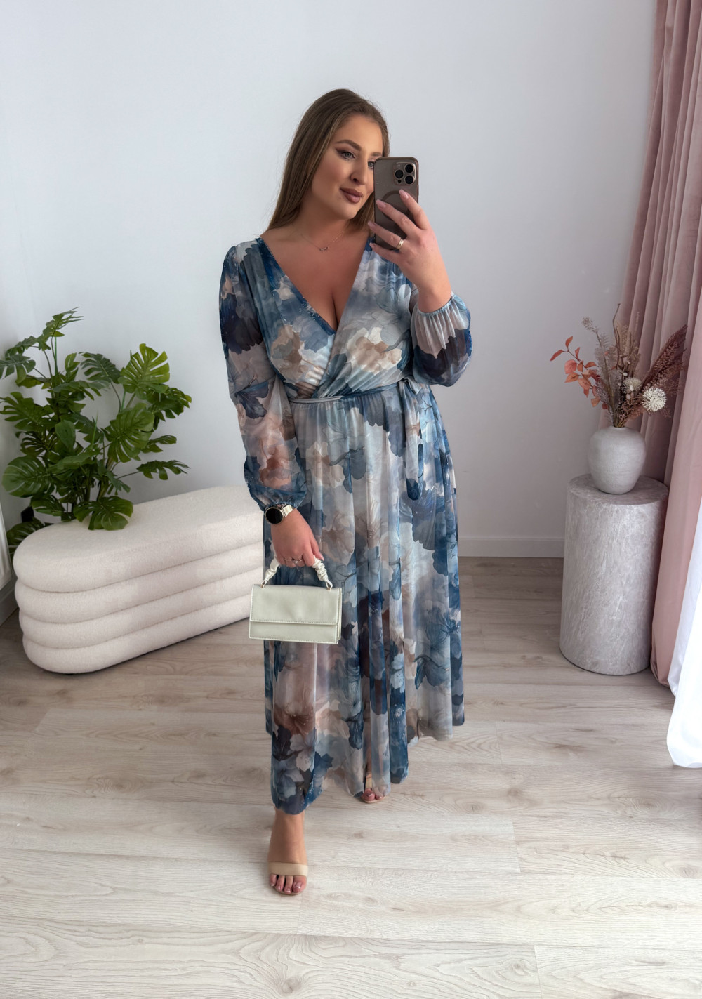 Sukienka maxi z siateczki Nella - niebiesko-beżowe kwiaty
