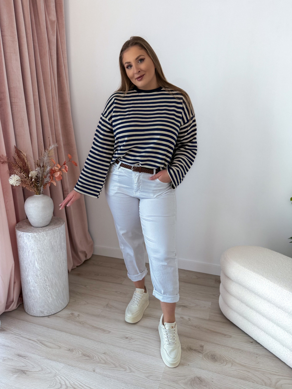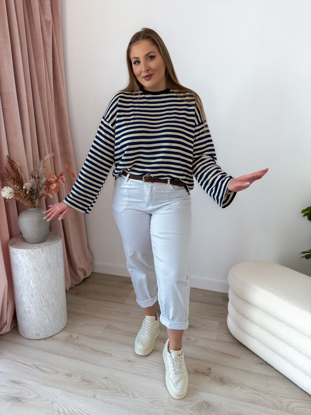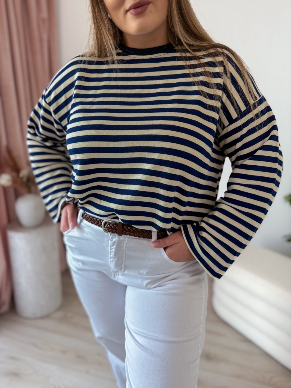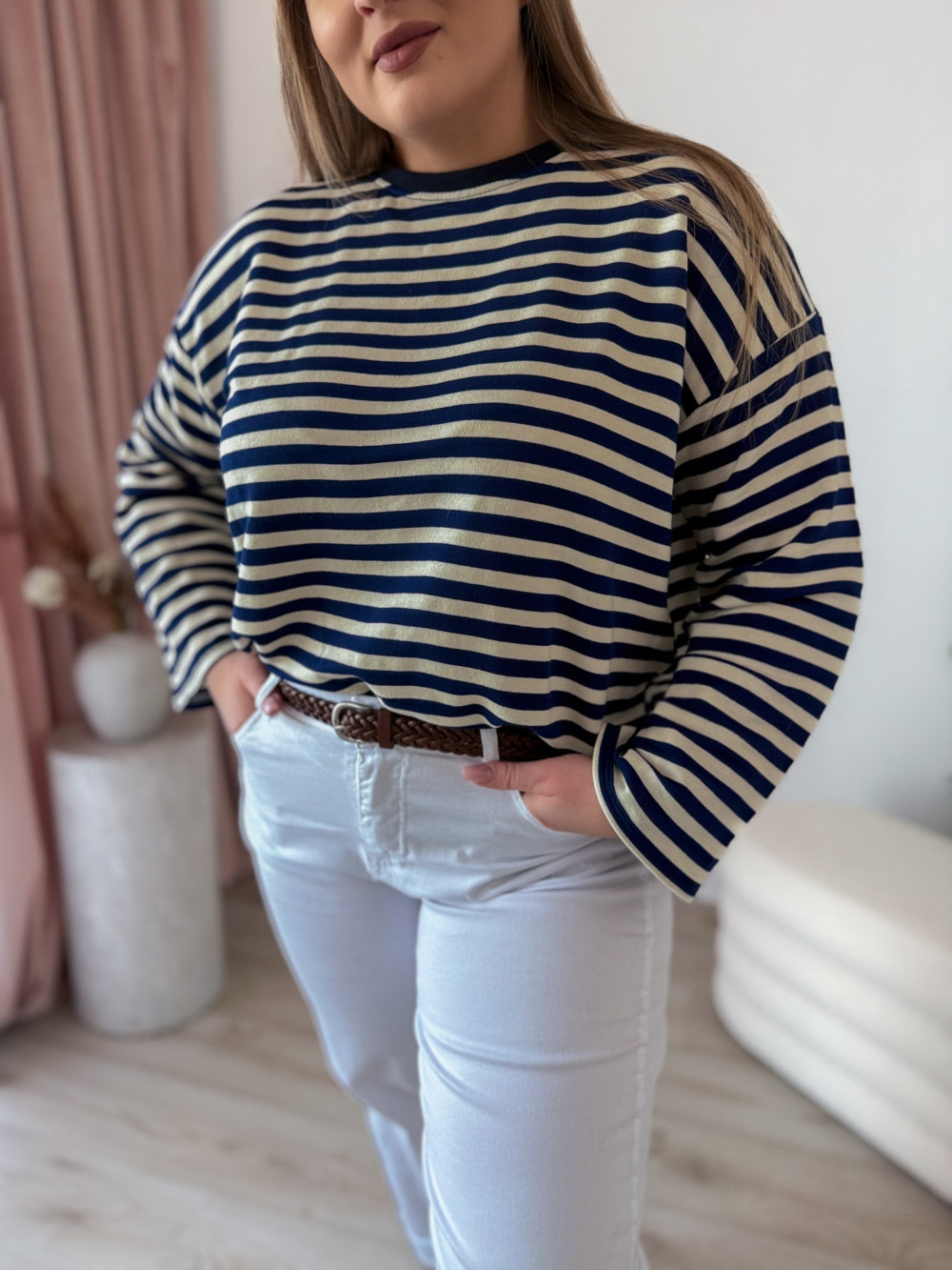 Bluza o fasonie oversize z okrągłym dekoltem to idealne połączenie wygody i modnego, swobodnego stylu. Klasyczny wzór w paski nadaje jej ponadczasowego charakteru, a długi rękaw zapewnia komfort noszenia w chłodniejsze dni. Luźny krój świetnie układa się na sylwetce i gwarantuje pełną swobodę ruchów. Bluza doskonale sprawdzi się w codziennych stylizacjach – zarówno do jeansów, jak i legginsów czy spodni dresowych.