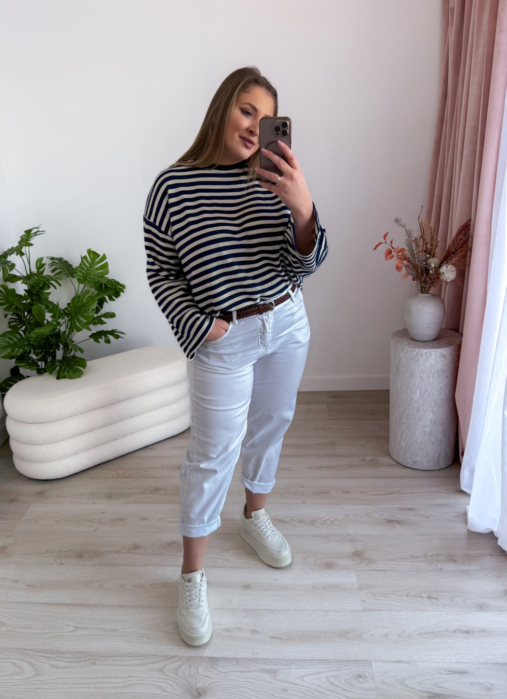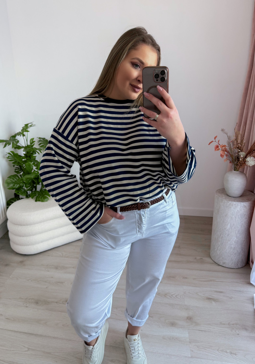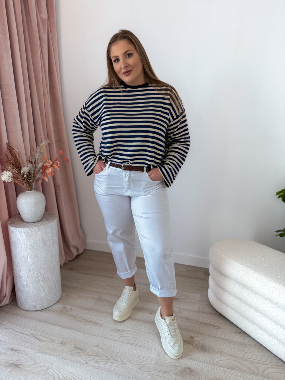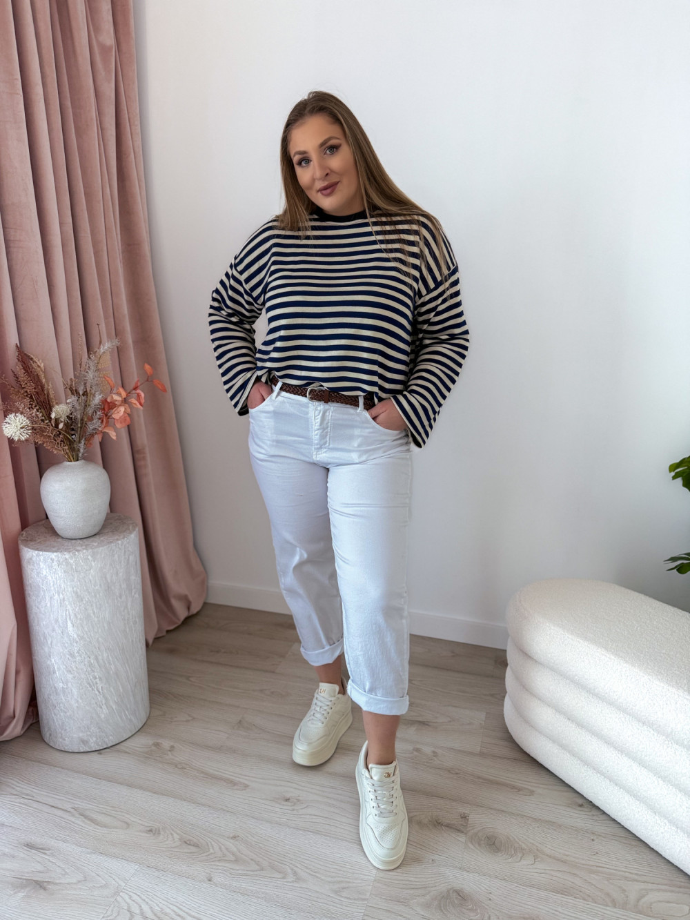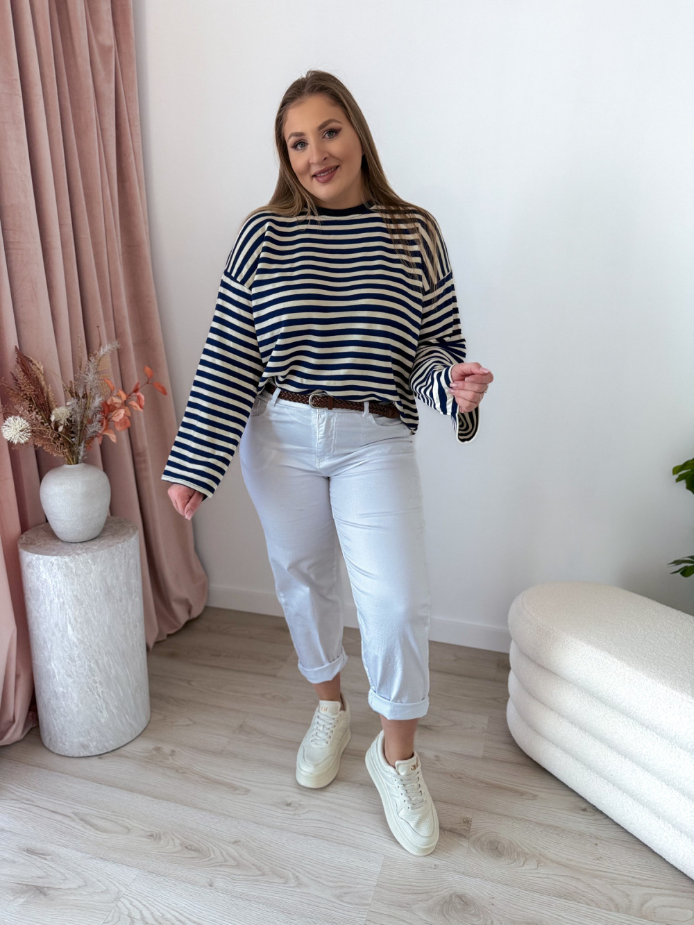 Bluza o fasonie oversize z okrągłym dekoltem to idealne połączenie wygody i modnego, swobodnego stylu. Klasyczny wzór w paski nadaje jej ponadczasowego charakteru, a długi rękaw zapewnia komfort noszenia w chłodniejsze dni. Luźny krój świetnie układa się na sylwetce i gwarantuje pełną swobodę ruchów. Bluza doskonale sprawdzi się w codziennych stylizacjach – zarówno do jeansów, jak i legginsów czy spodni dresowych.