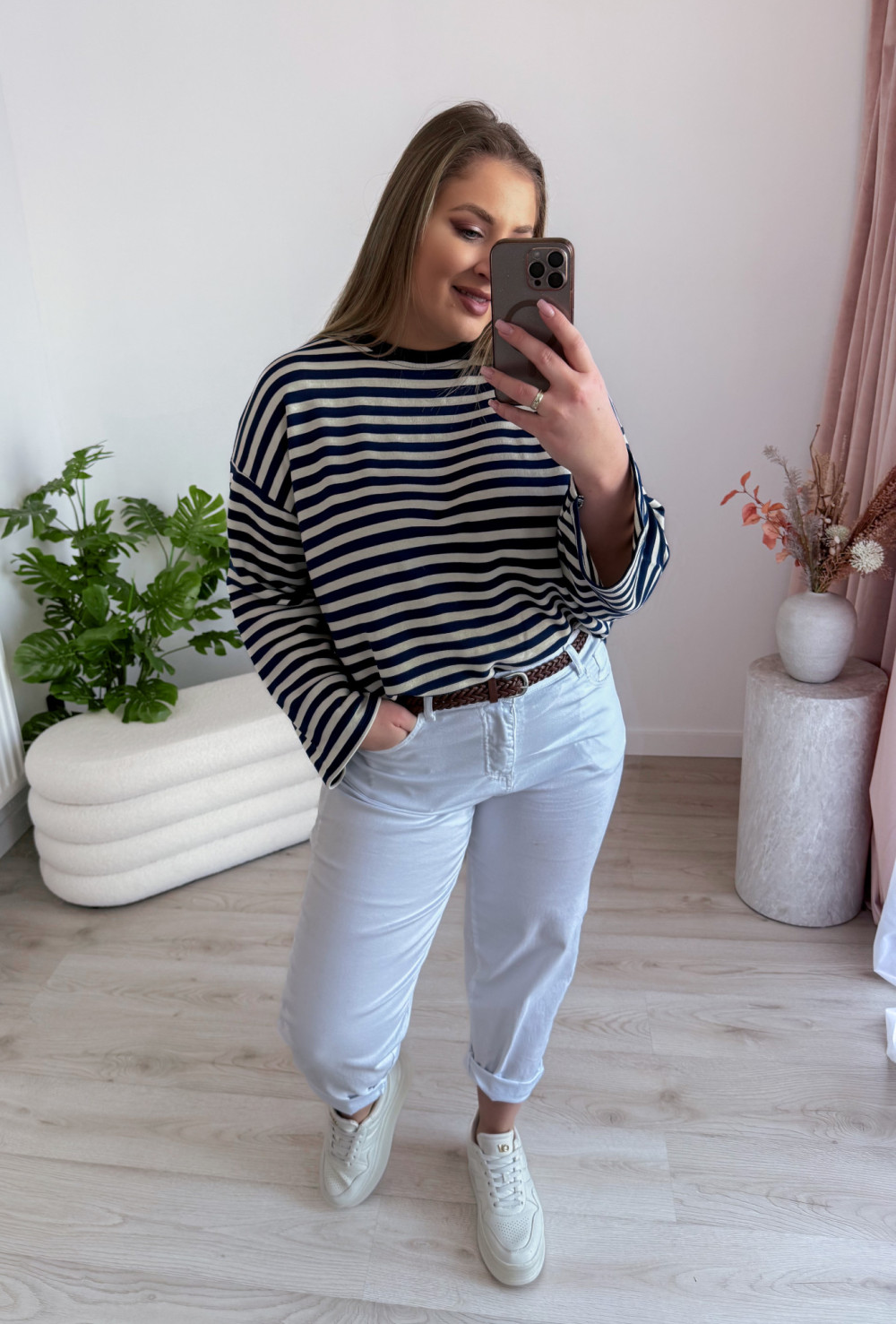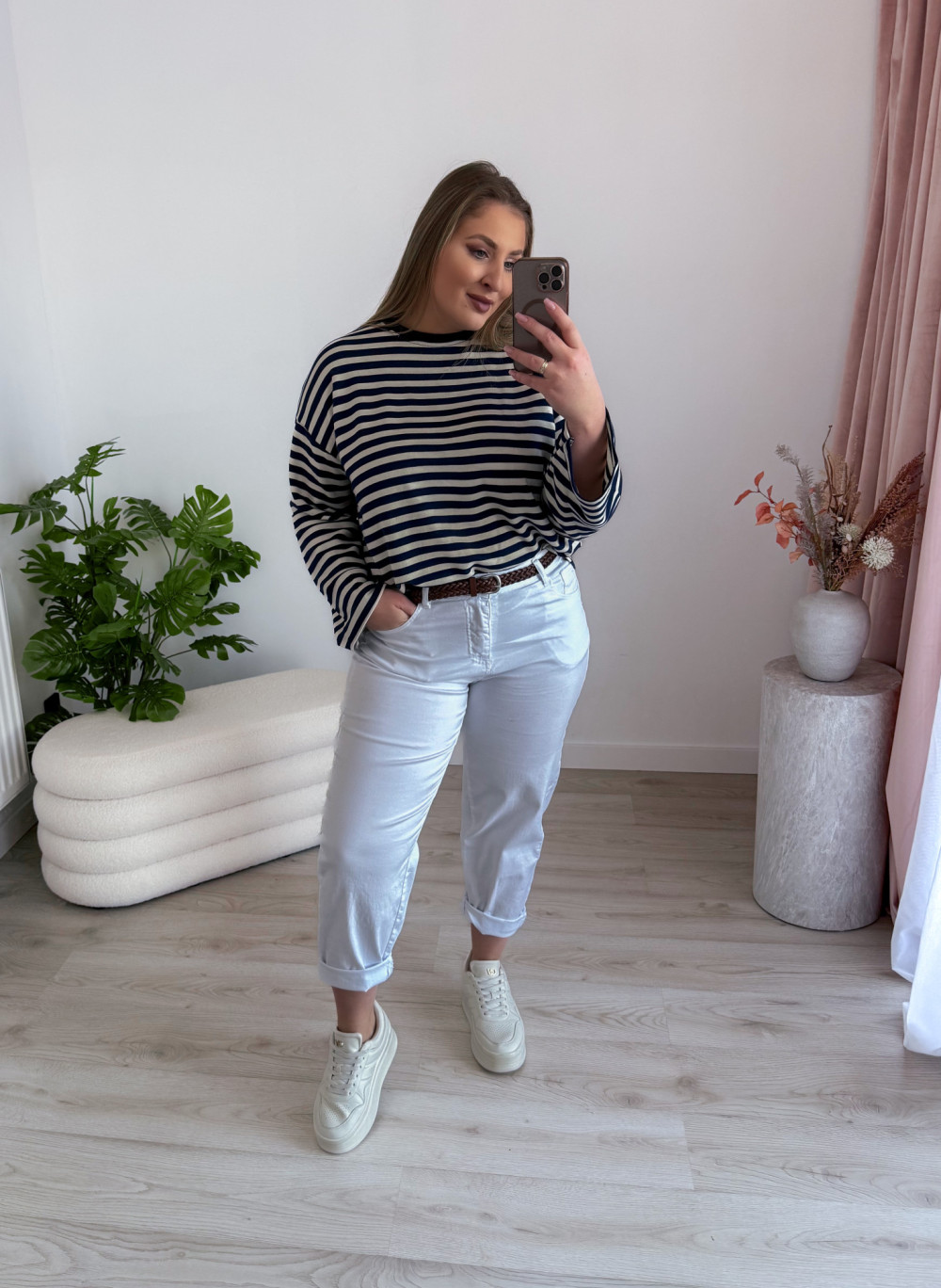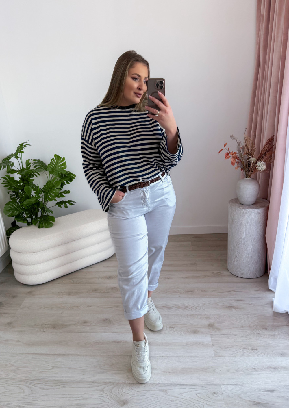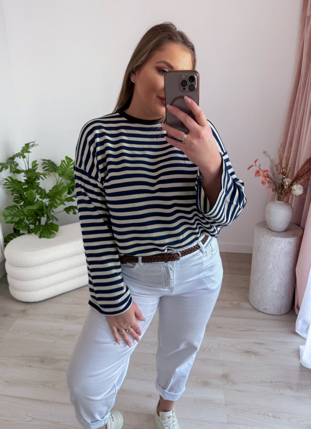 Bluza o fasonie oversize z okrągłym dekoltem to idealne połączenie wygody i modnego, swobodnego stylu. Klasyczny wzór w paski nadaje jej ponadczasowego charakteru, a długi rękaw zapewnia komfort noszenia w chłodniejsze dni. Luźny krój świetnie układa się na sylwetce i gwarantuje pełną swobodę ruchów. Bluza doskonale sprawdzi się w codziennych stylizacjach – zarówno do jeansów, jak i legginsów czy spodni dresowych.