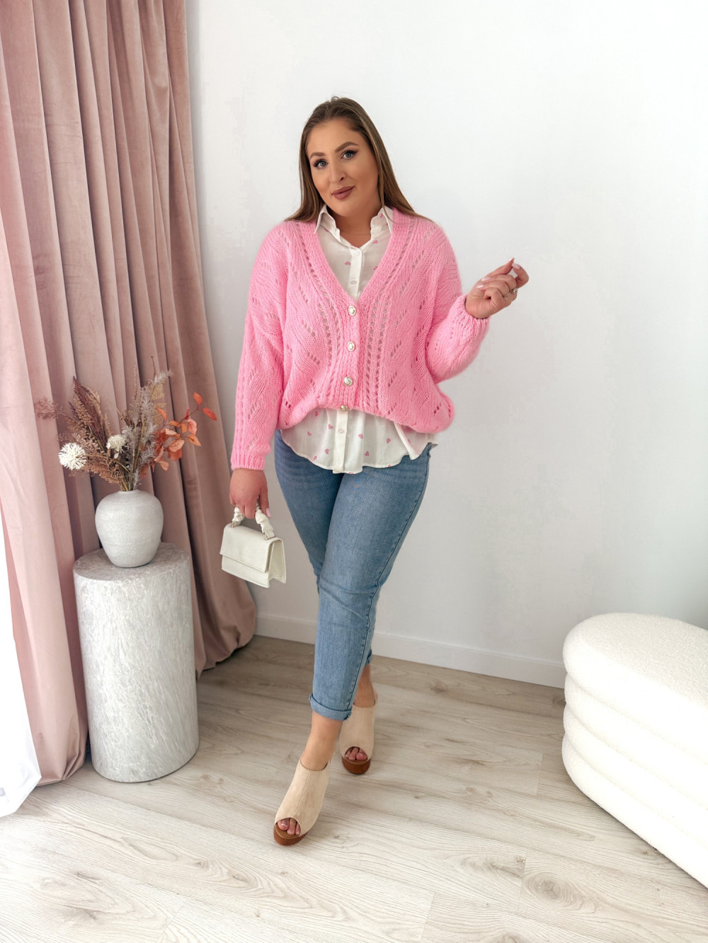 Oversizowa koszula z 100% wiskozy to doskonała propozycja dla kobiet, które stawiają na wygodę i naturalne materiały. Uroczy wzór w różowe serduszka dodaje jej dziewczęcego charakteru i wyróżnia ją na tle klasycznych modeli.