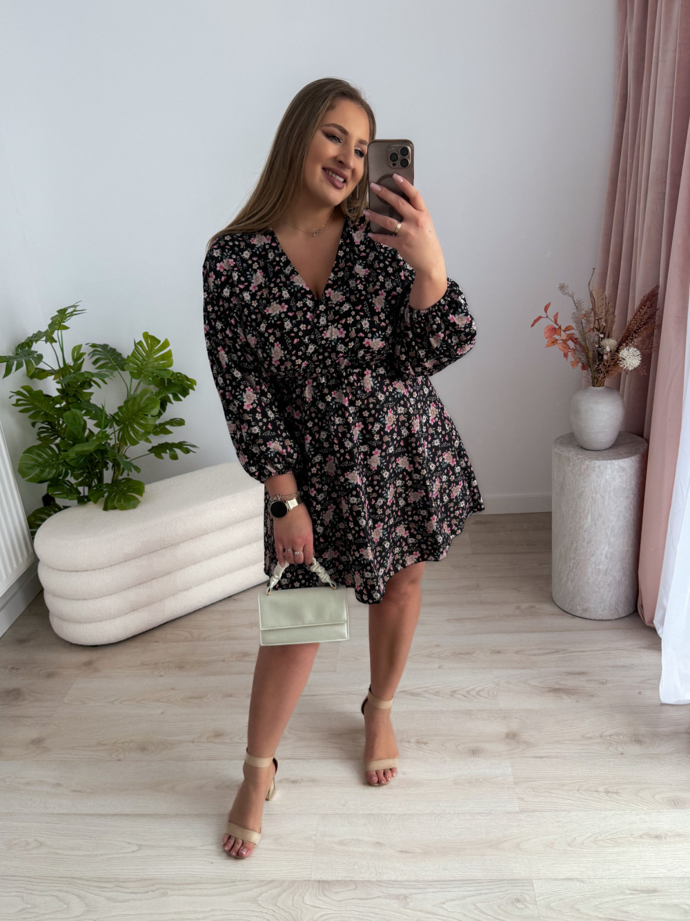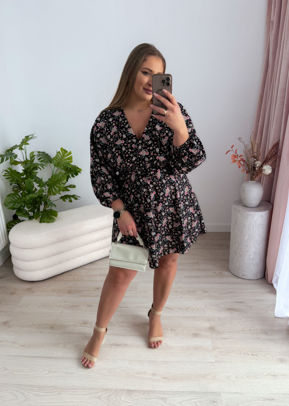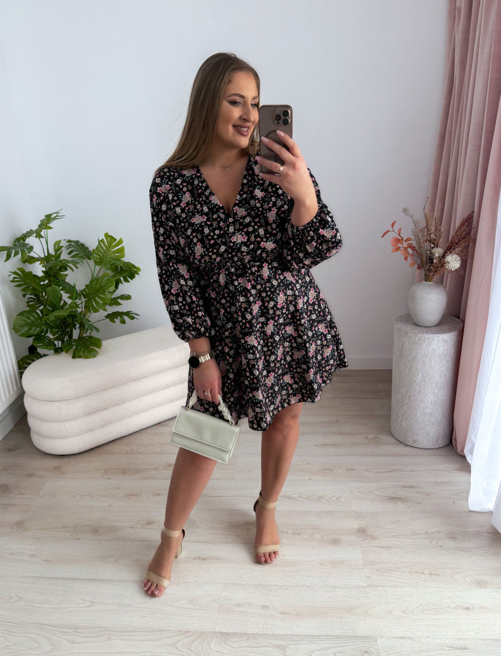 Sukienka krótka w różowe kwiatki Terra - czarna