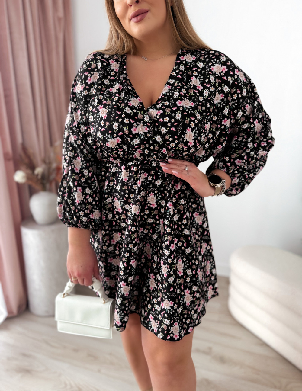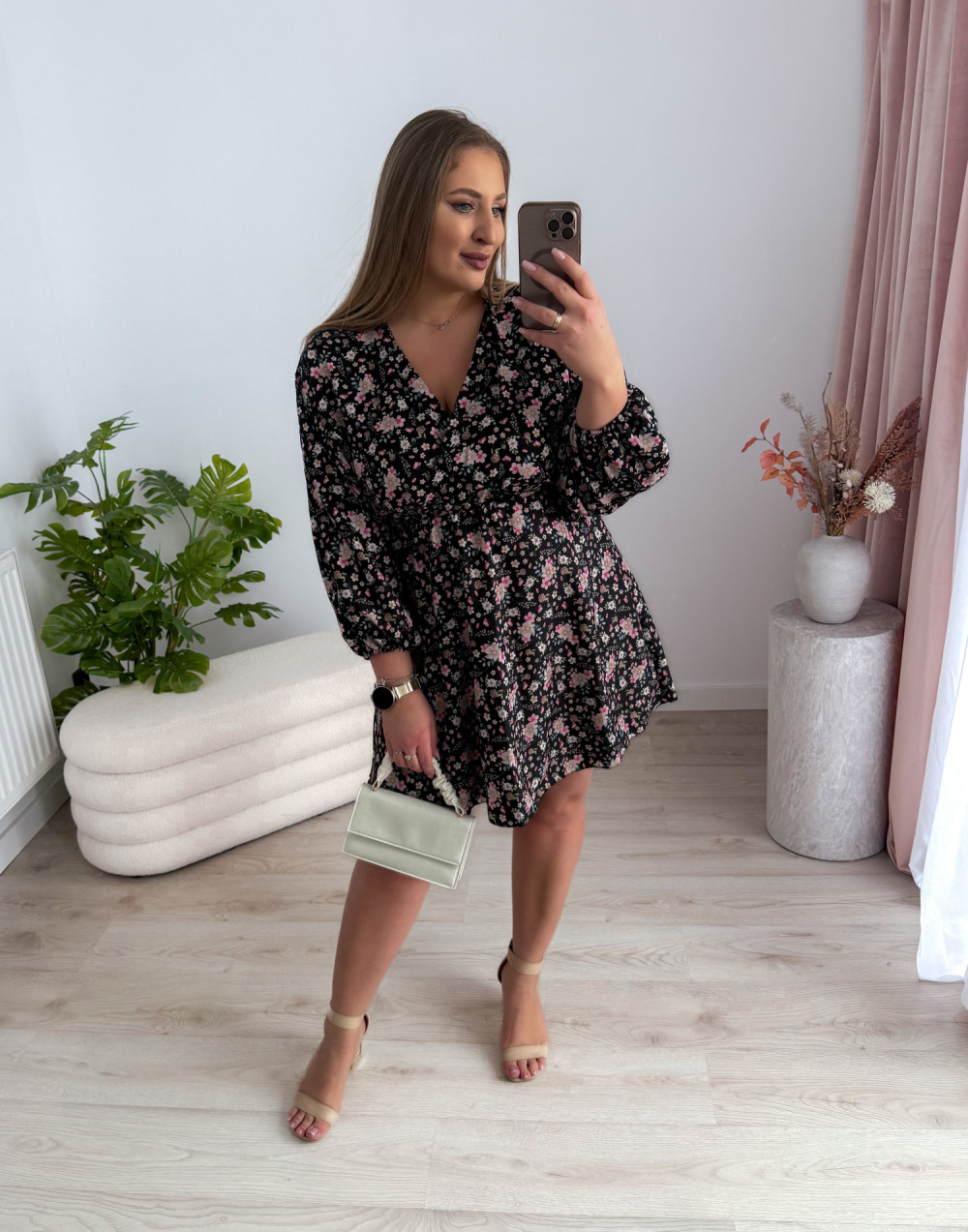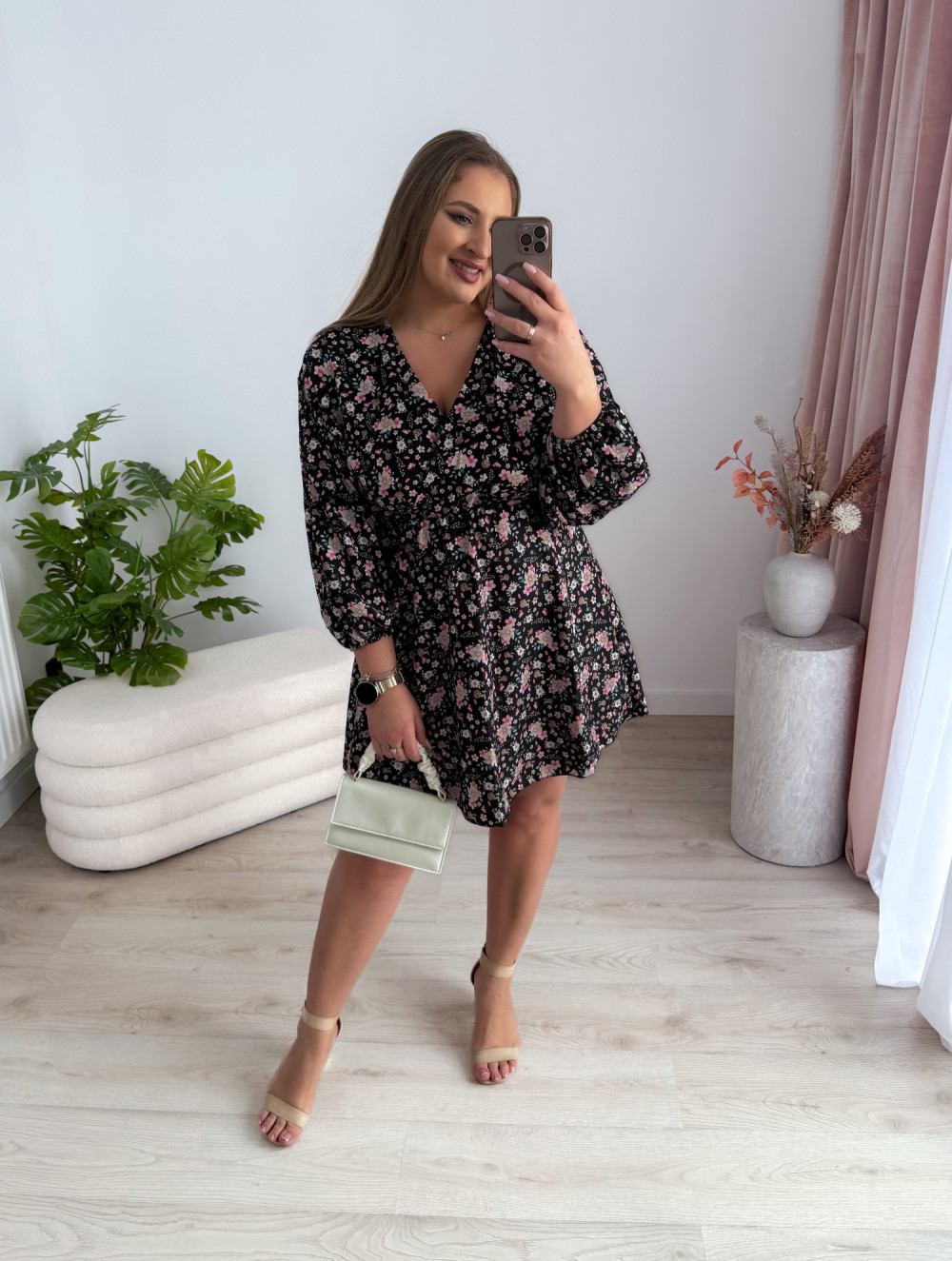 Sukienka krótka w różowe kwiatki Terra - czarna