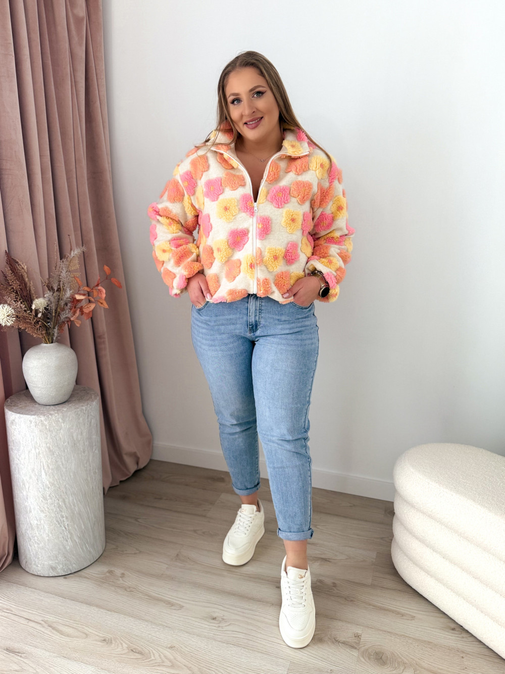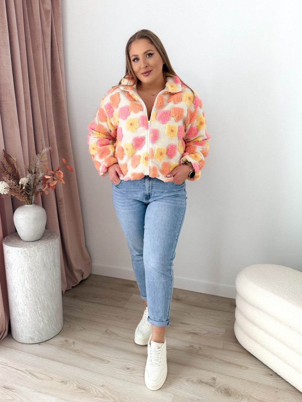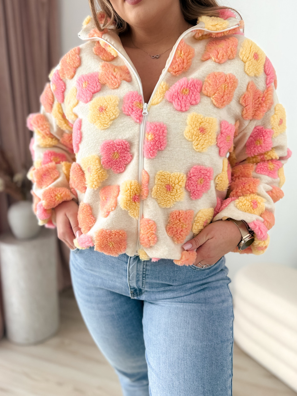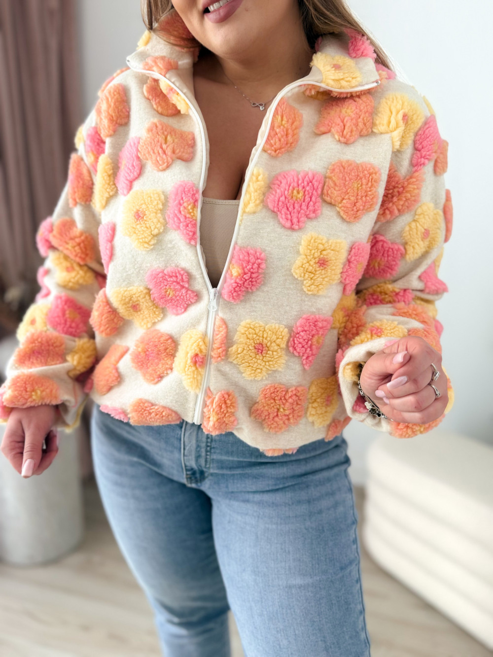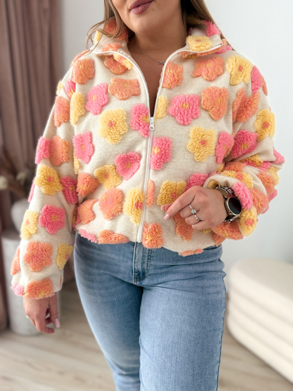 Ten miękki polar na zamek zachwyca uroczym charakterem i przyjemną w dotyku, pluszową fakturą. Ozdobne kwiatki w odcieniach różu, żółci i pomarańczu dodają mu ciepła oraz dziewczęcego uroku.