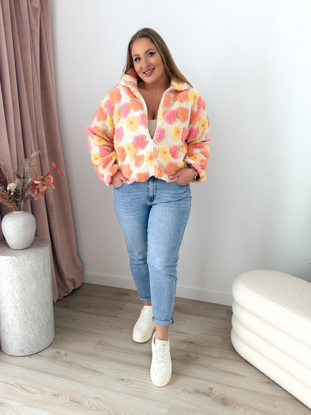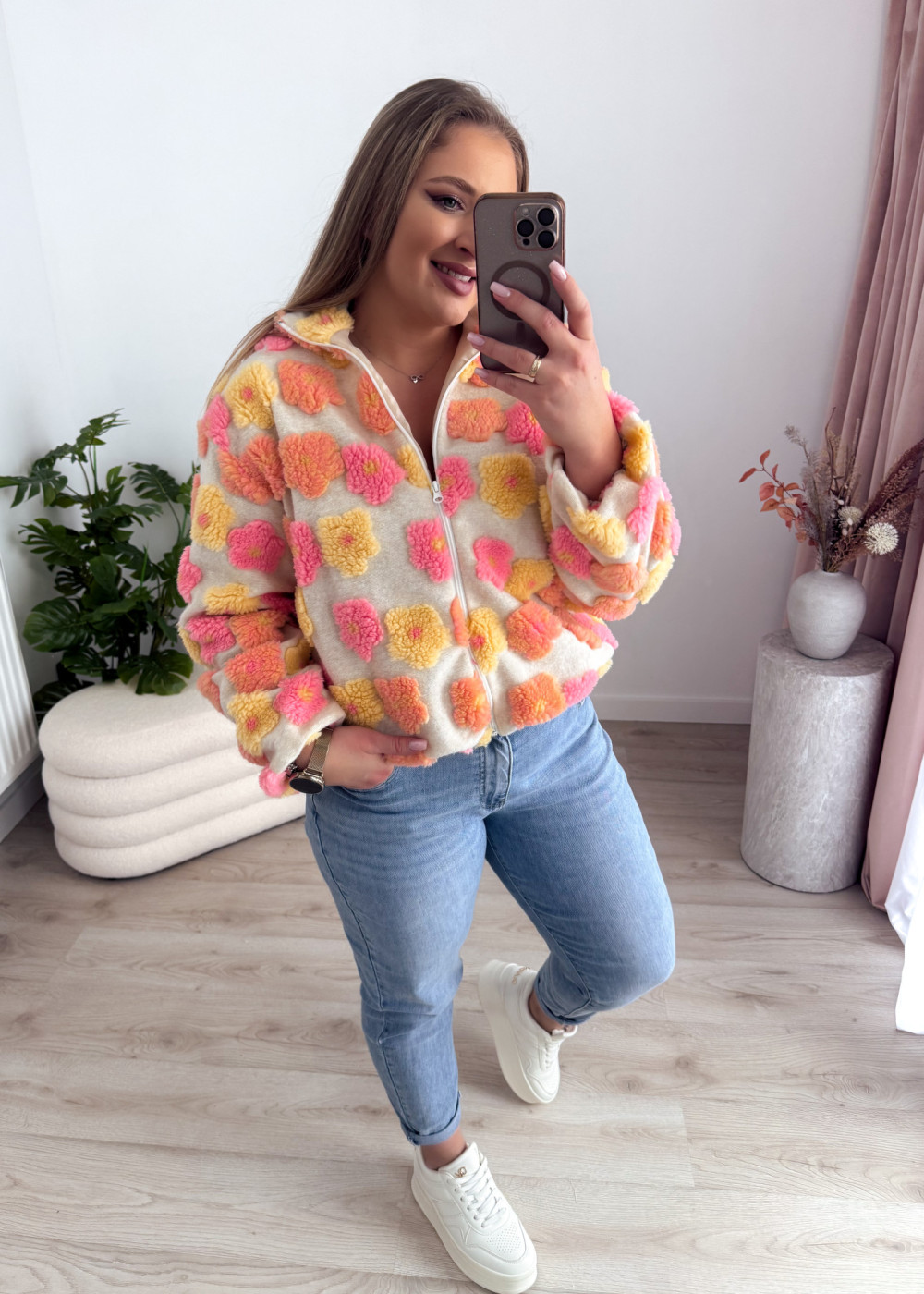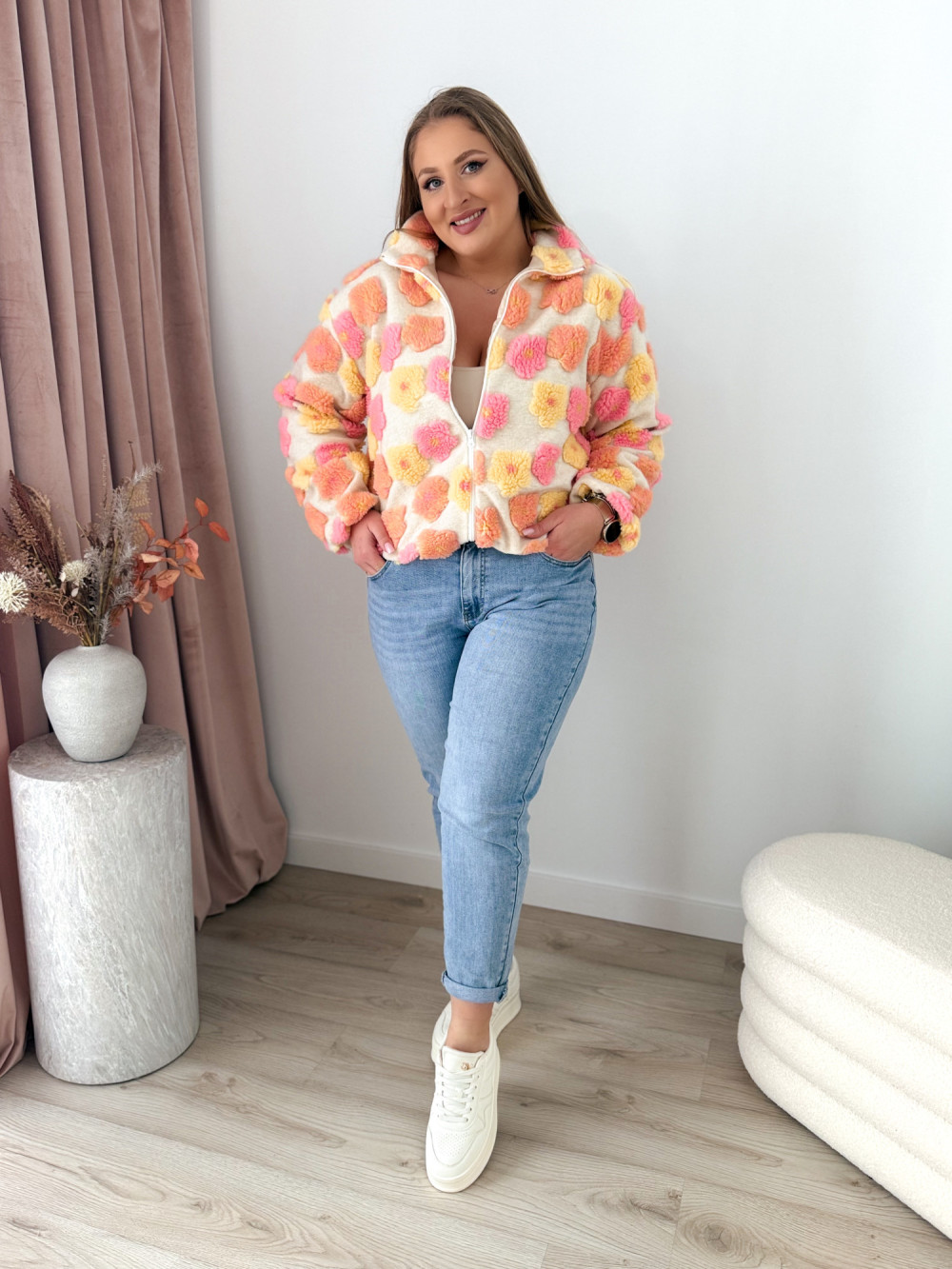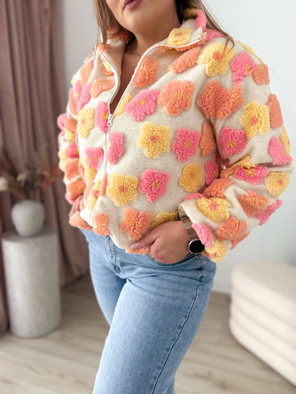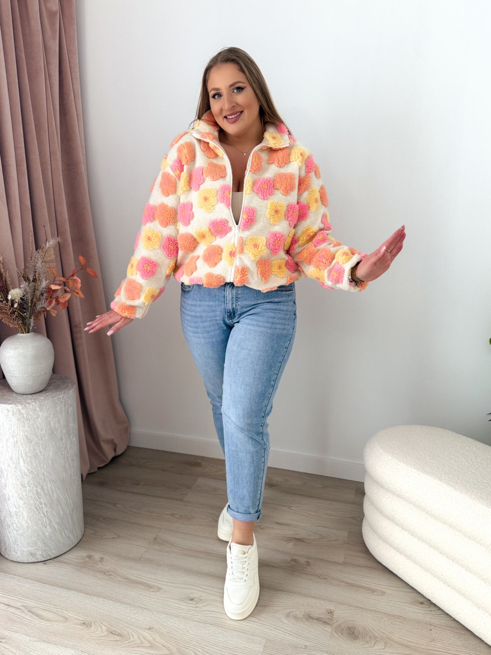Ten miękki polar na zamek zachwyca uroczym charakterem i przyjemną w dotyku, pluszową fakturą. Ozdobne kwiatki w odcieniach różu, żółci i pomarańczu dodają mu ciepła oraz dziewczęcego uroku.