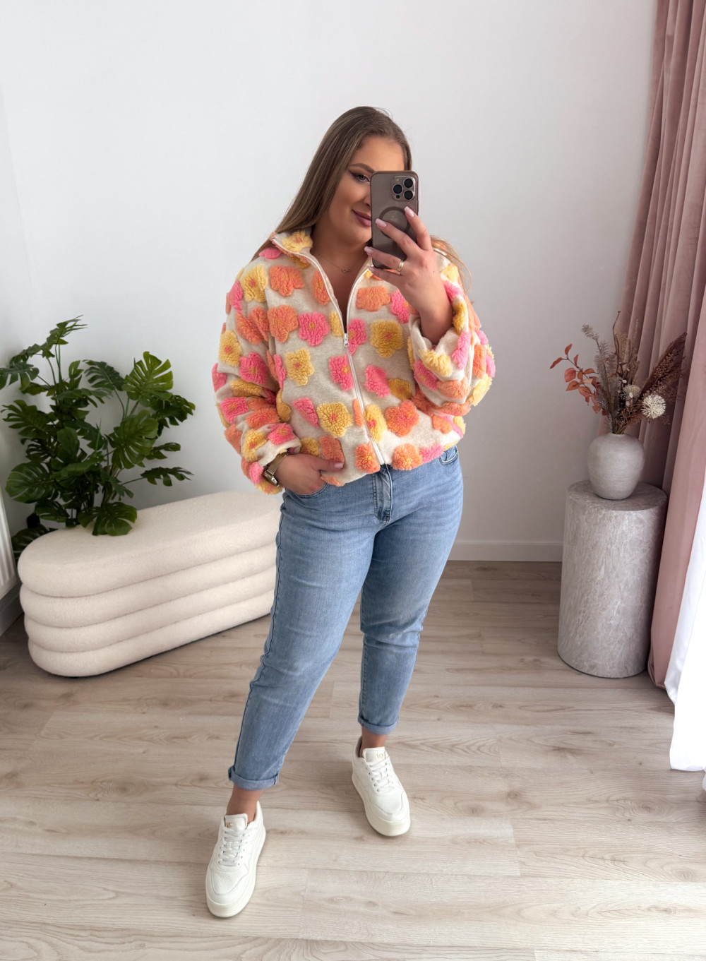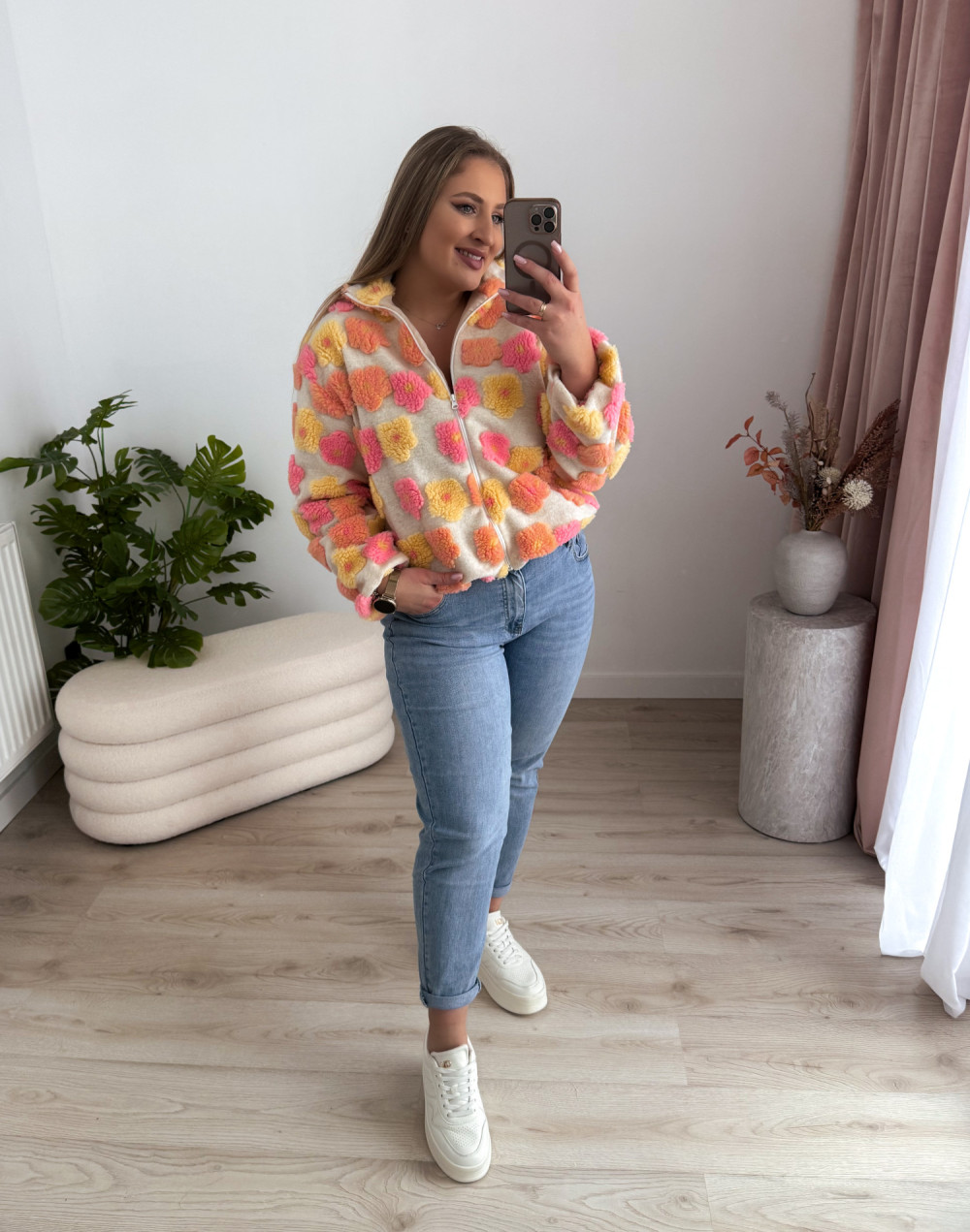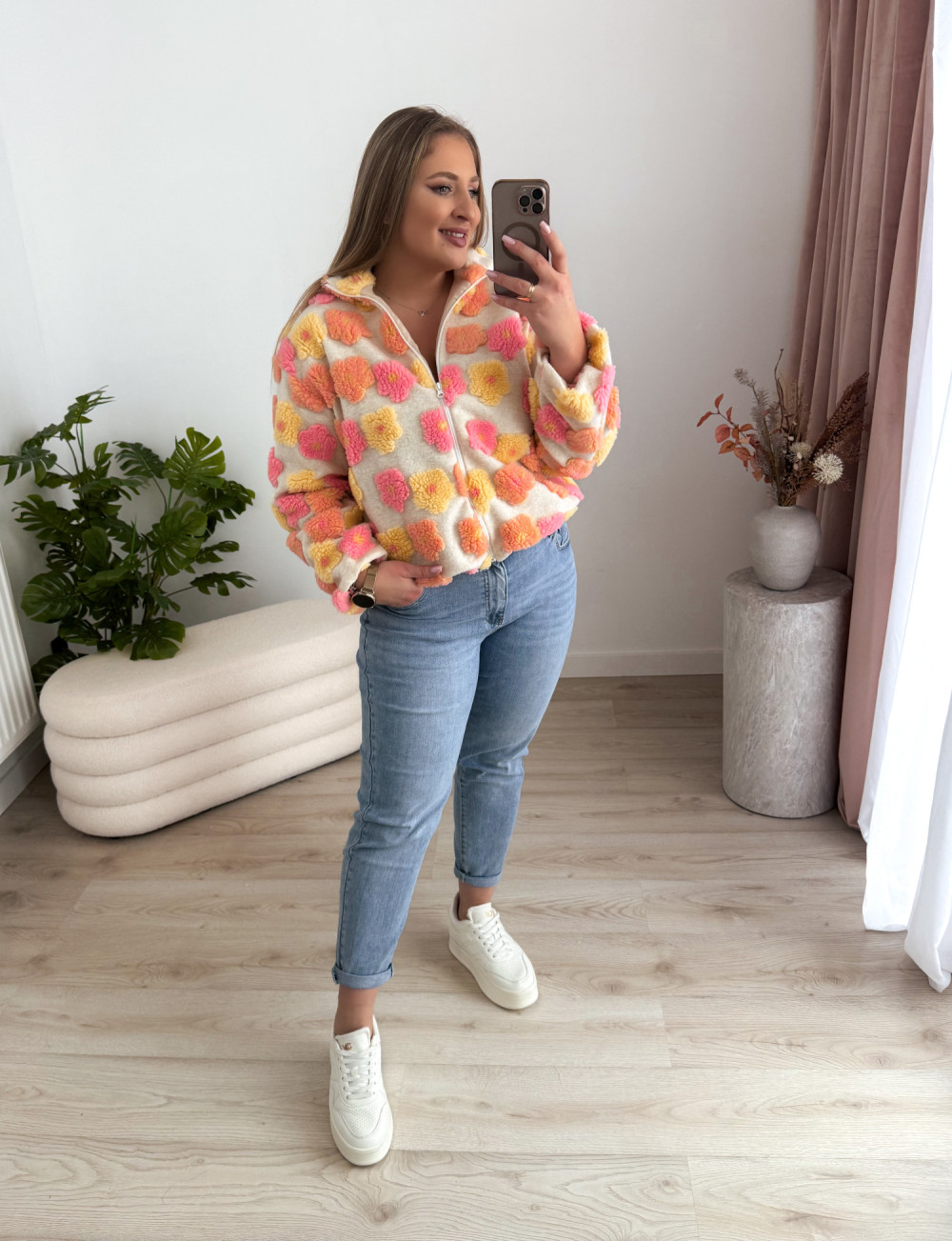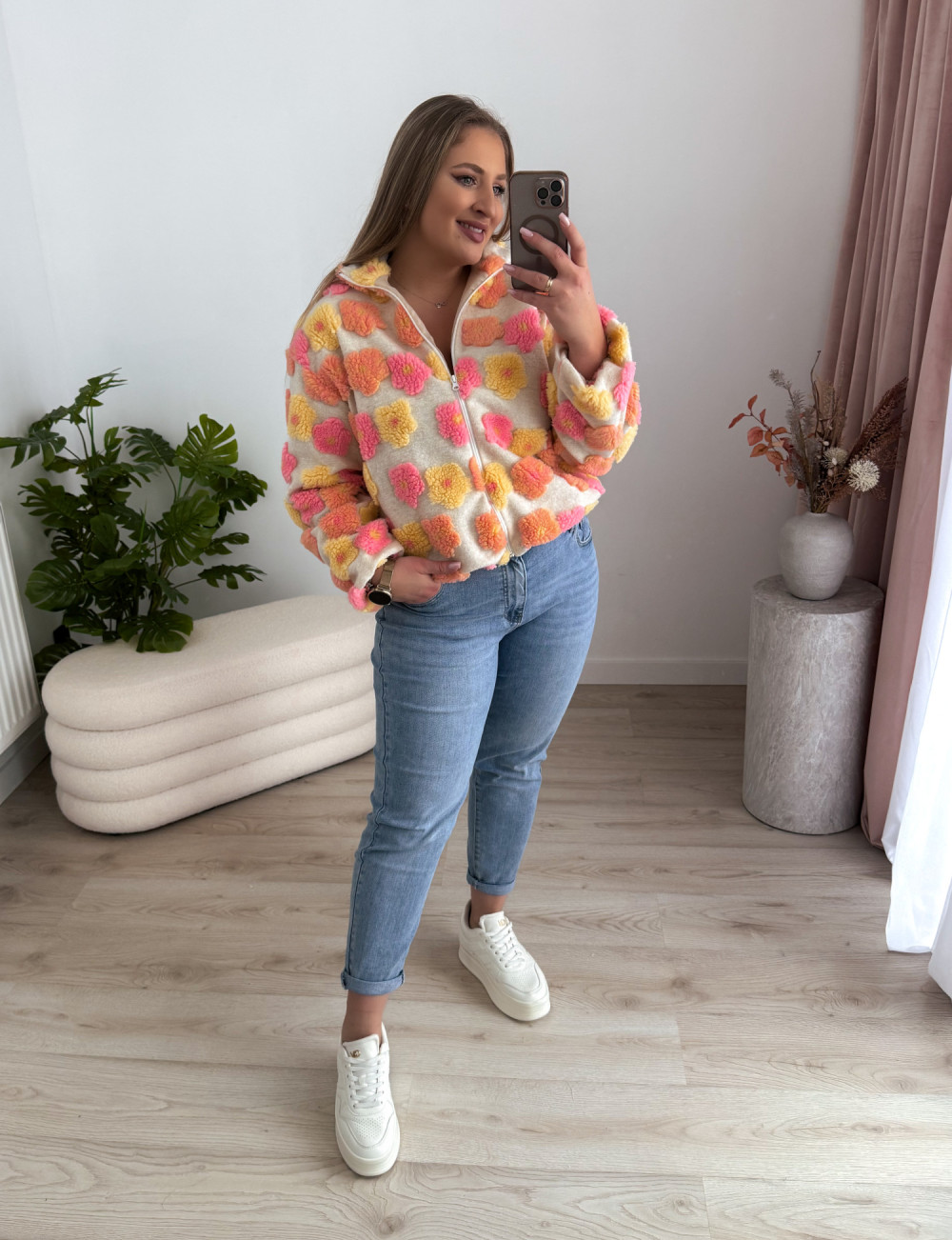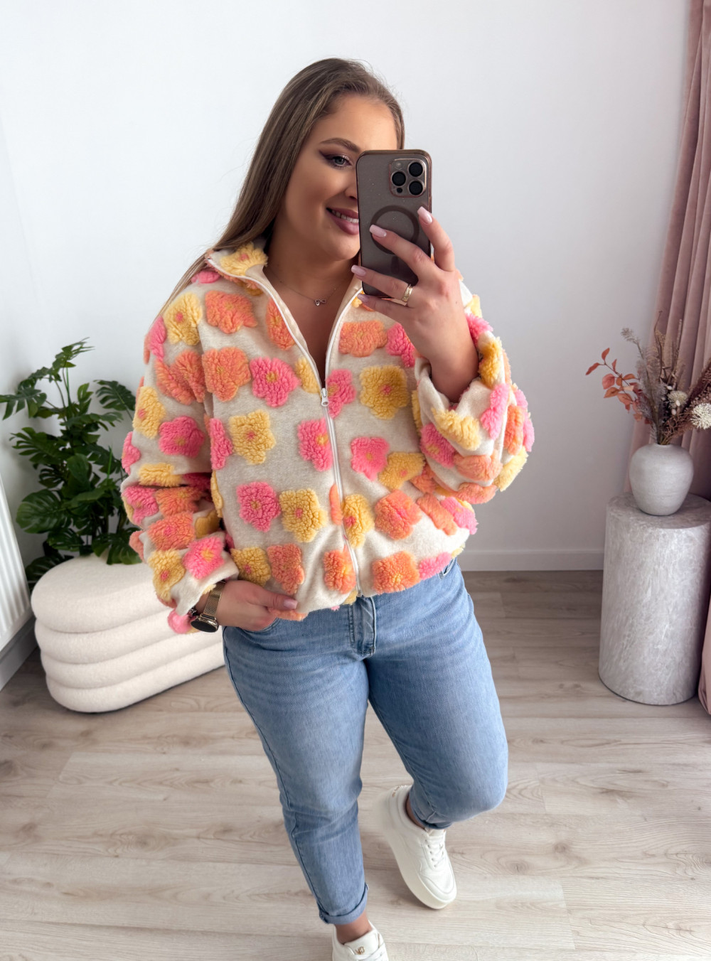 Ten miękki polar na zamek zachwyca uroczym charakterem i przyjemną w dotyku, pluszową fakturą. Ozdobne kwiatki w odcieniach różu, żółci i pomarańczu dodają mu ciepła oraz dziewczęcego uroku.