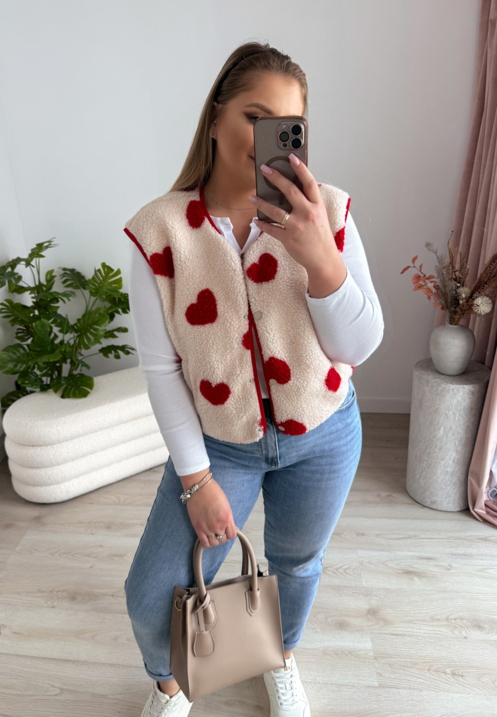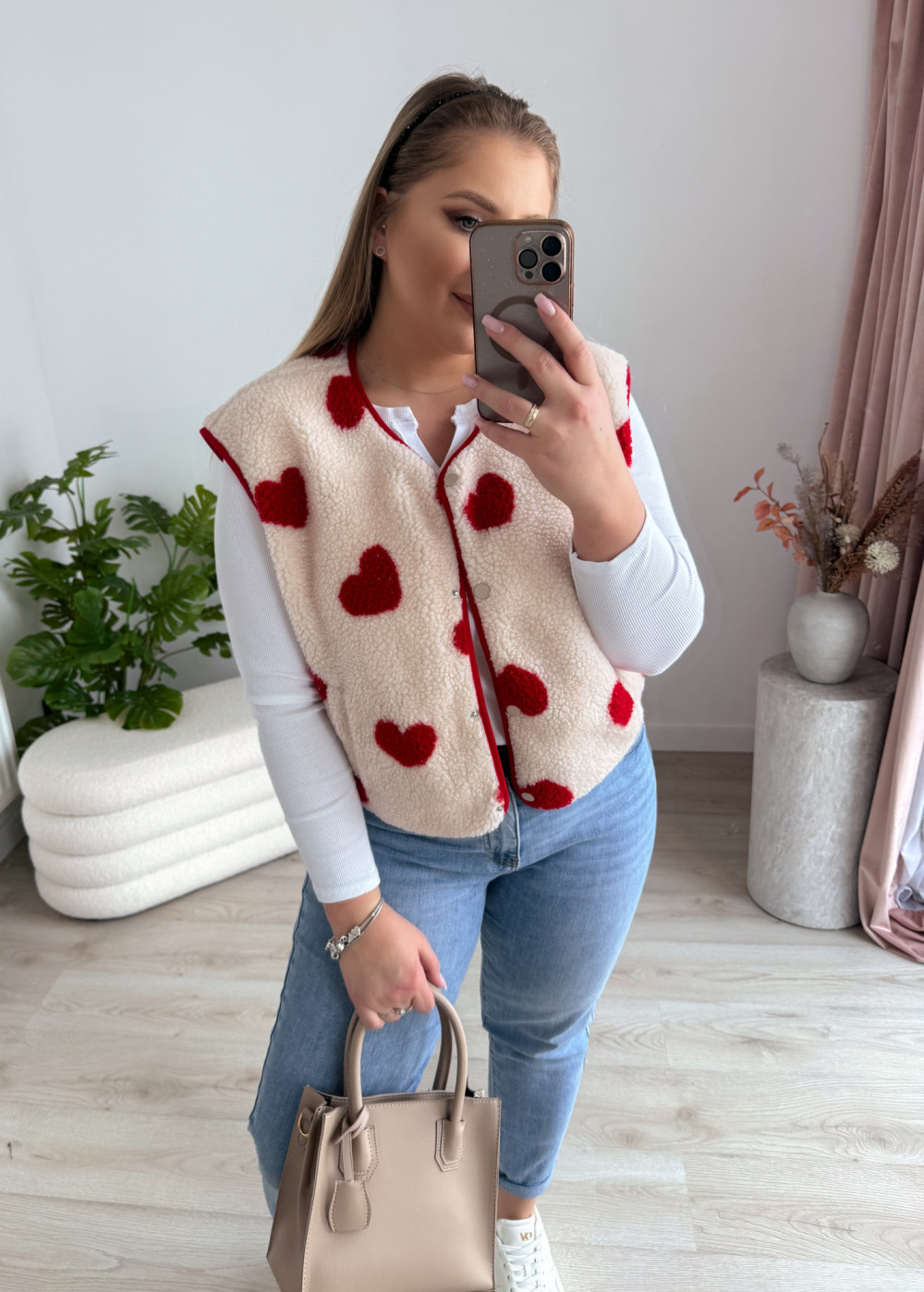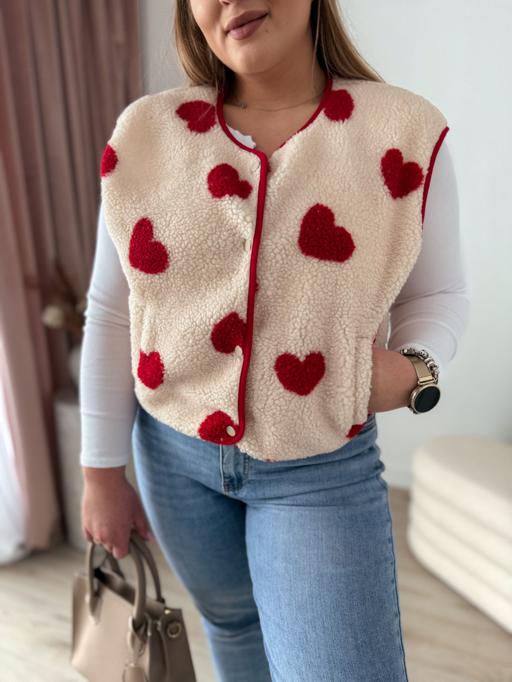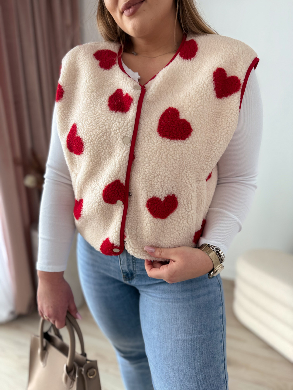 Kamizelka polar/baranek w czerwone serduszka Amore - krem