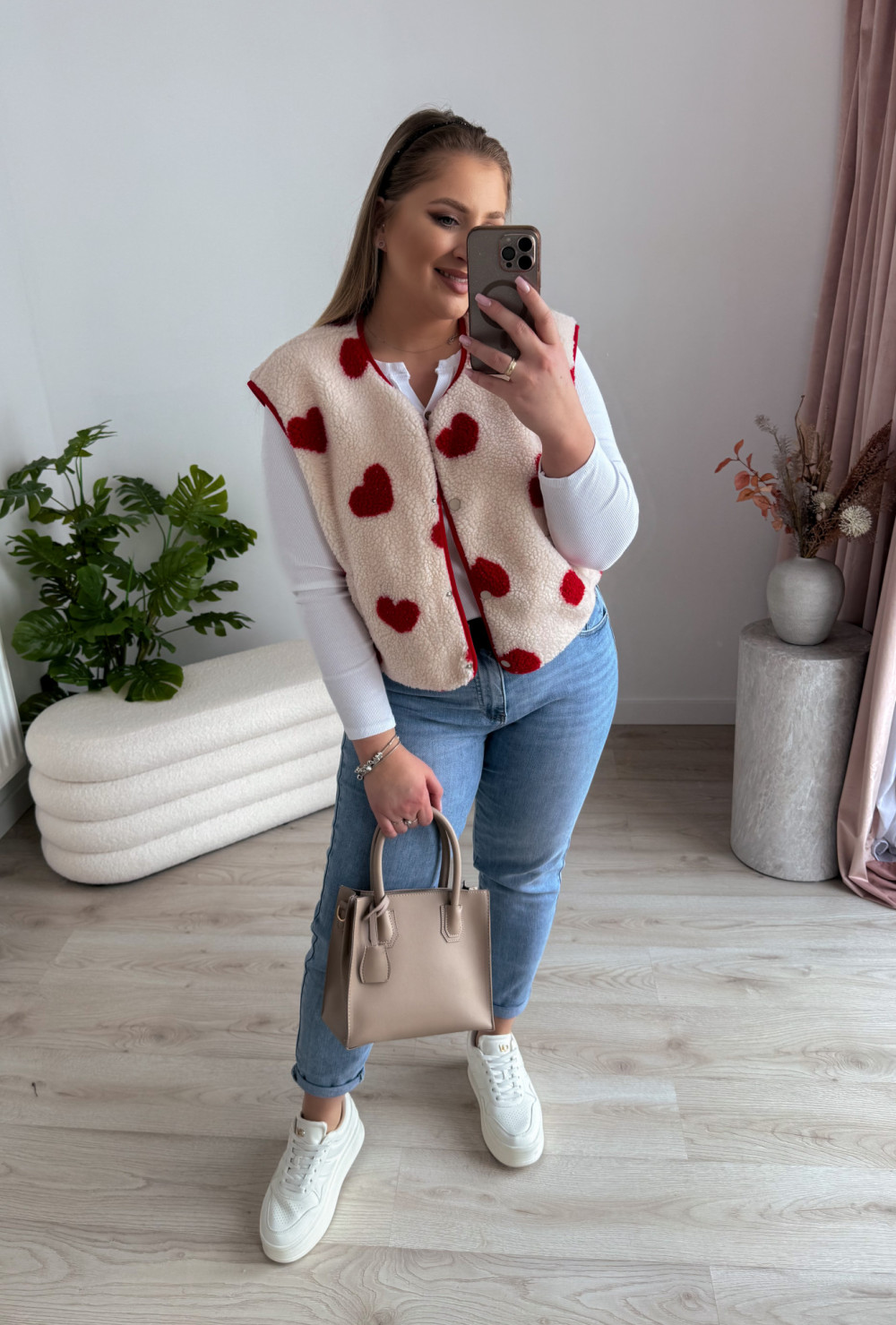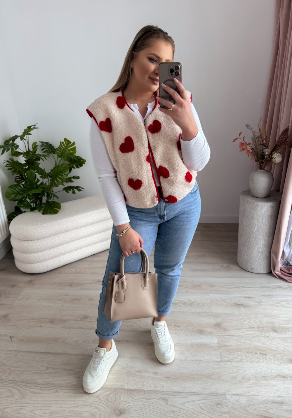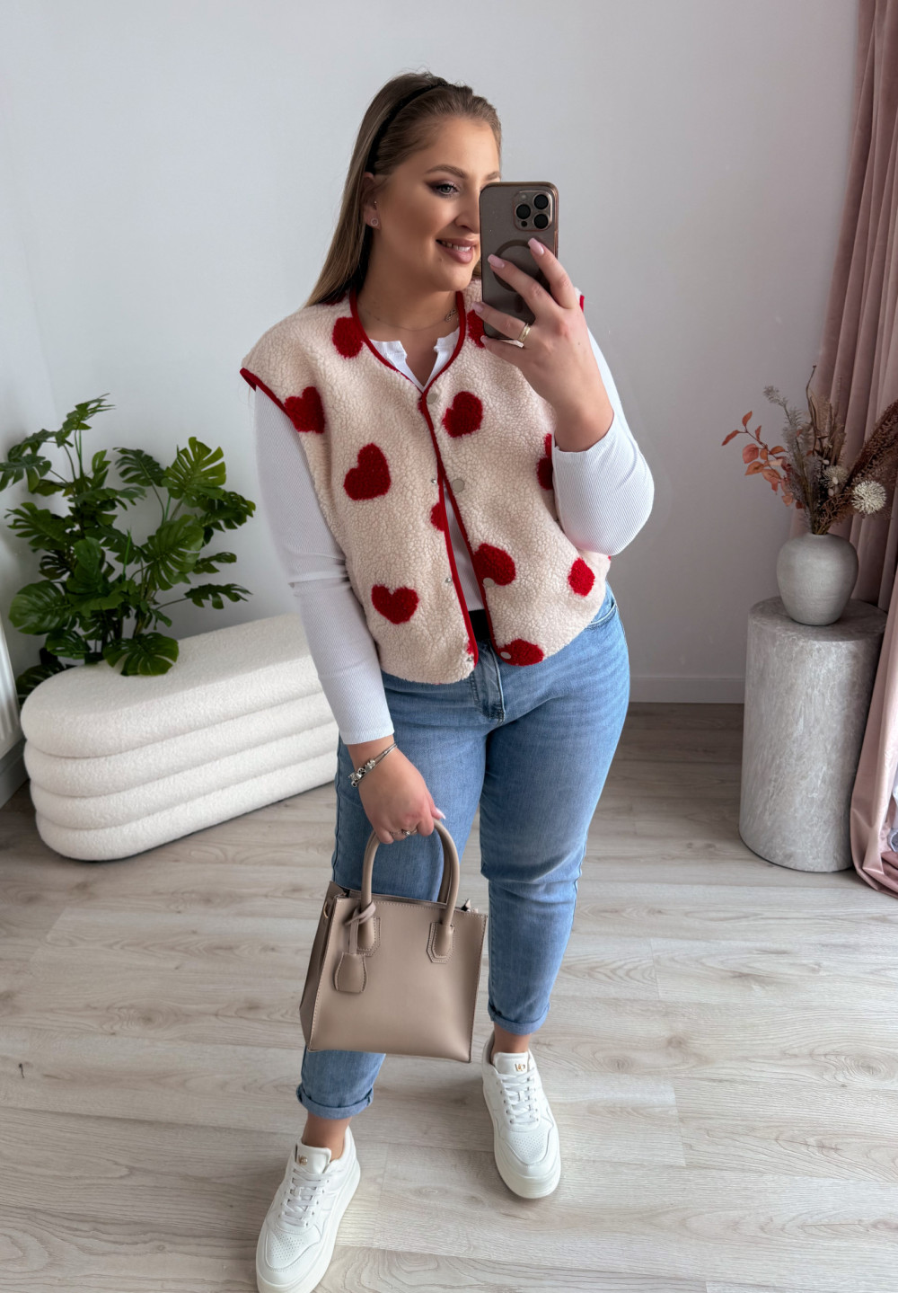Kamizelka polar/baranek w czerwone serduszka Amore - krem