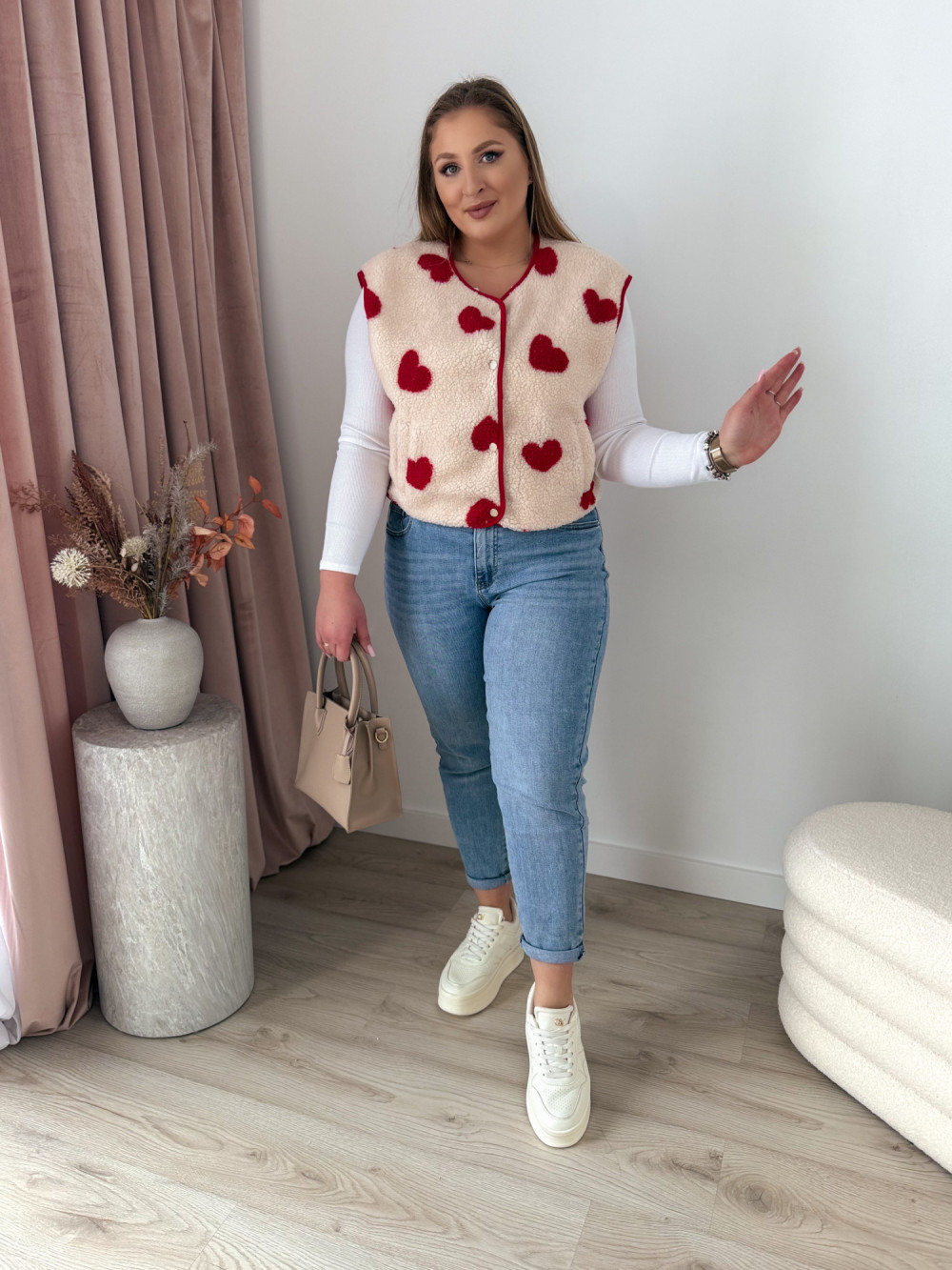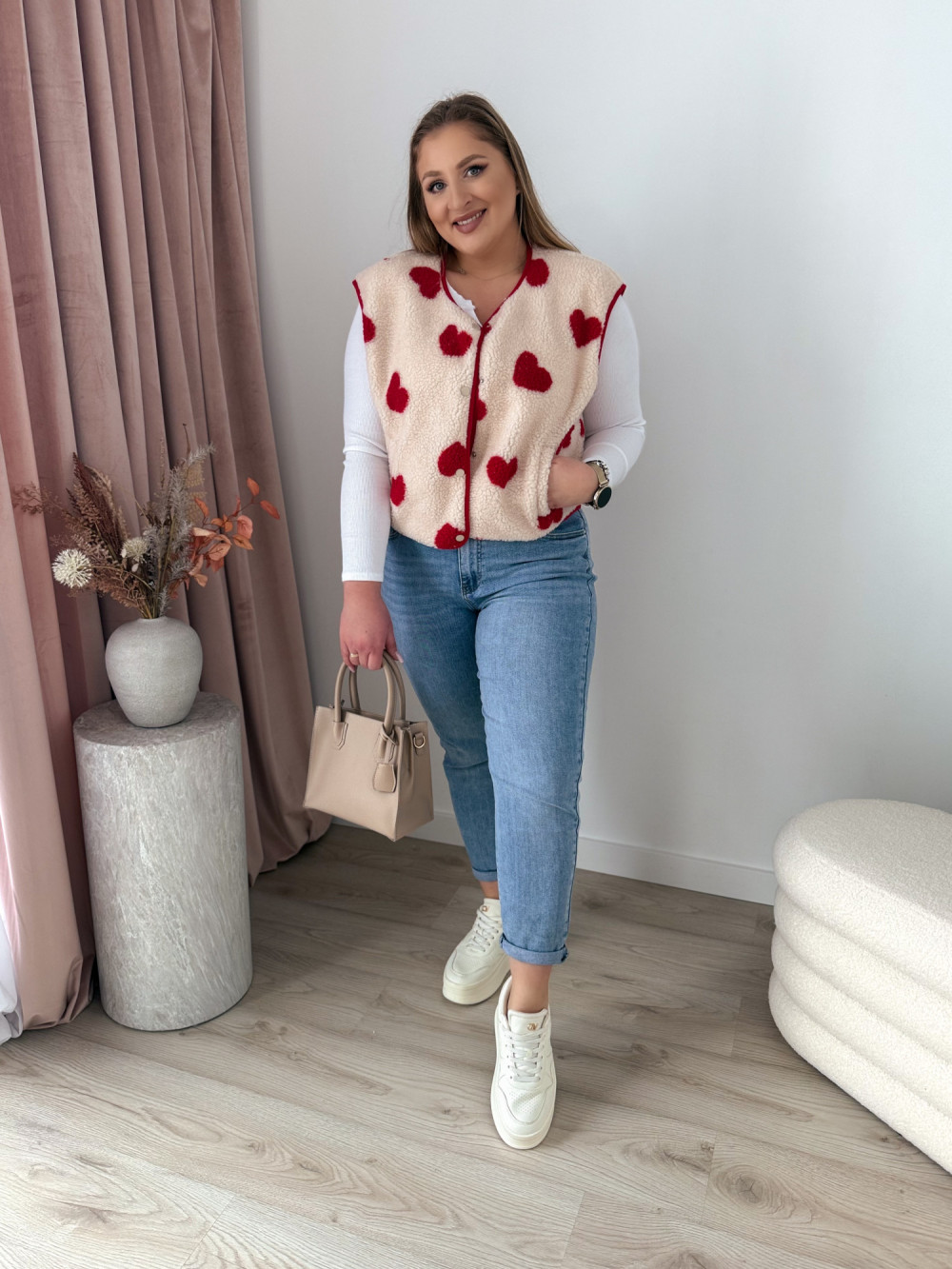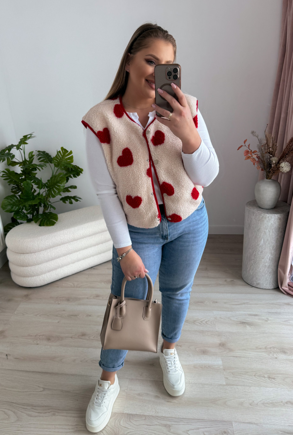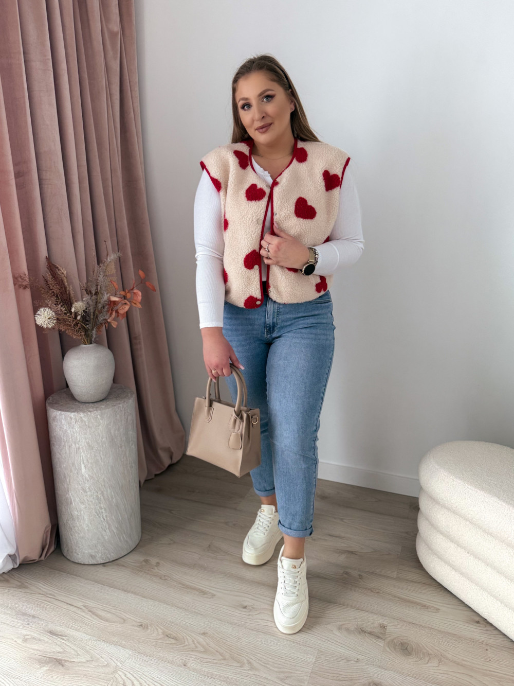 Kamizelka polar/baranek w czerwone serduszka Amore - krem
