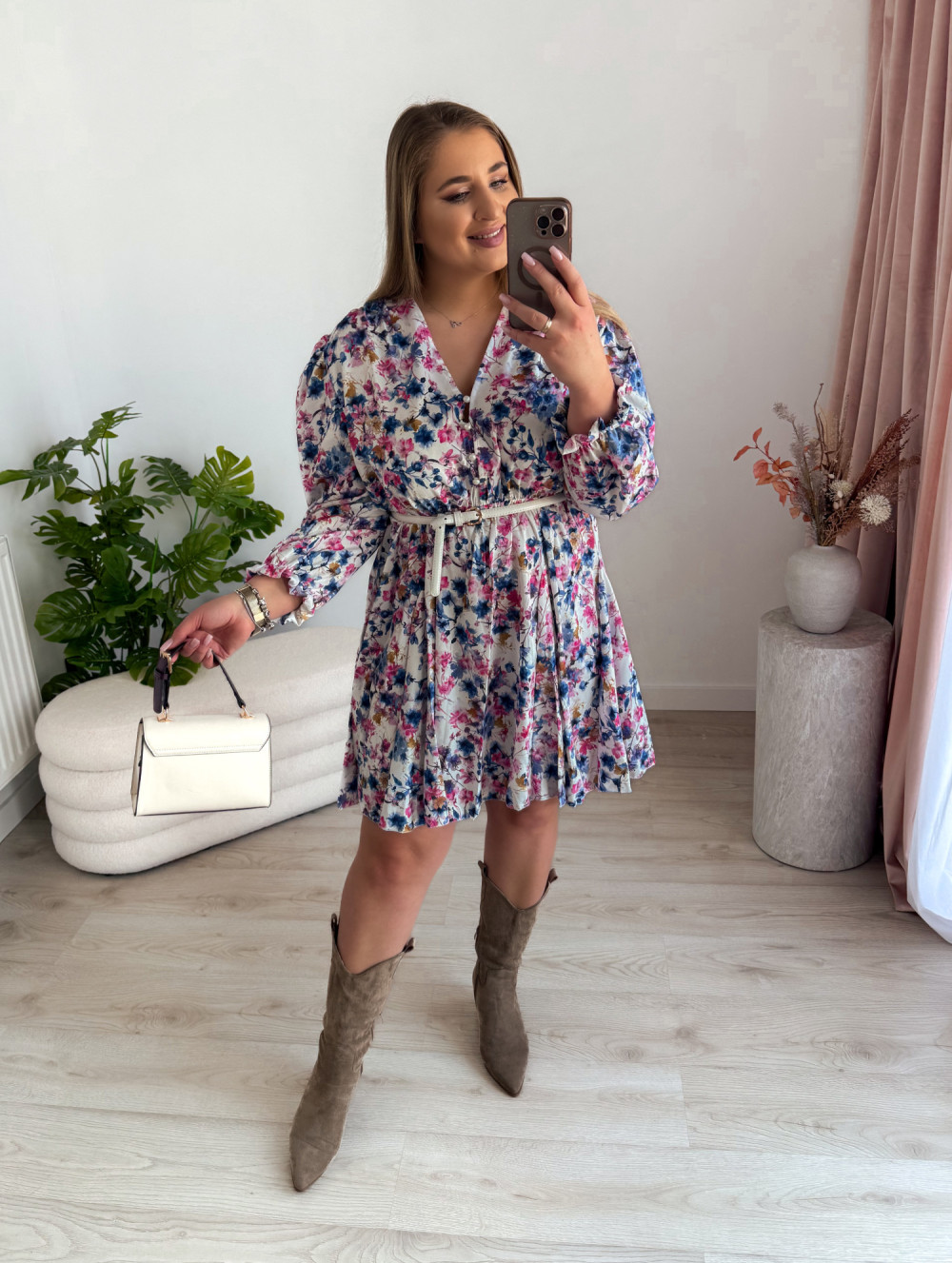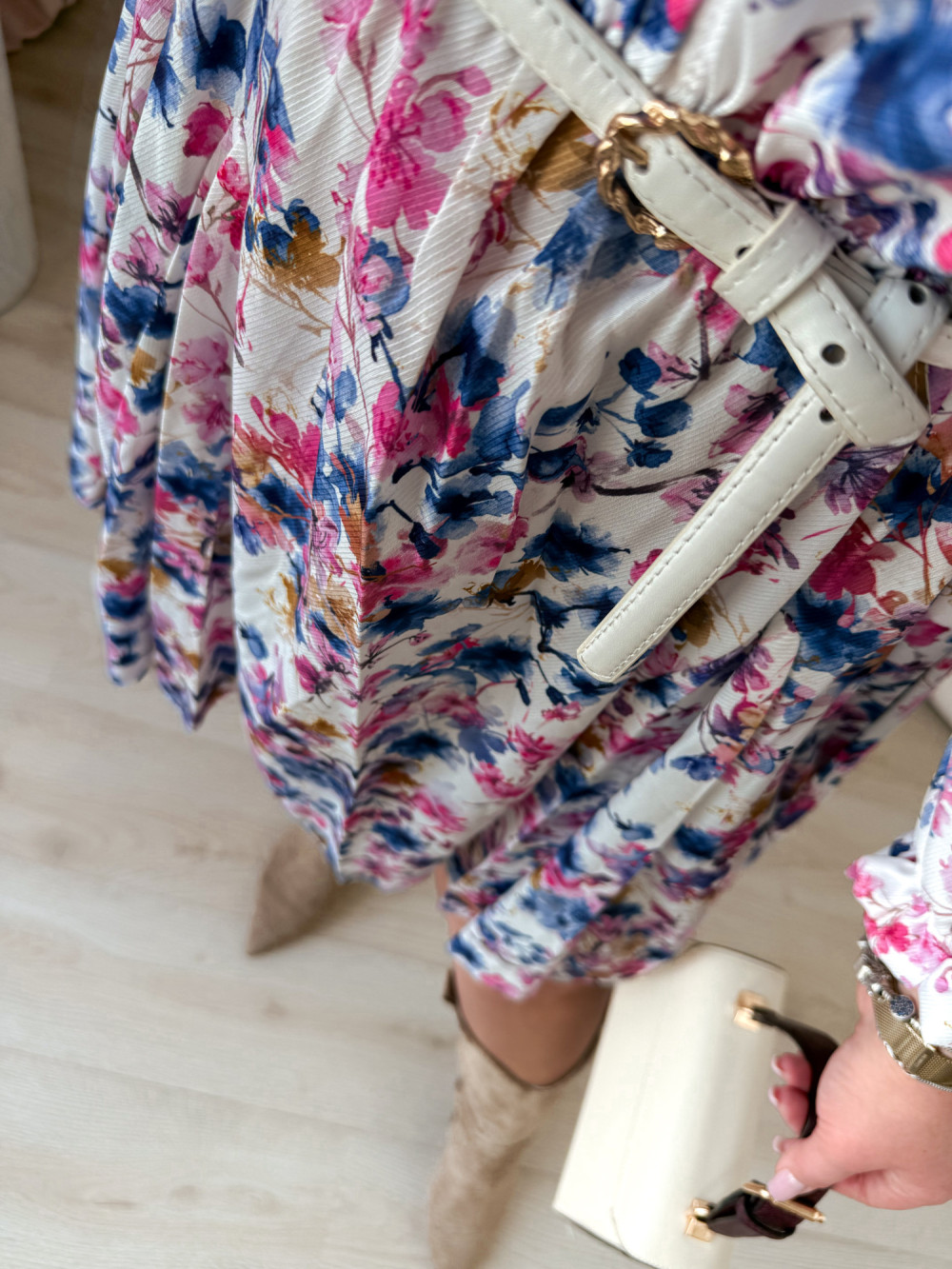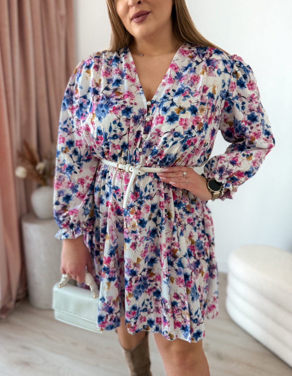 - Biała w niebiesko-różowe kwiatki - kobiecy styl