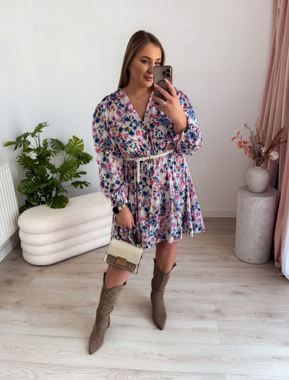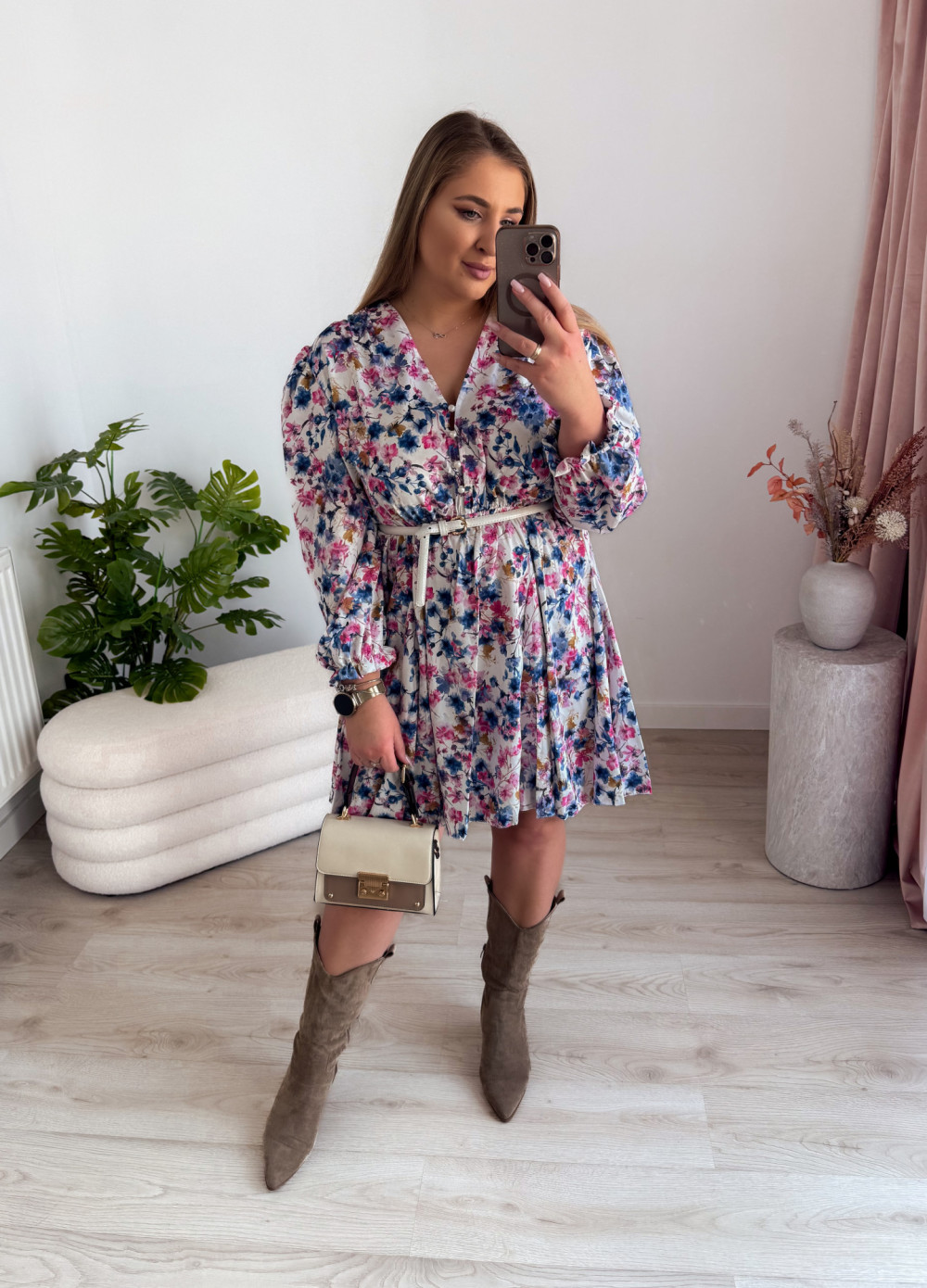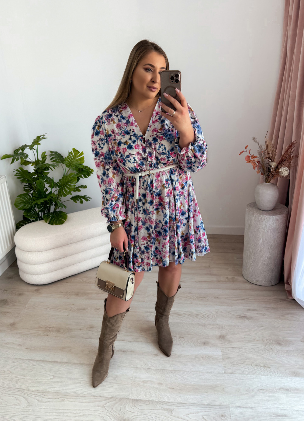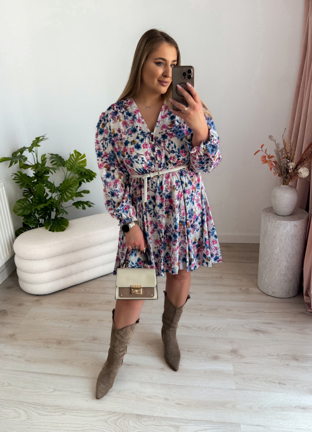 - Biała w niebiesko-różowe kwiatki - kobiecy styl