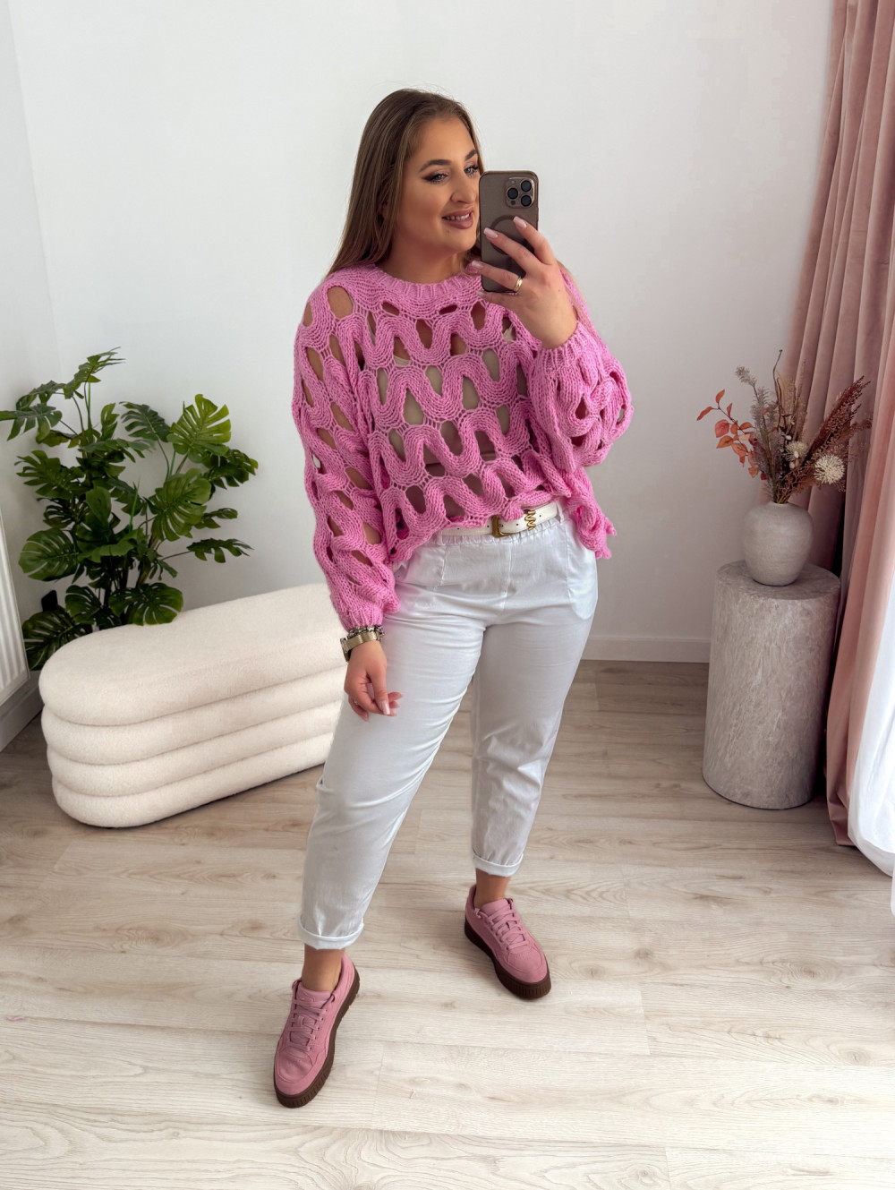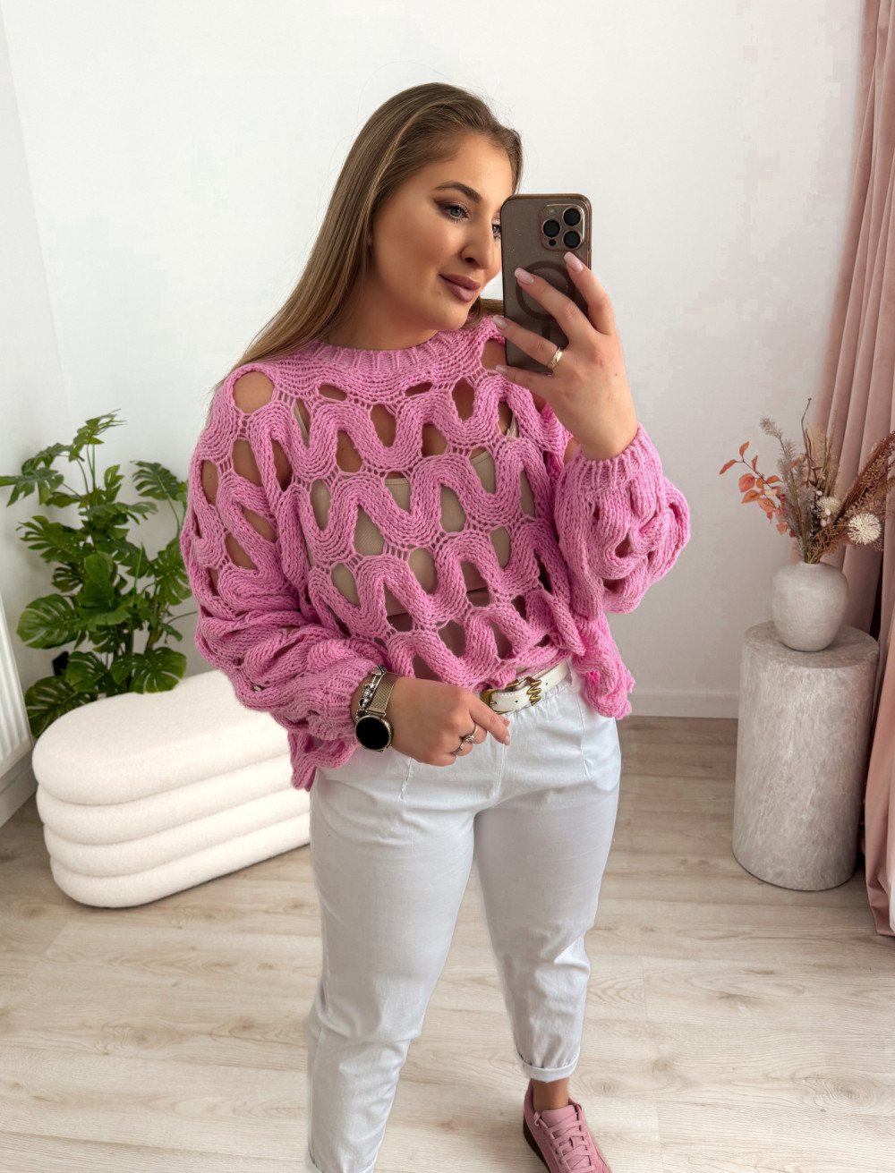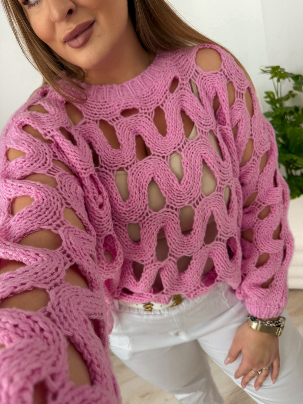 Sweter nietoperzowy ażurowy Lopez - cukierkowy