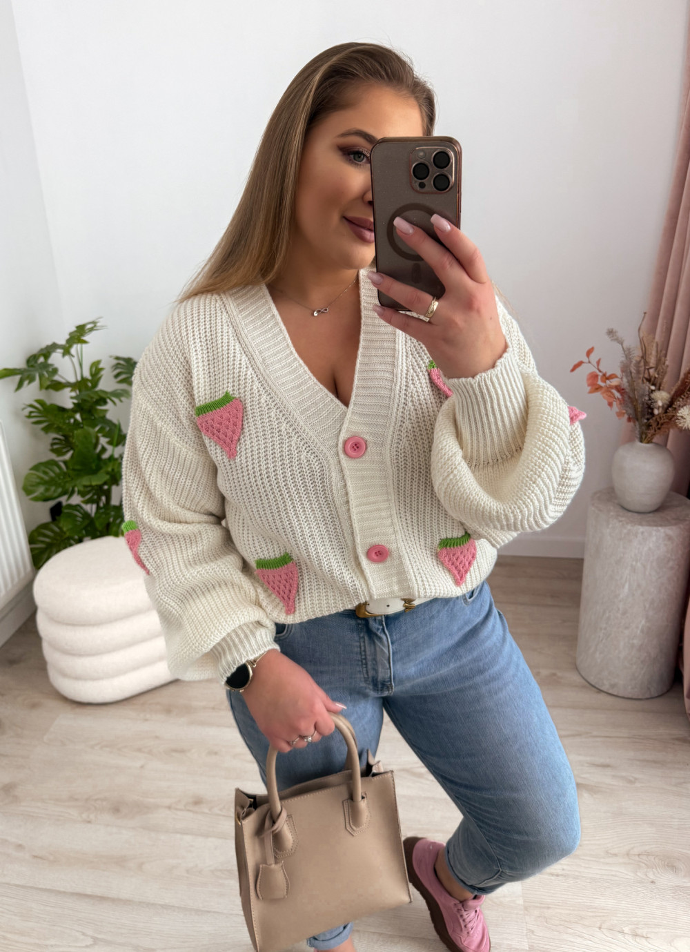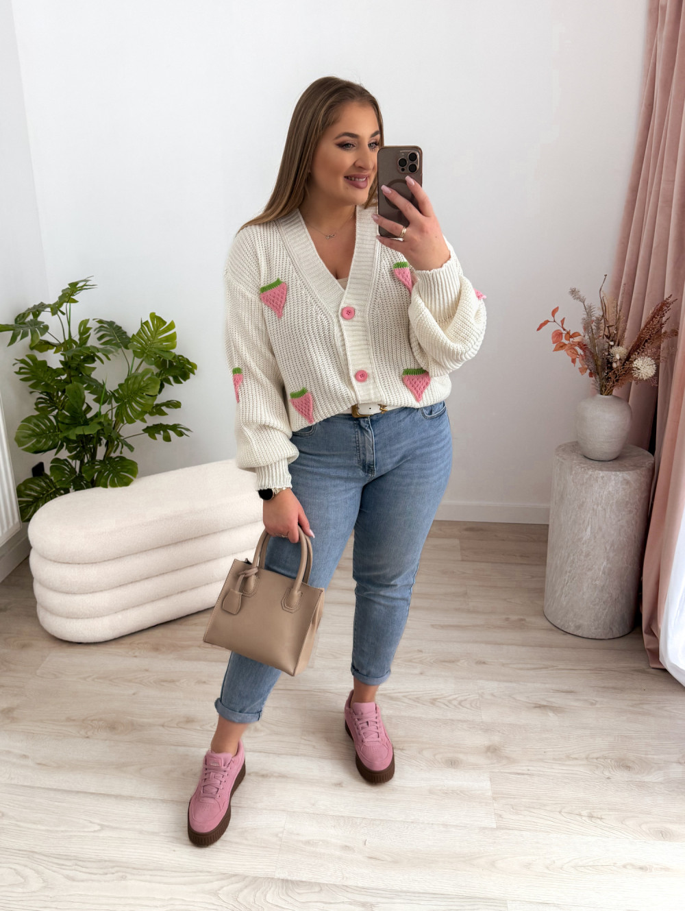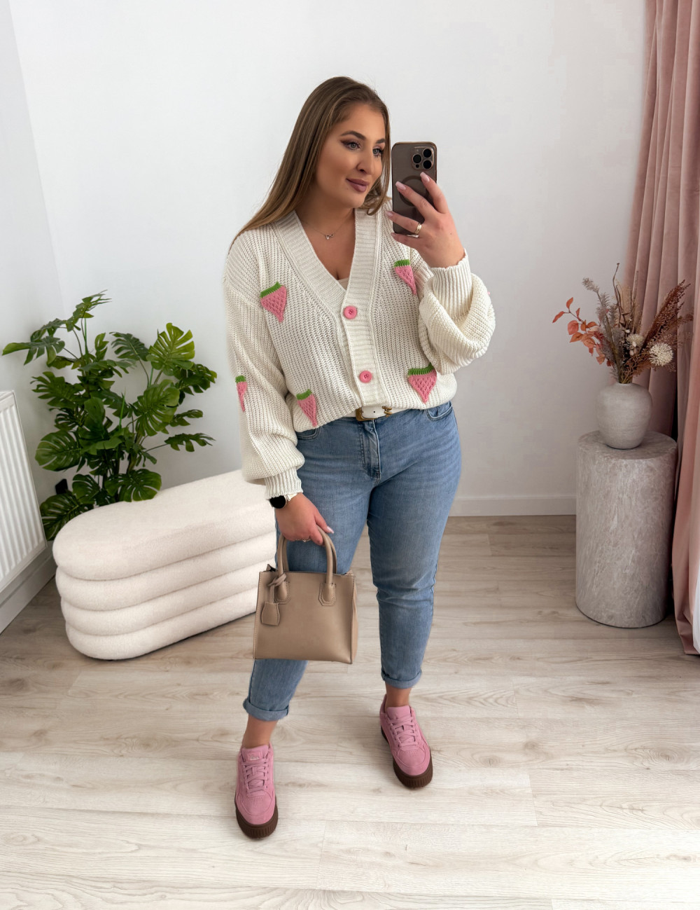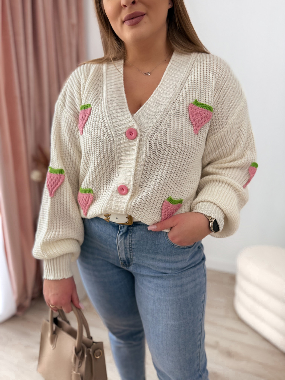Ten kremowy sweterek zapinany na guziki urzeka subtelną kolorystyką i uroczymi detalami. Ozdobne truskawki dodają mu dziewczęcego wdzięku i sprawiają, że wyróżnia się na tle klasycznych modeli.