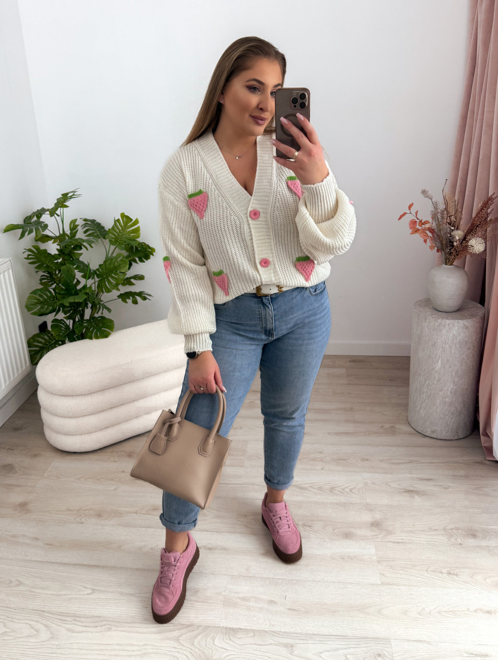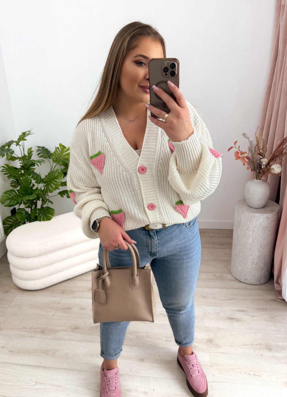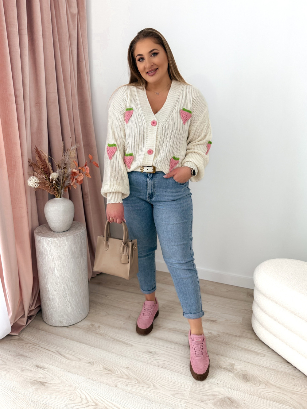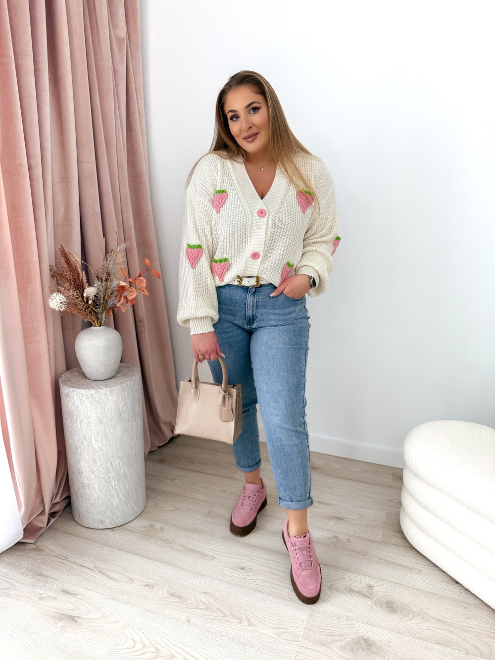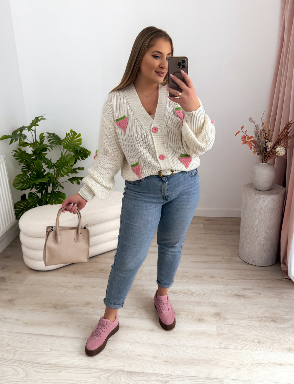 Ten kremowy sweterek zapinany na guziki urzeka subtelną kolorystyką i uroczymi detalami. Ozdobne truskawki dodają mu dziewczęcego wdzięku i sprawiają, że wyróżnia się na tle klasycznych modeli.