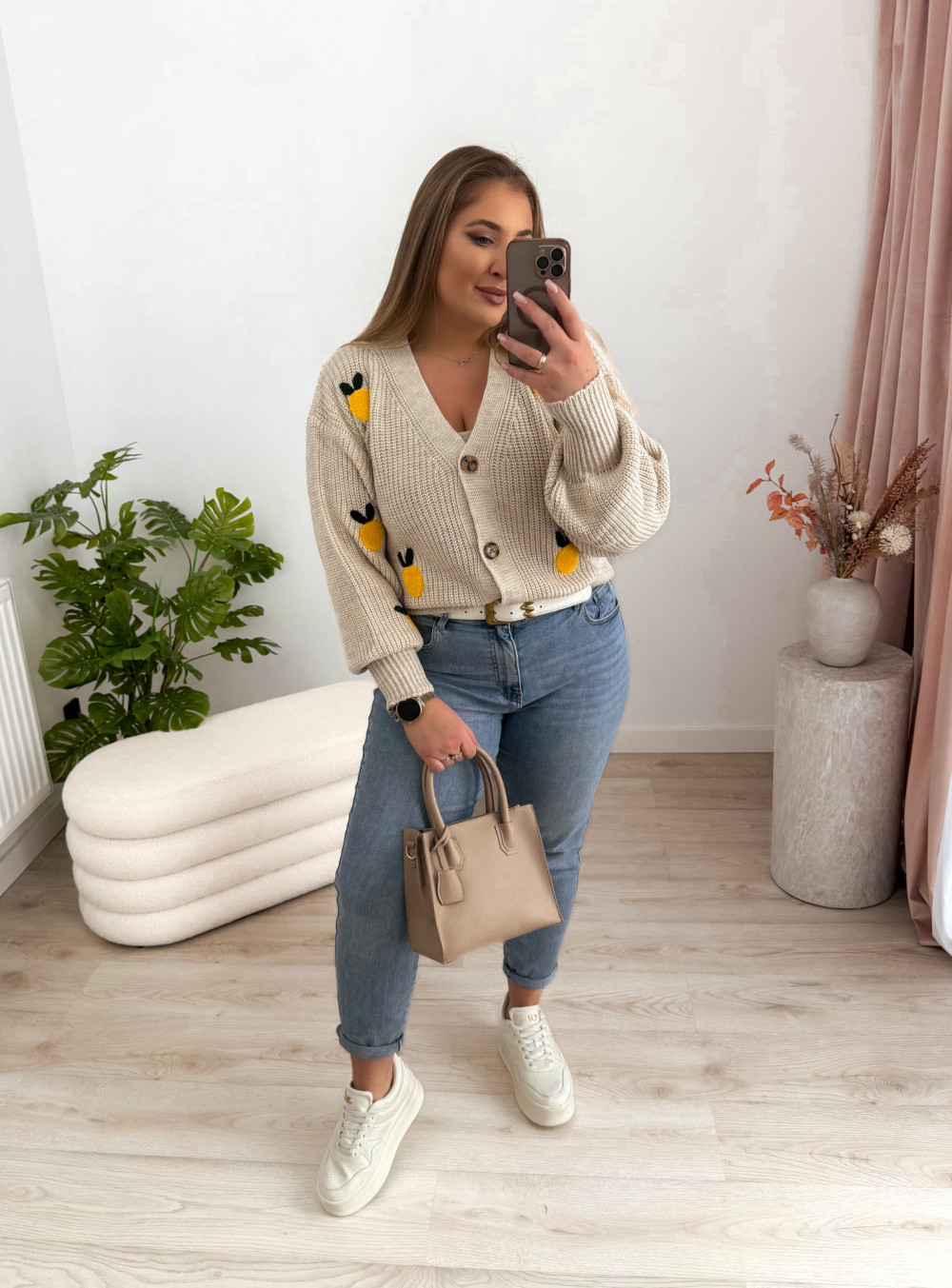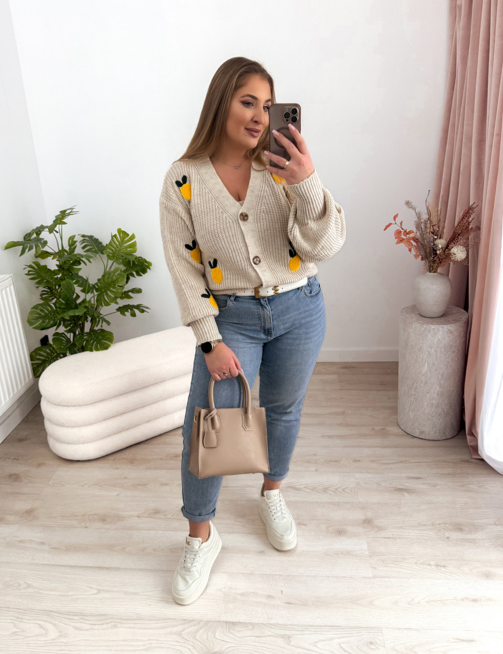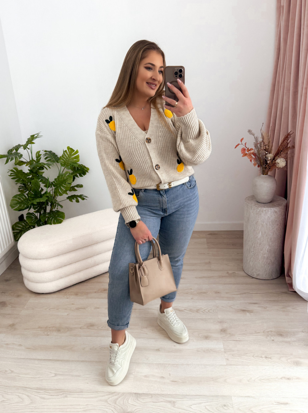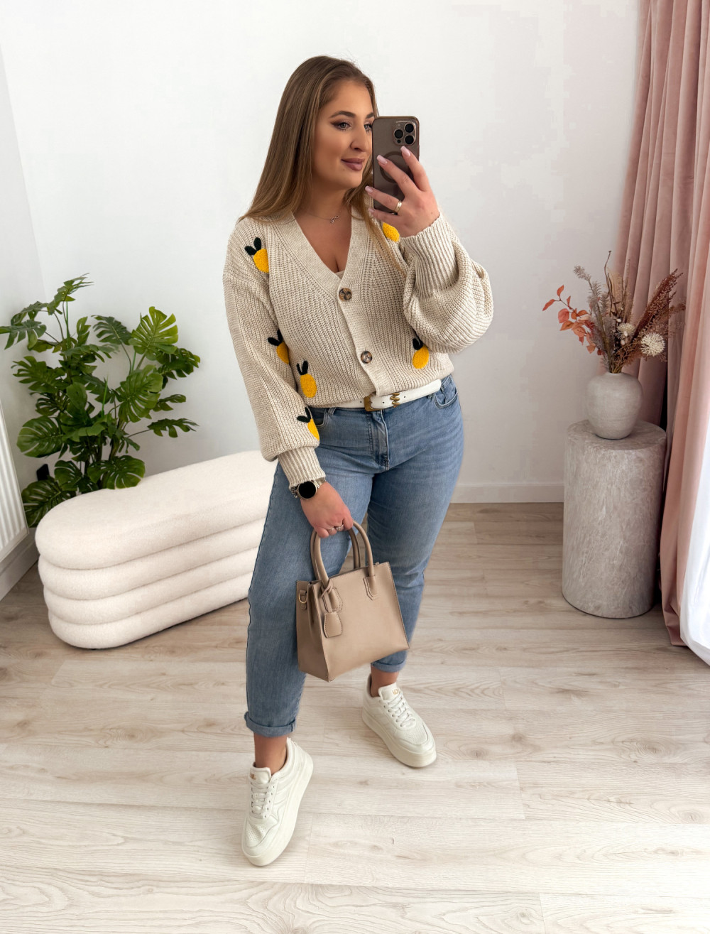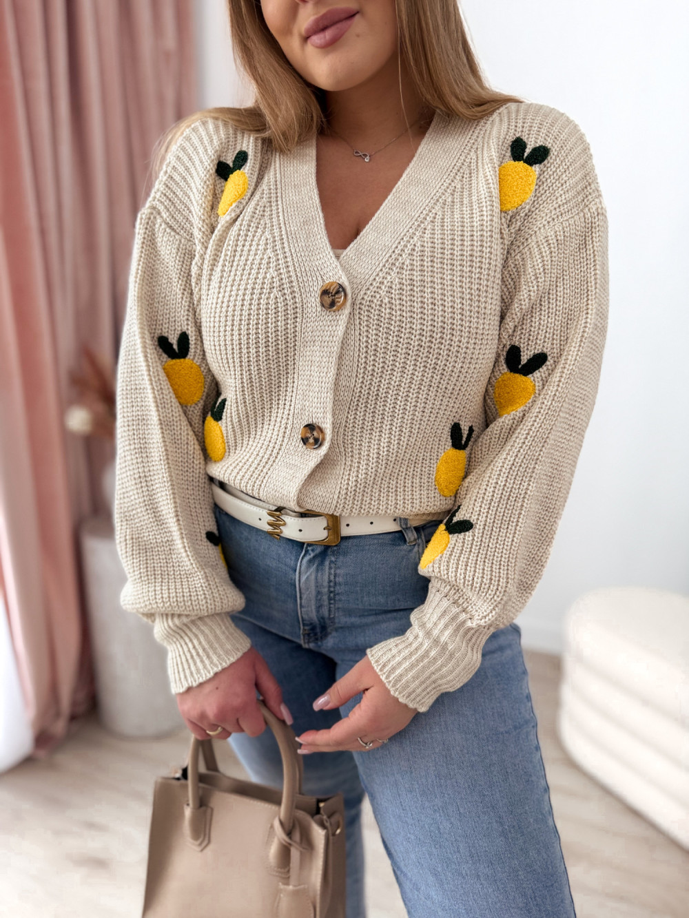 Ten beżowy sweterek zapinany na guziki zachwyca uroczym designem i dopracowanymi detalami. Trójwymiarowe cytrynki 3D dodają mu świeżości i oryginalnego, przyciągającego wzrok charakteru.