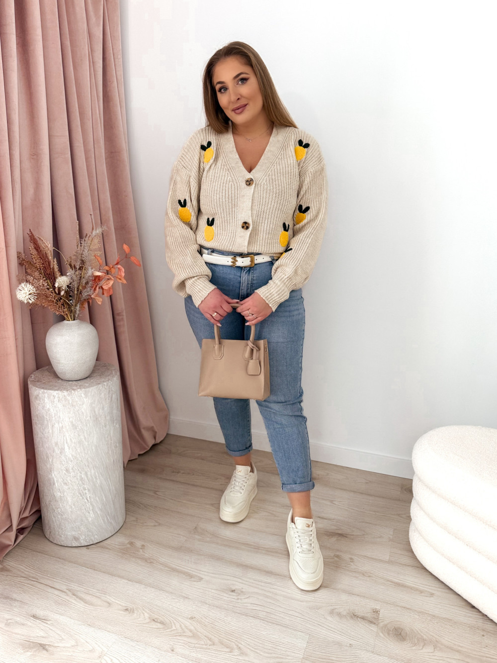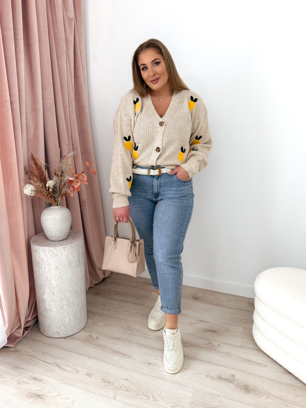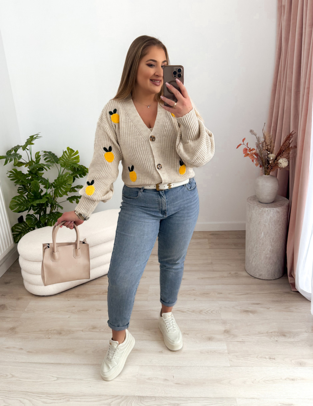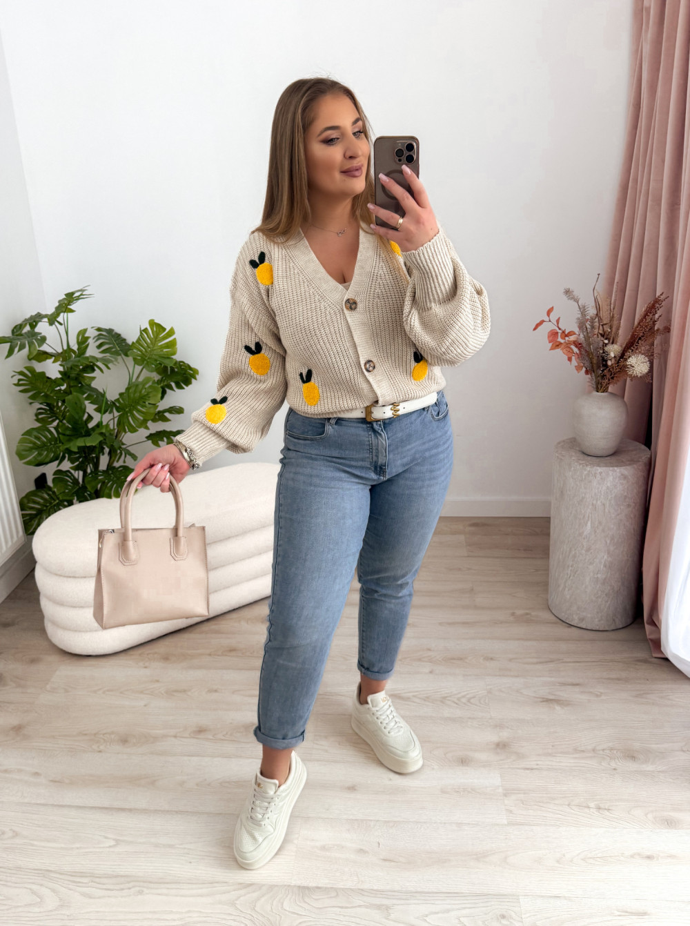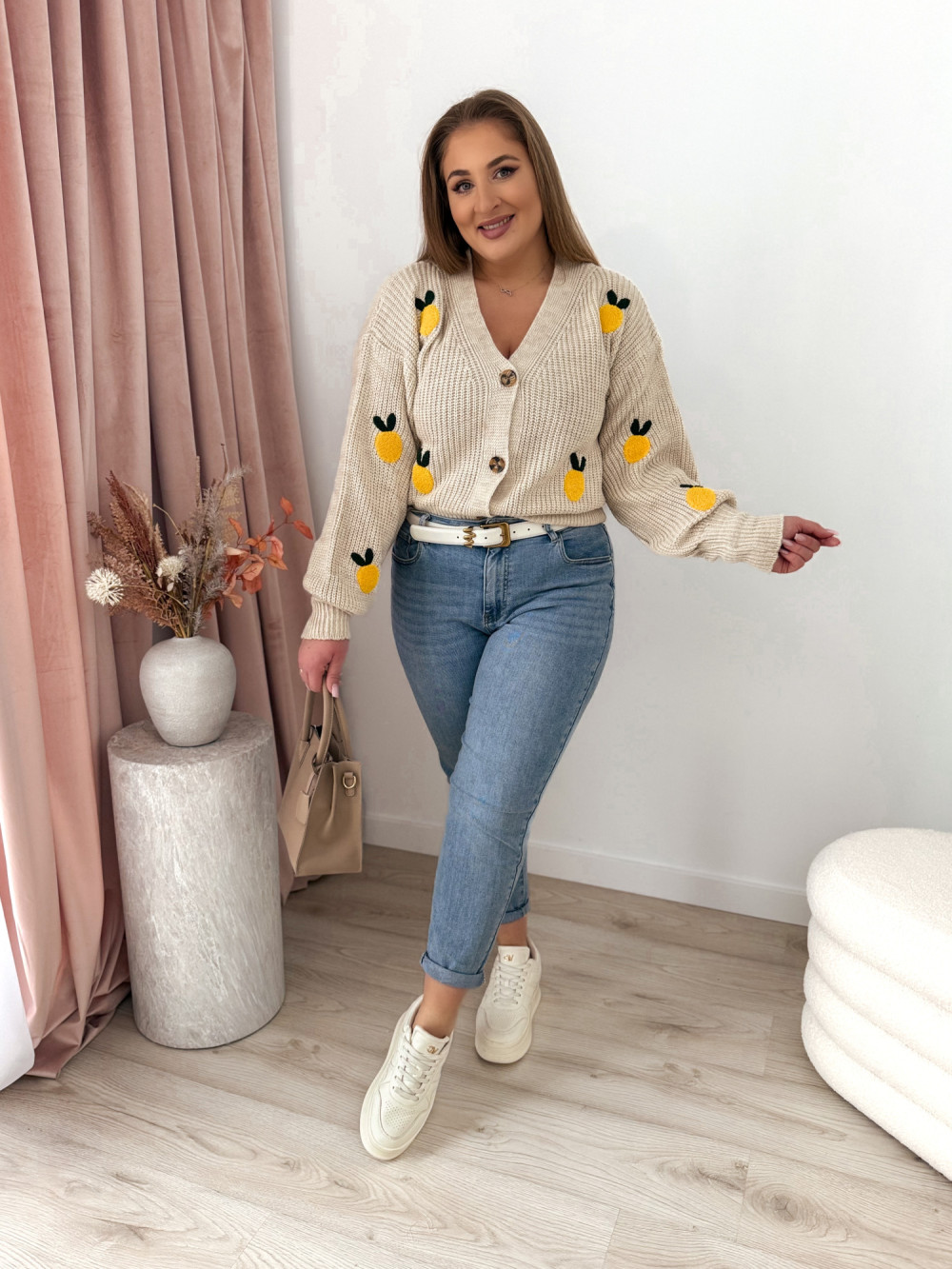Ten beżowy sweterek zapinany na guziki zachwyca uroczym designem i dopracowanymi detalami. Trójwymiarowe cytrynki 3D dodają mu świeżości i oryginalnego, przyciągającego wzrok charakteru.