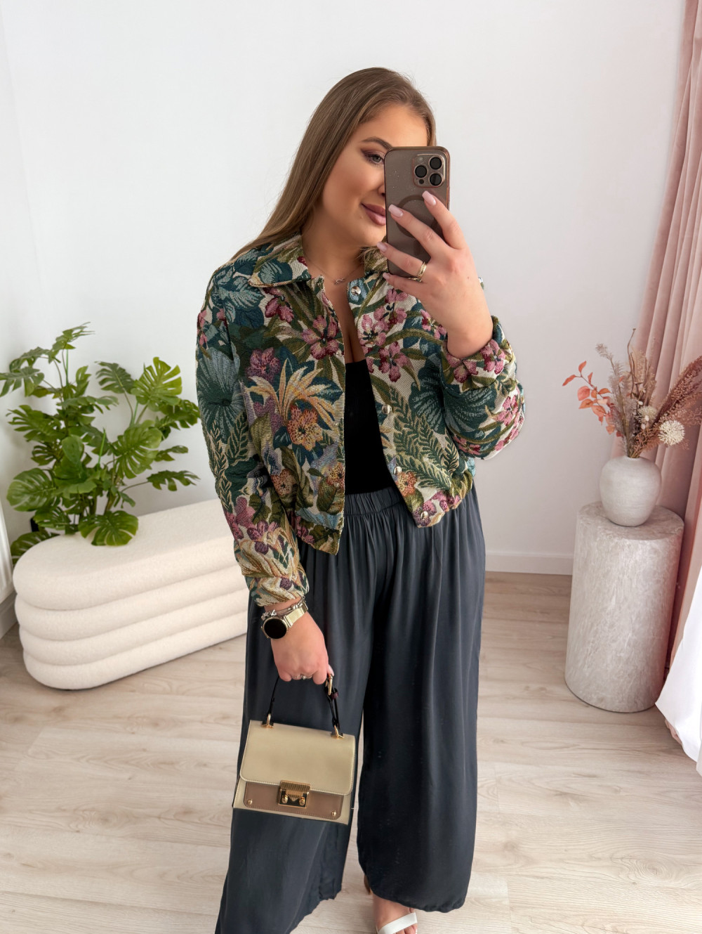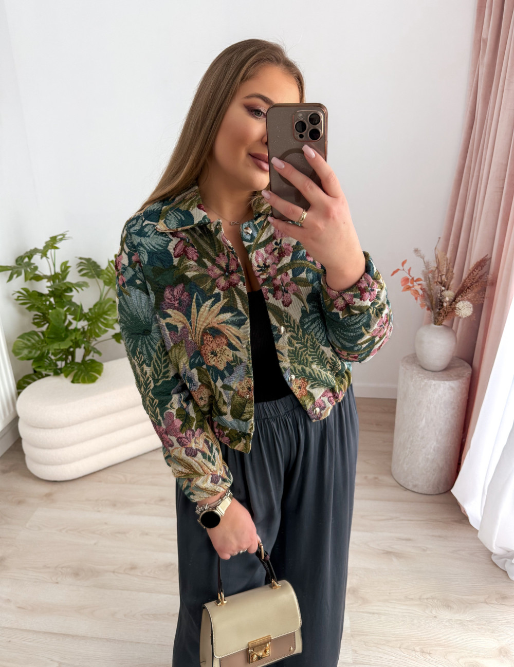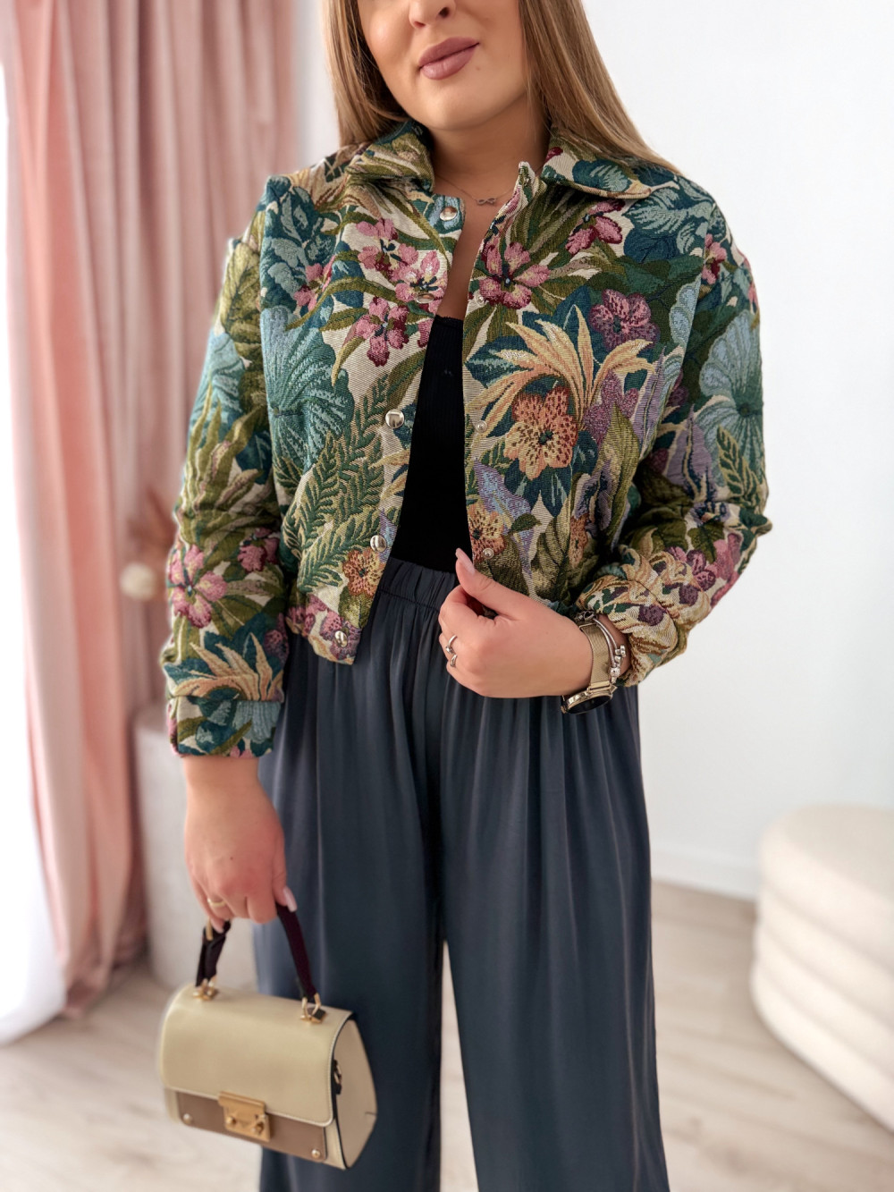 Bomberka zapinana na napy zachwyca efektownymi, tropikalnymi wzorami w odcieniach zieleni, które nadają jej świeżości i wyrazistego charakteru. Podszewka zapewnia komfort noszenia i sprawia, że model świetnie sprawdzi się w przejściowych stylizacjach.