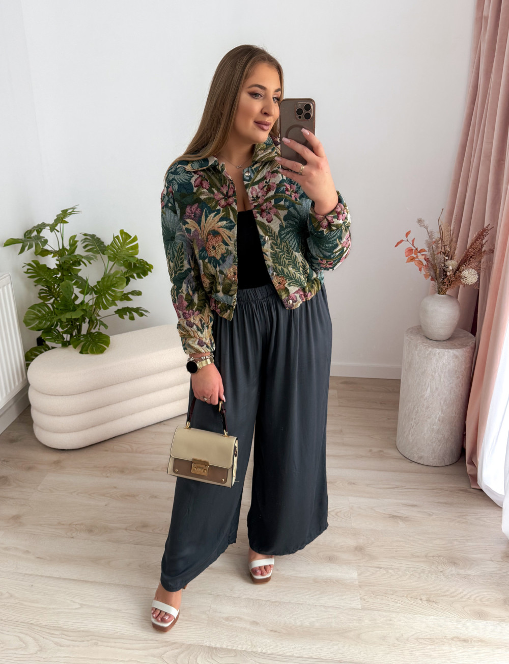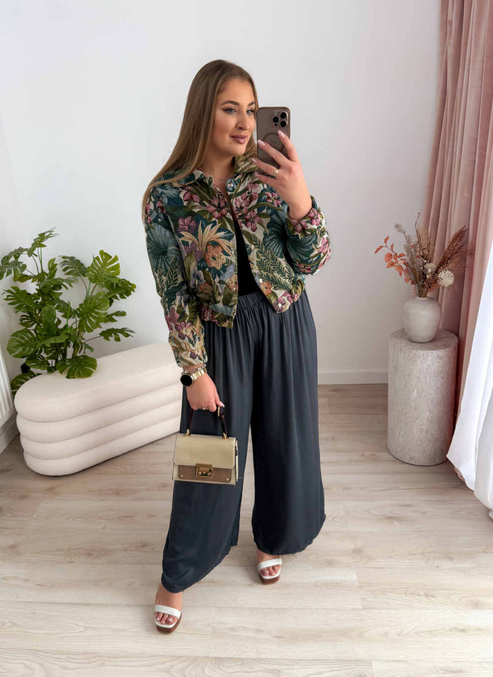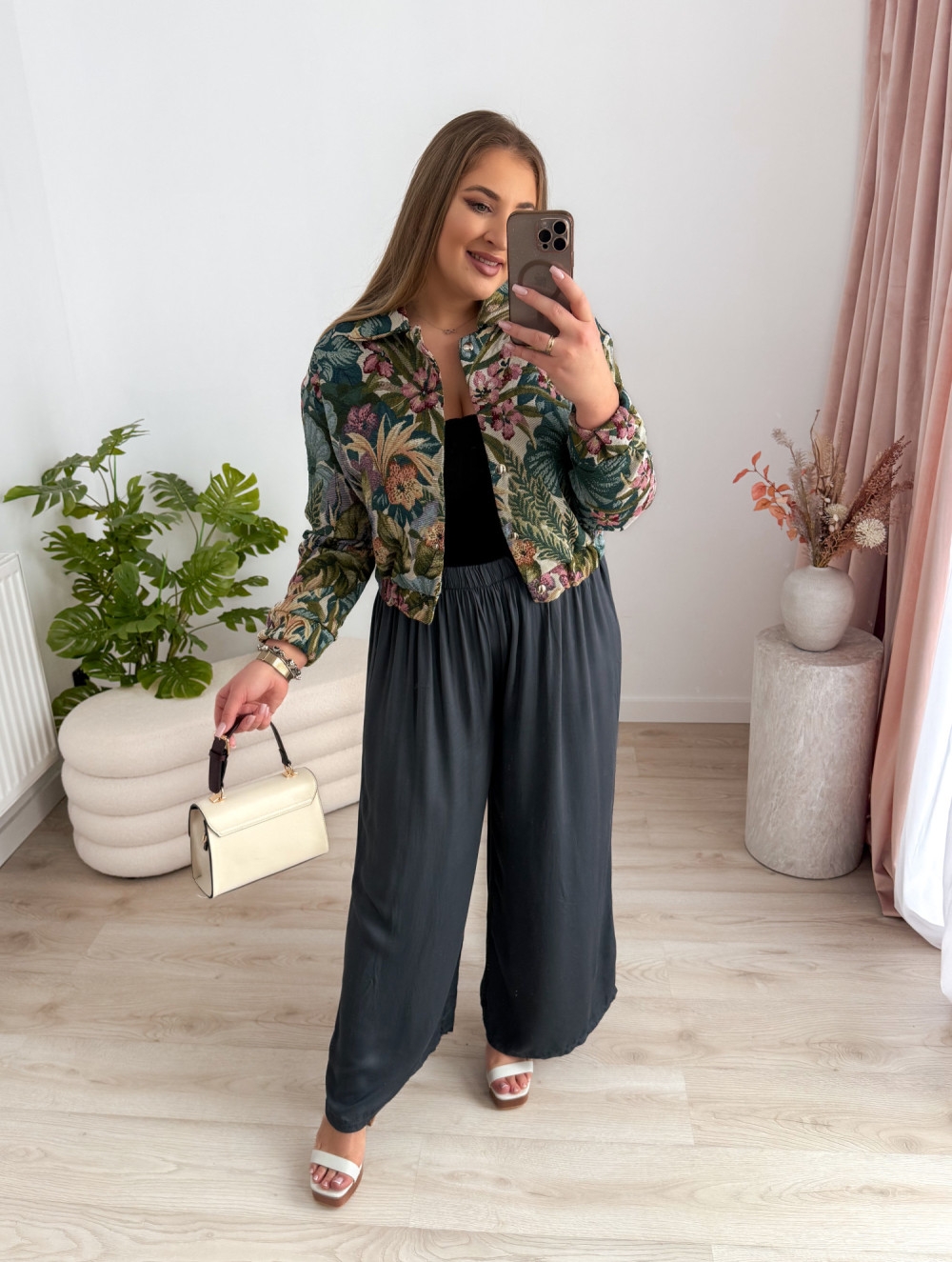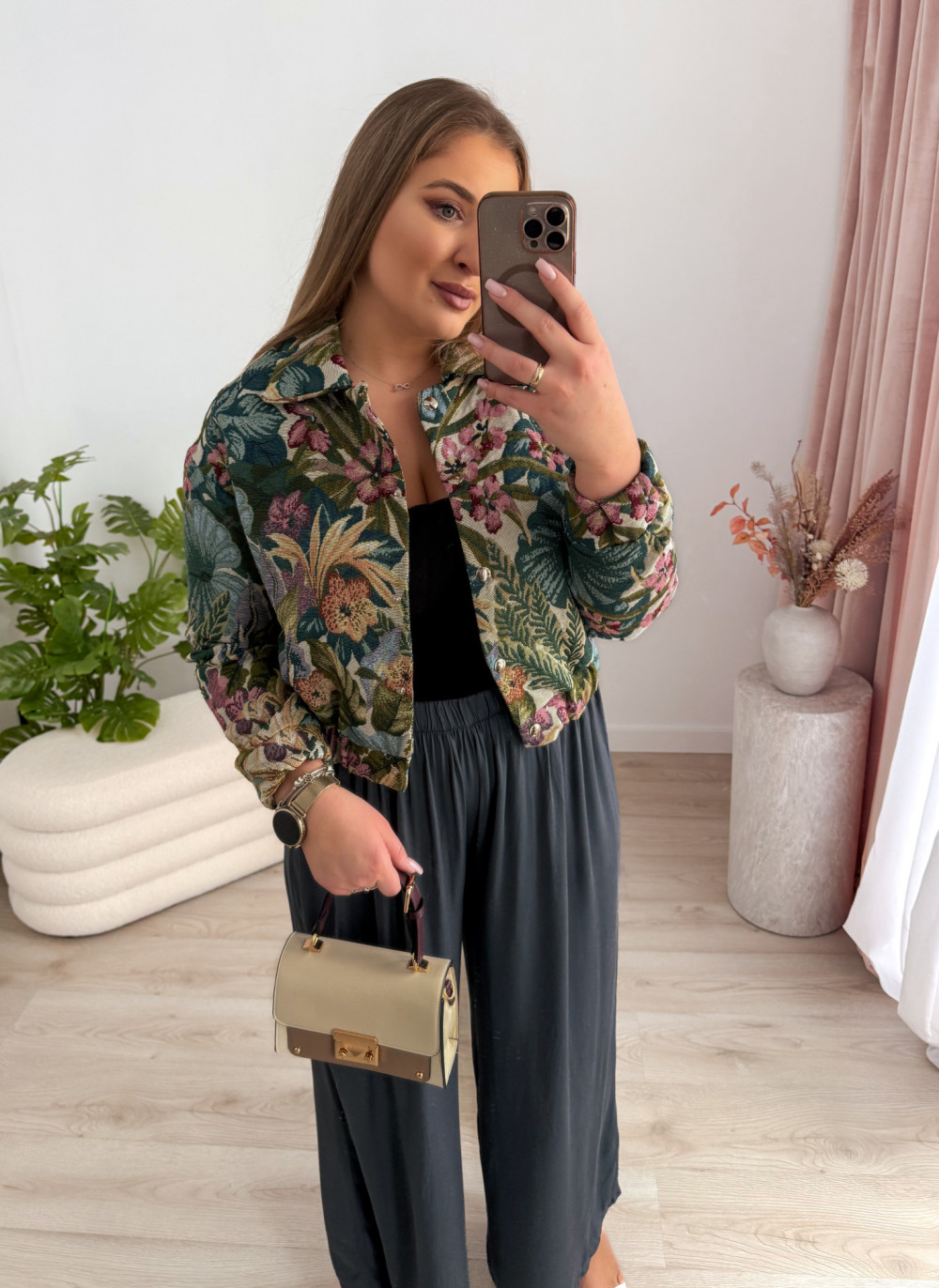 Bomberka zapinana na napy zachwyca efektownymi, tropikalnymi wzorami w odcieniach zieleni, które nadają jej świeżości i wyrazistego charakteru. Podszewka zapewnia komfort noszenia i sprawia, że model świetnie sprawdzi się w przejściowych stylizacjach.