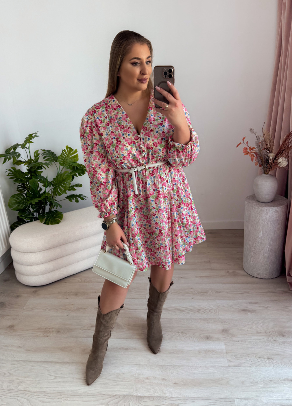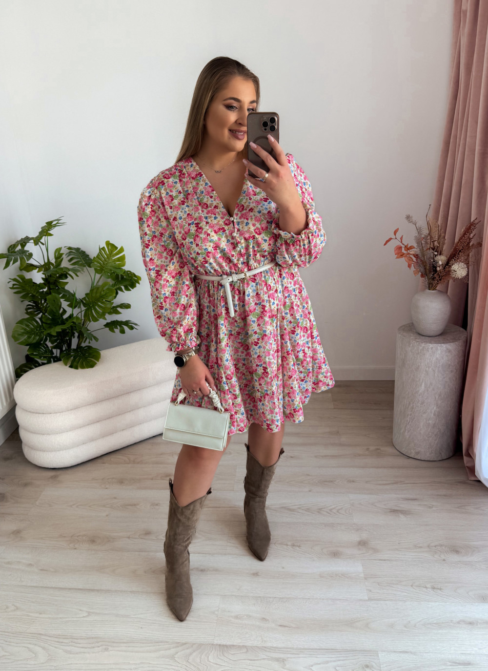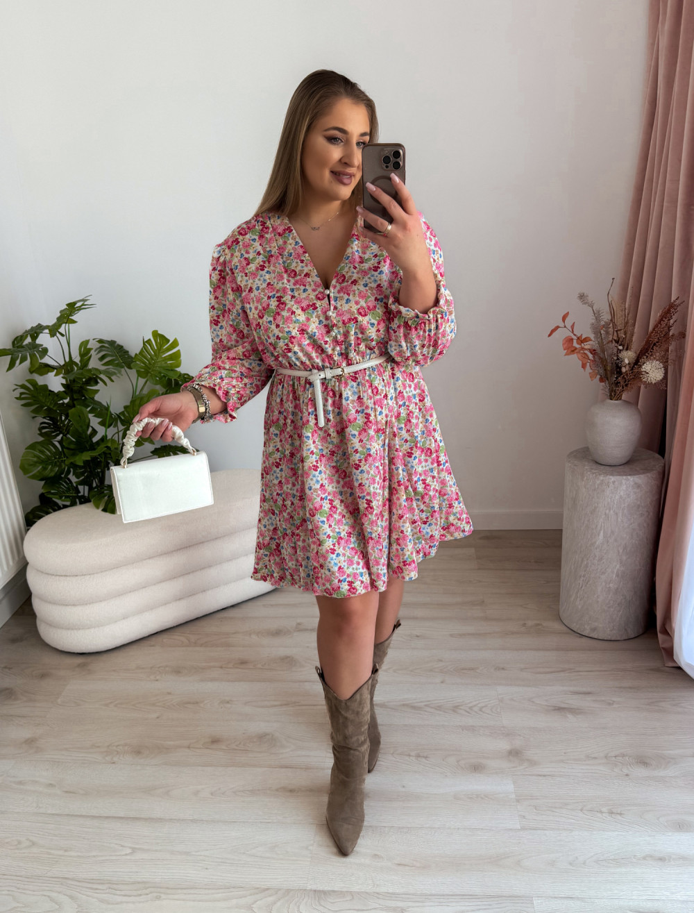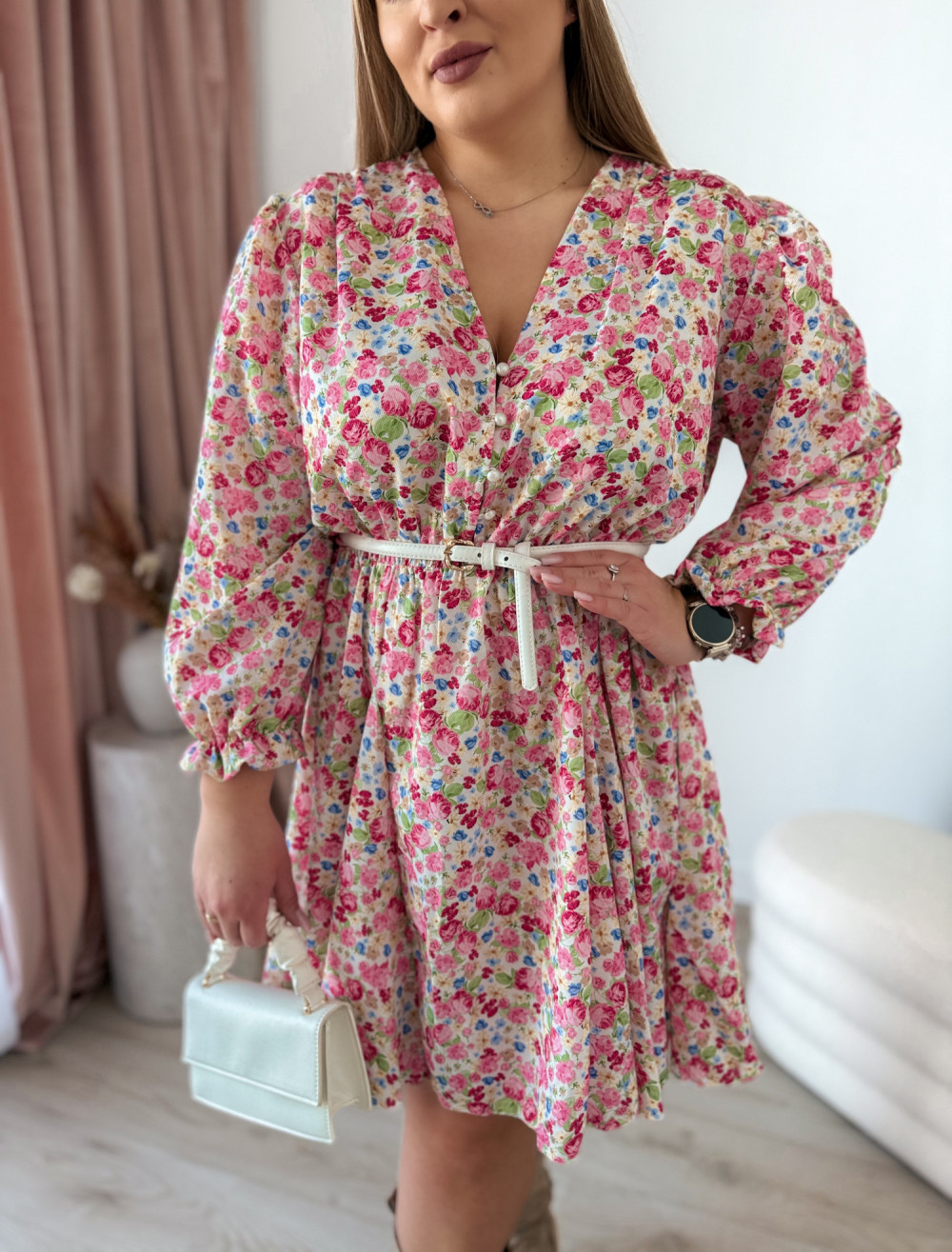Sukienka krótka plus size biała w drobne różowo-niebieskie kwiatki Tatiana