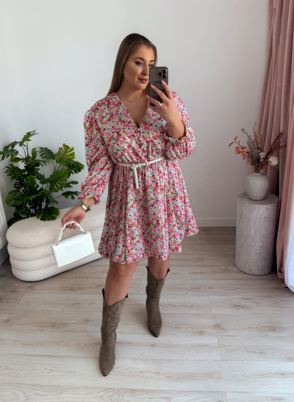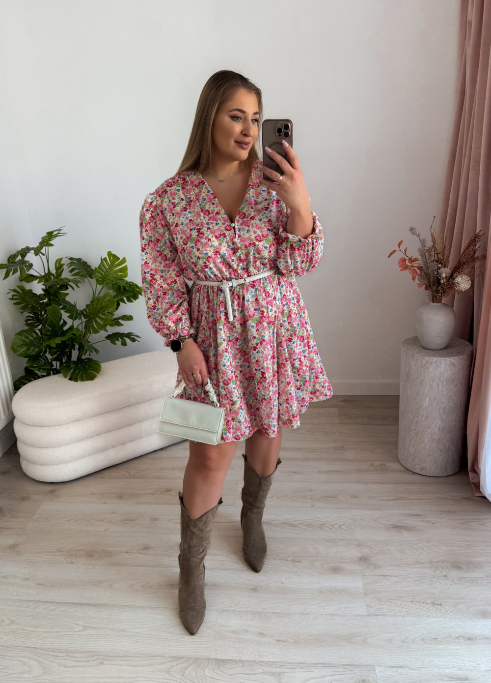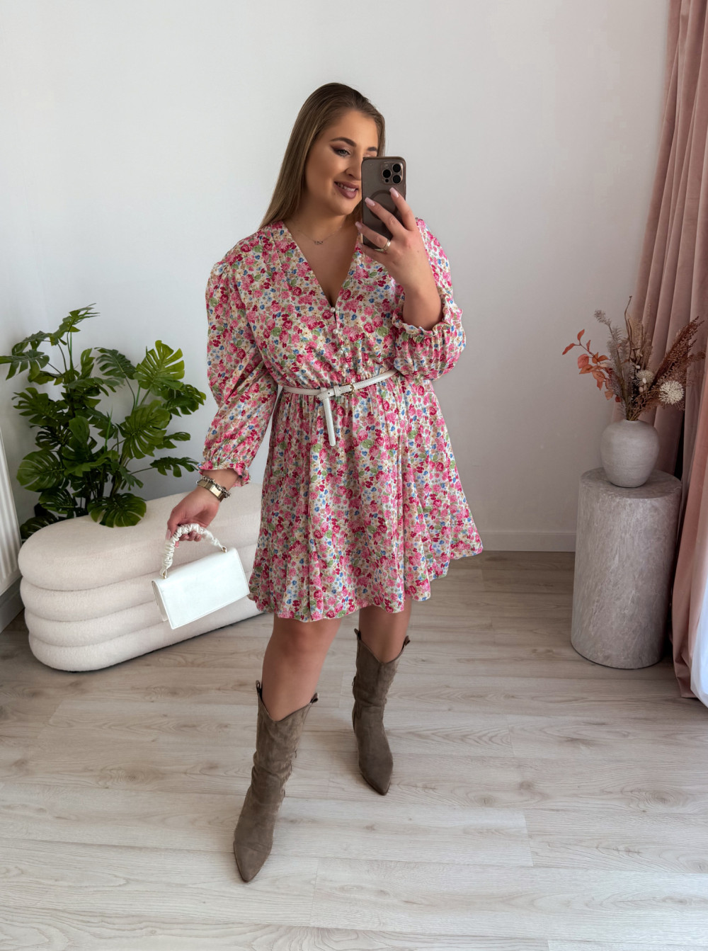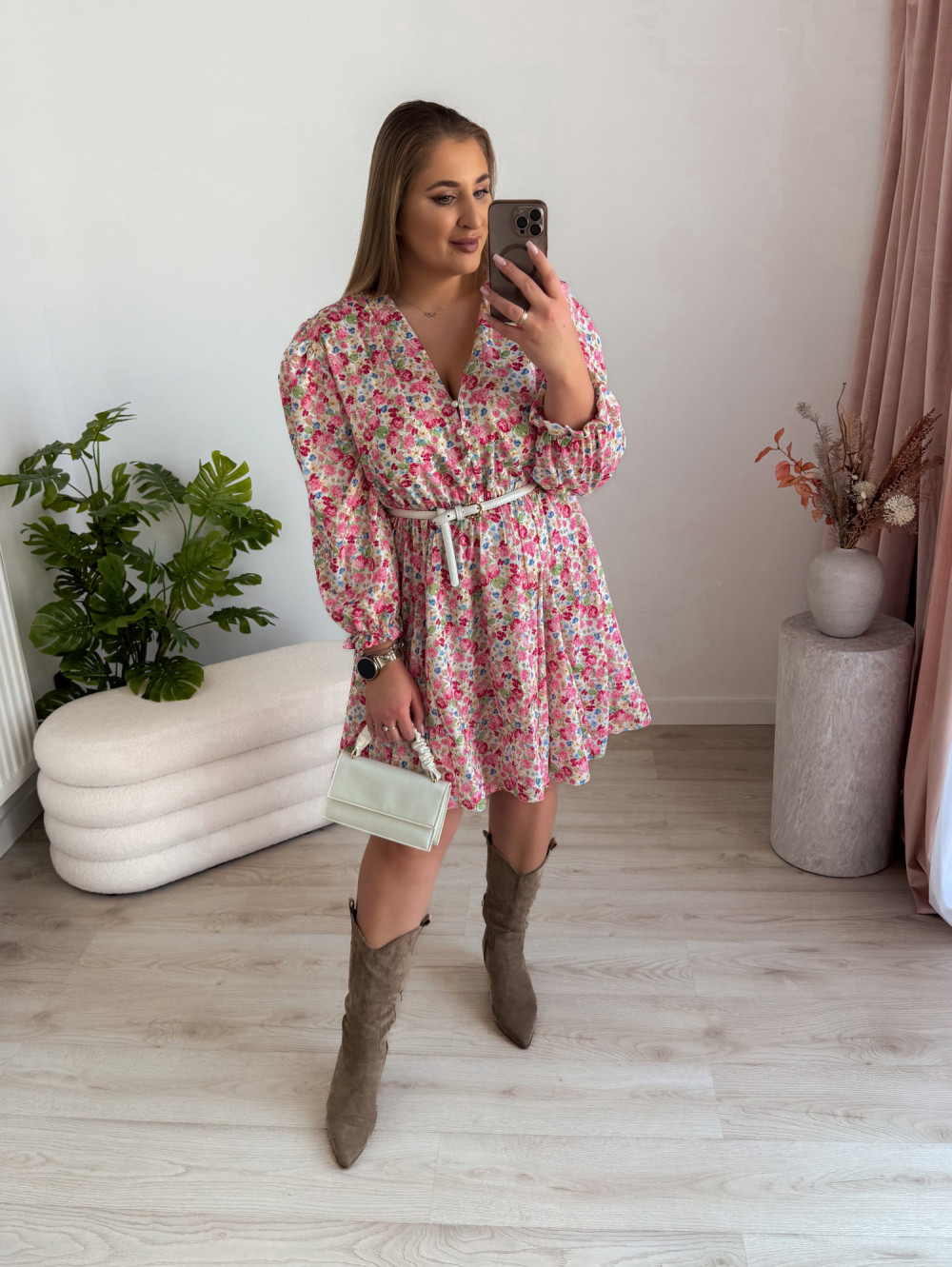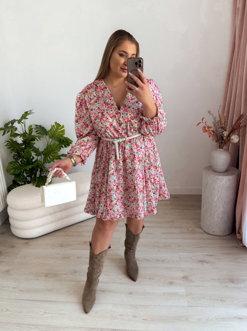 Sukienka krótka plus size biała w drobne różowo-niebieskie kwiatki Tatiana
