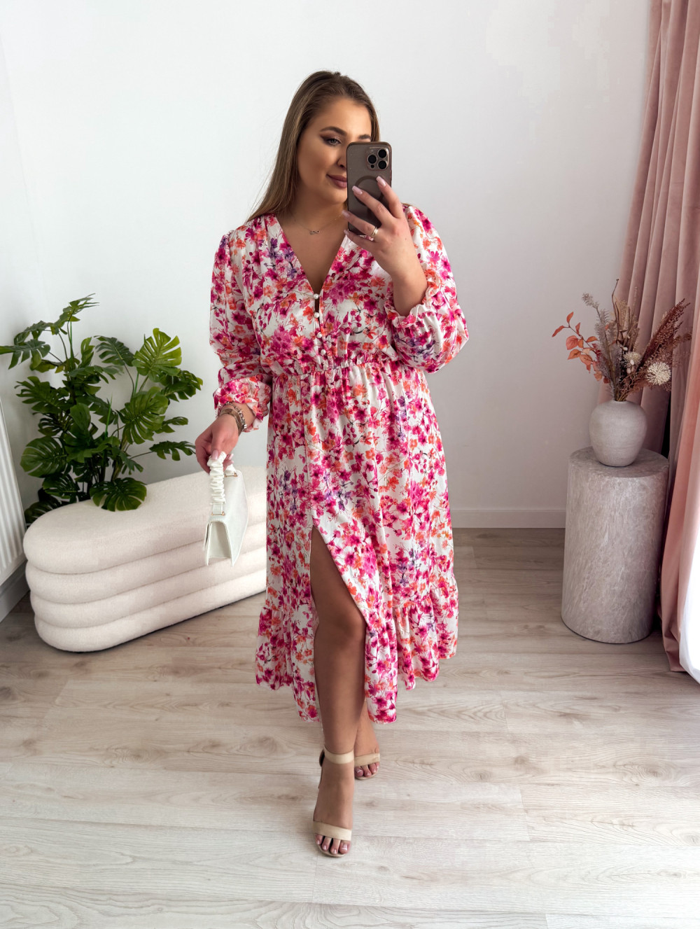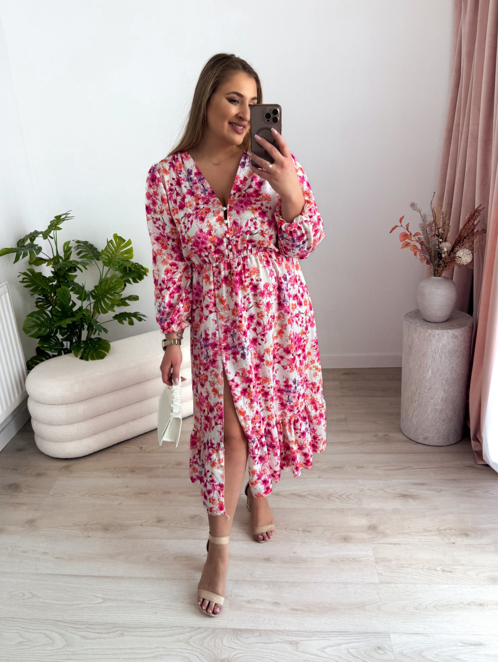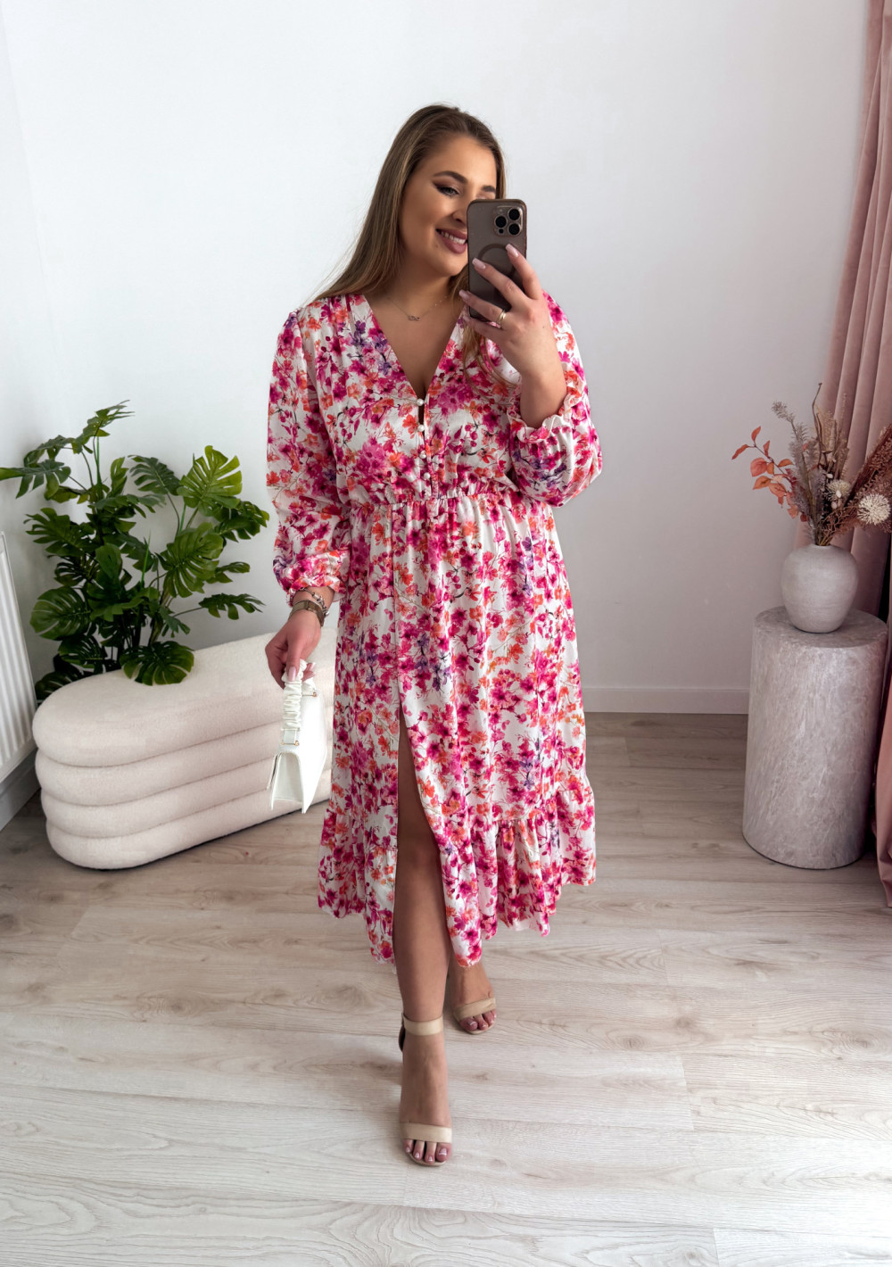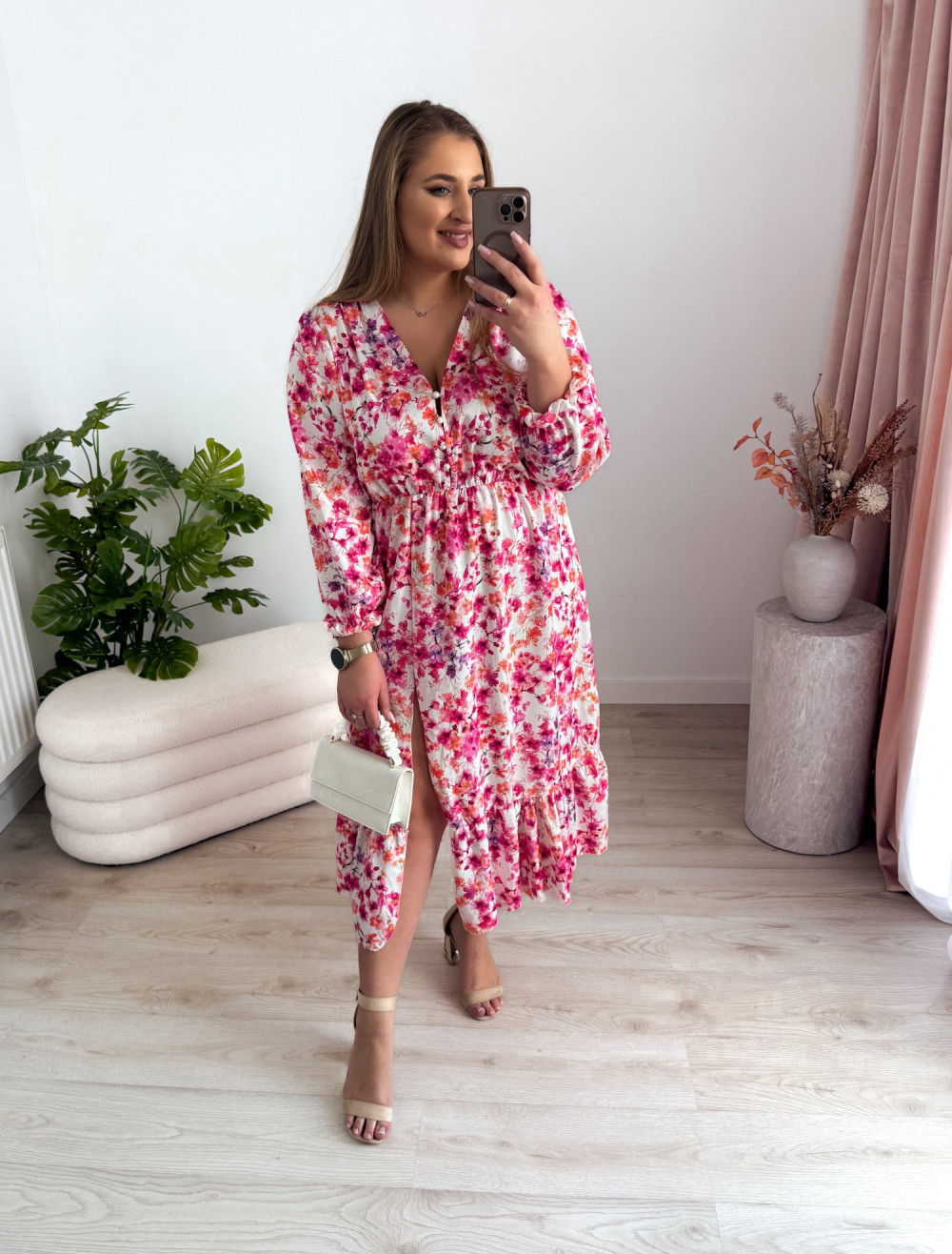 PREORDER Sukienka midi plus size biała w różowo-pomarańczowe kwiaty Marcella (wysyłka za ok. 5 dni)