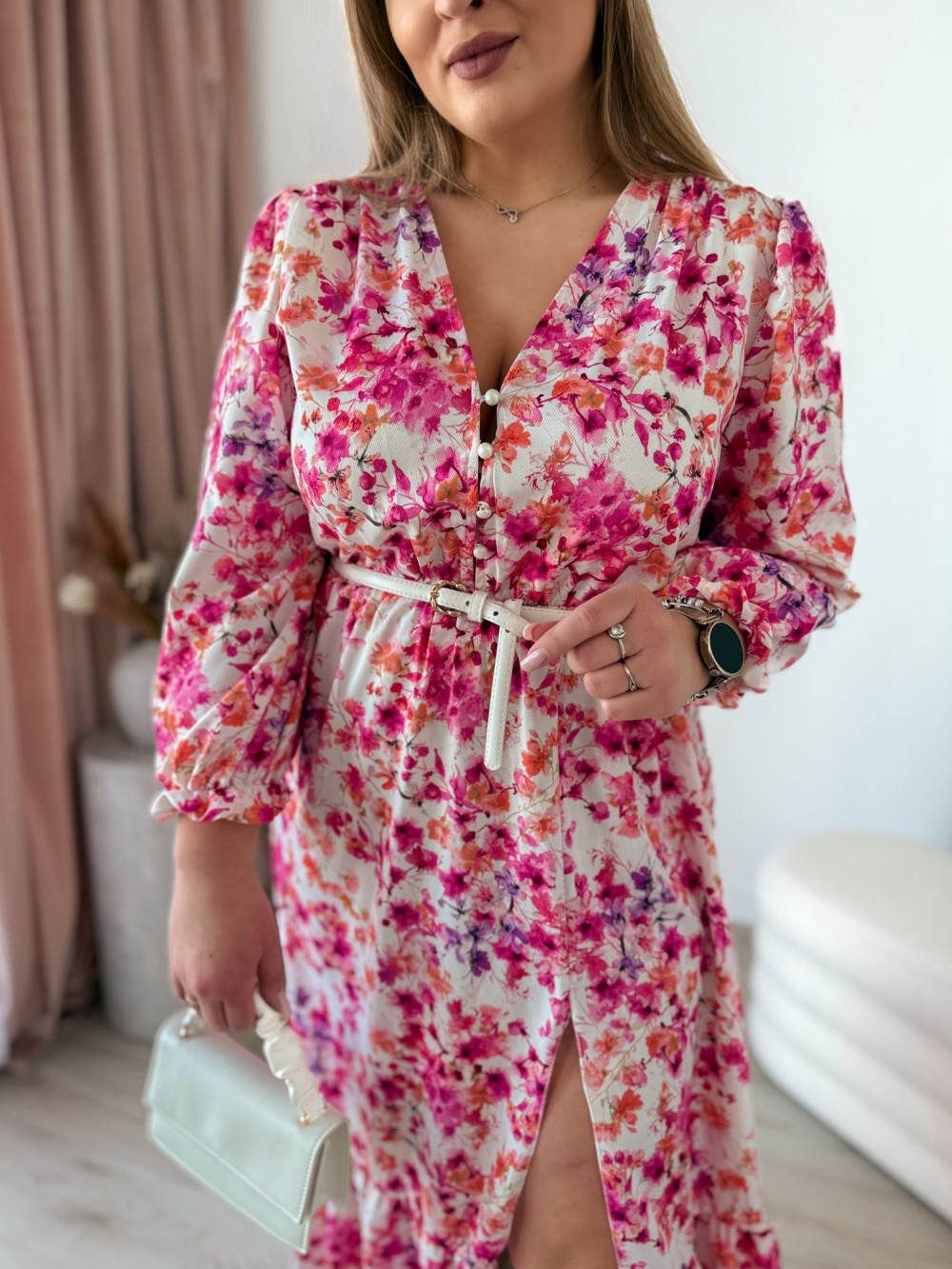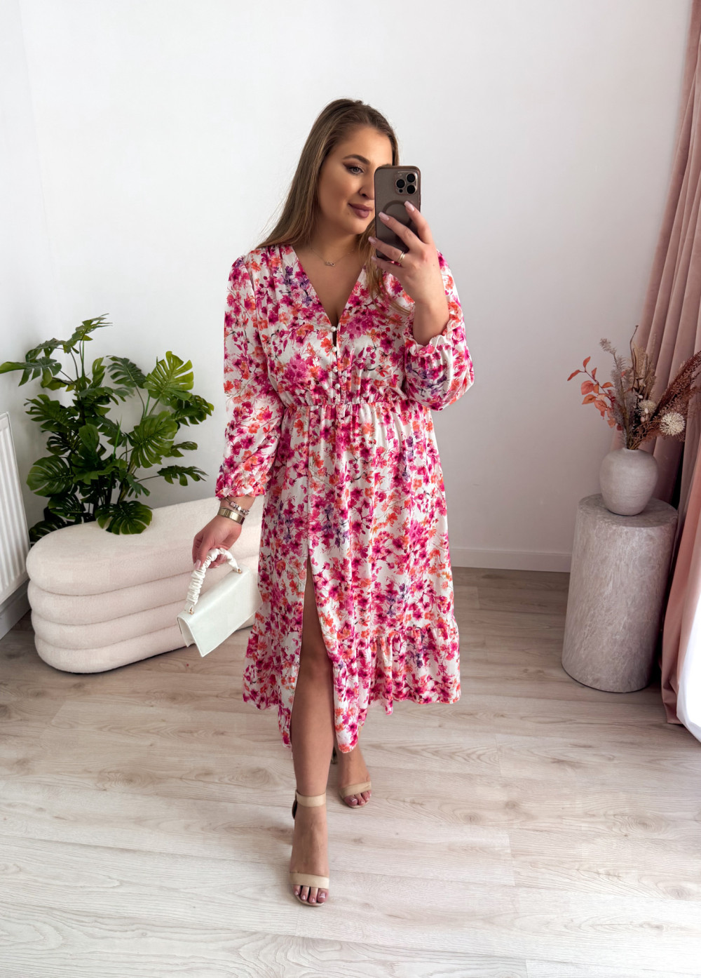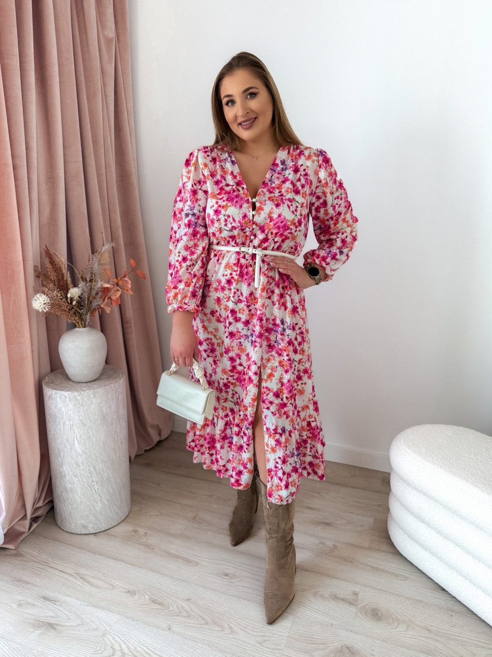 PREORDER Sukienka midi plus size biała w różowo-pomarańczowe kwiaty Marcella (wysyłka za ok. 5 dni)