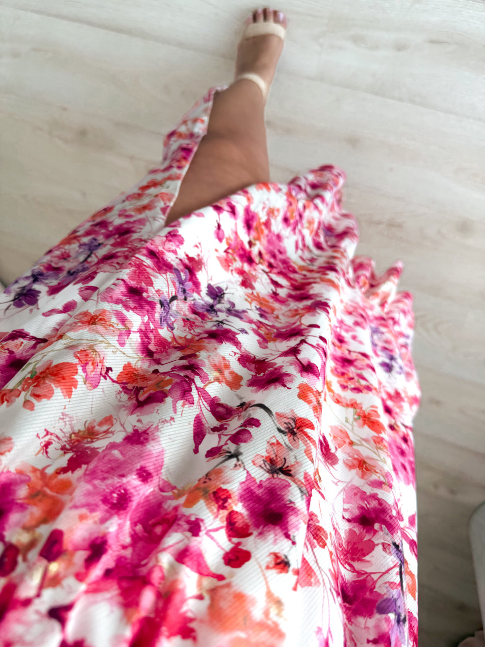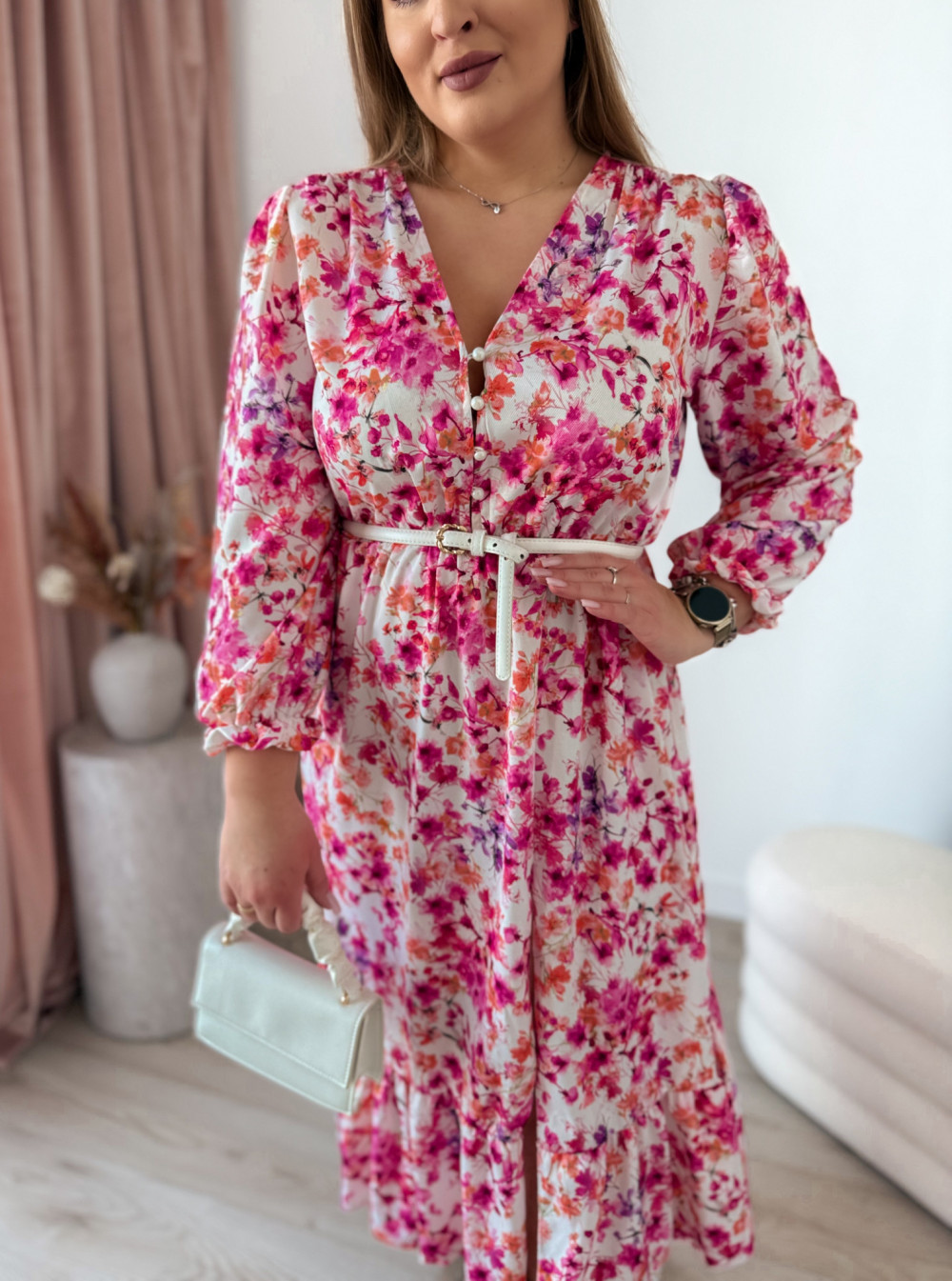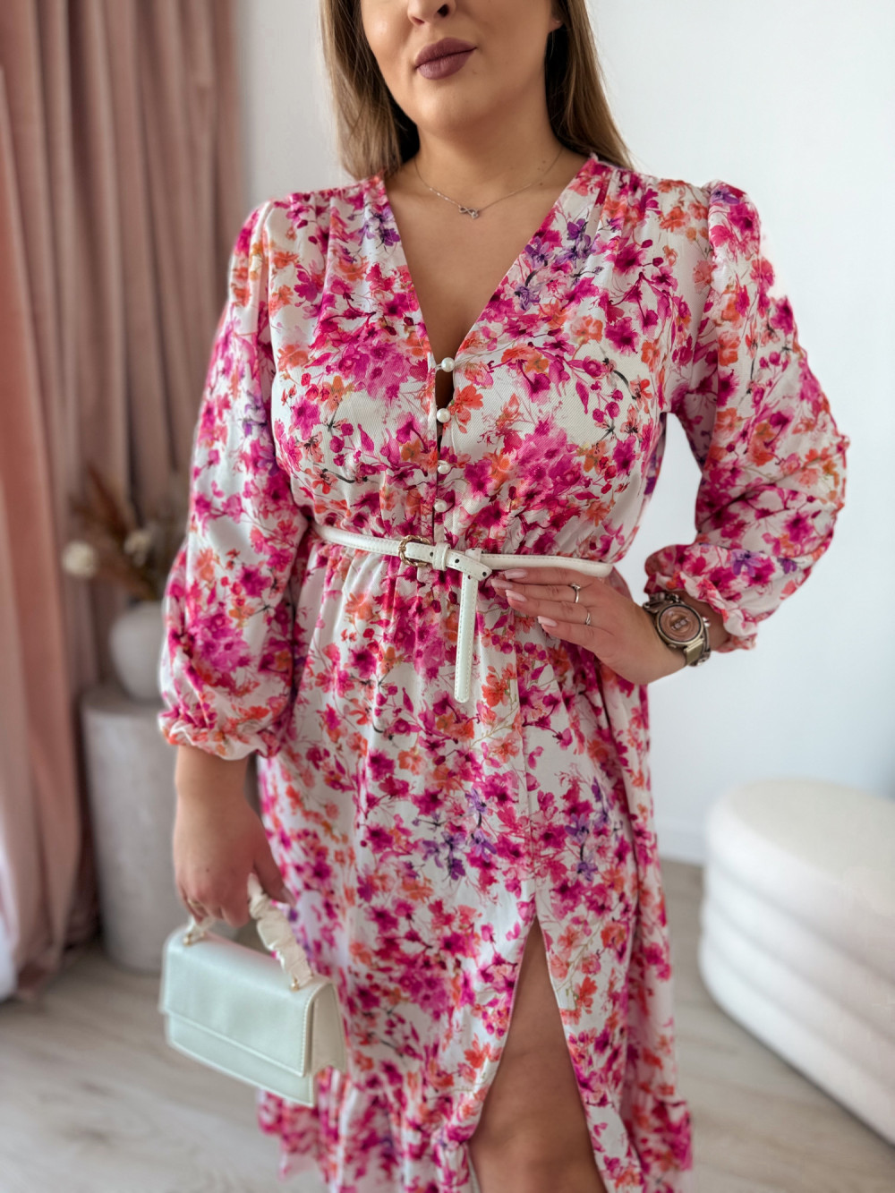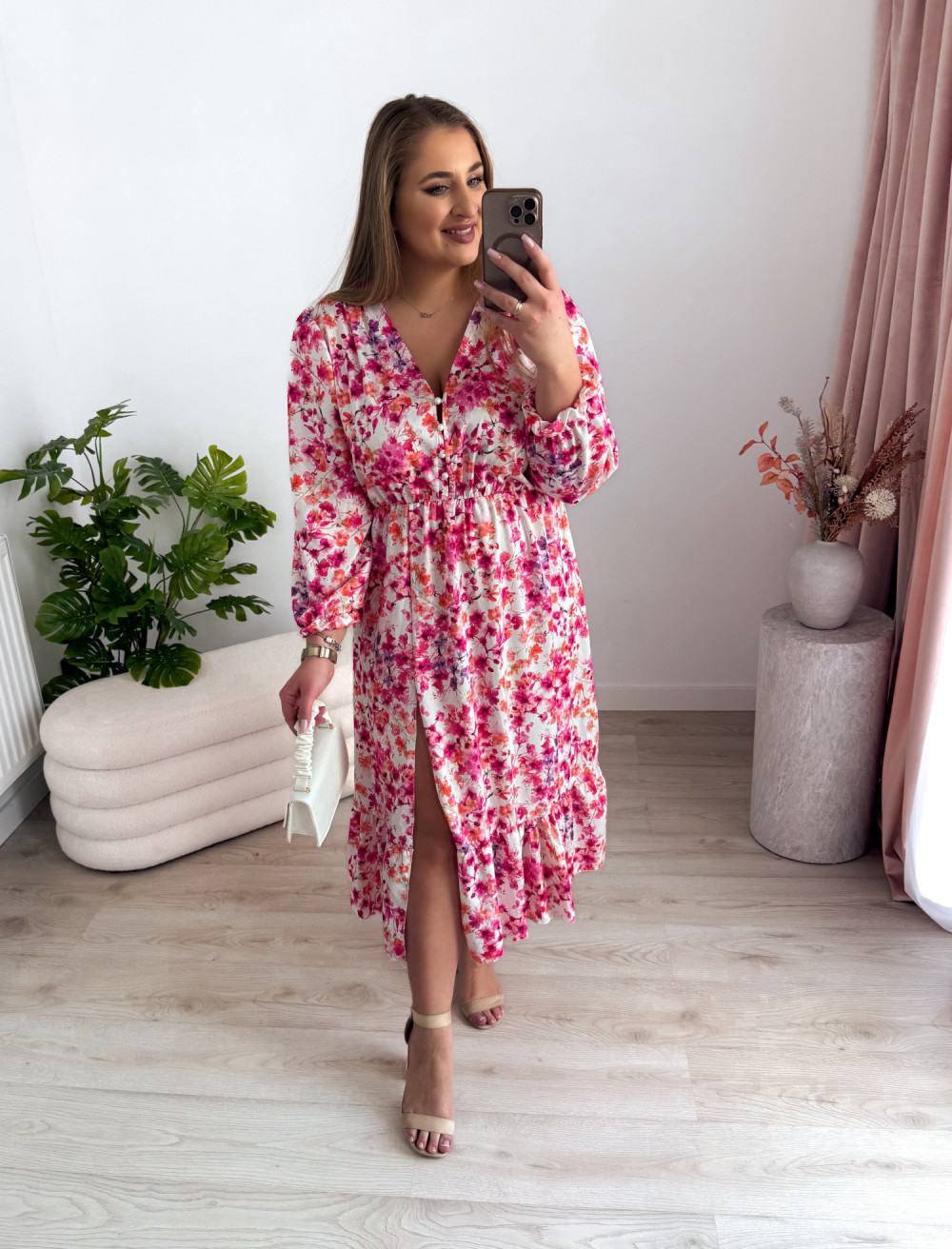 PREORDER Sukienka midi plus size biała w różowo-pomarańczowe kwiaty Marcella (wysyłka za ok. 5 dni)