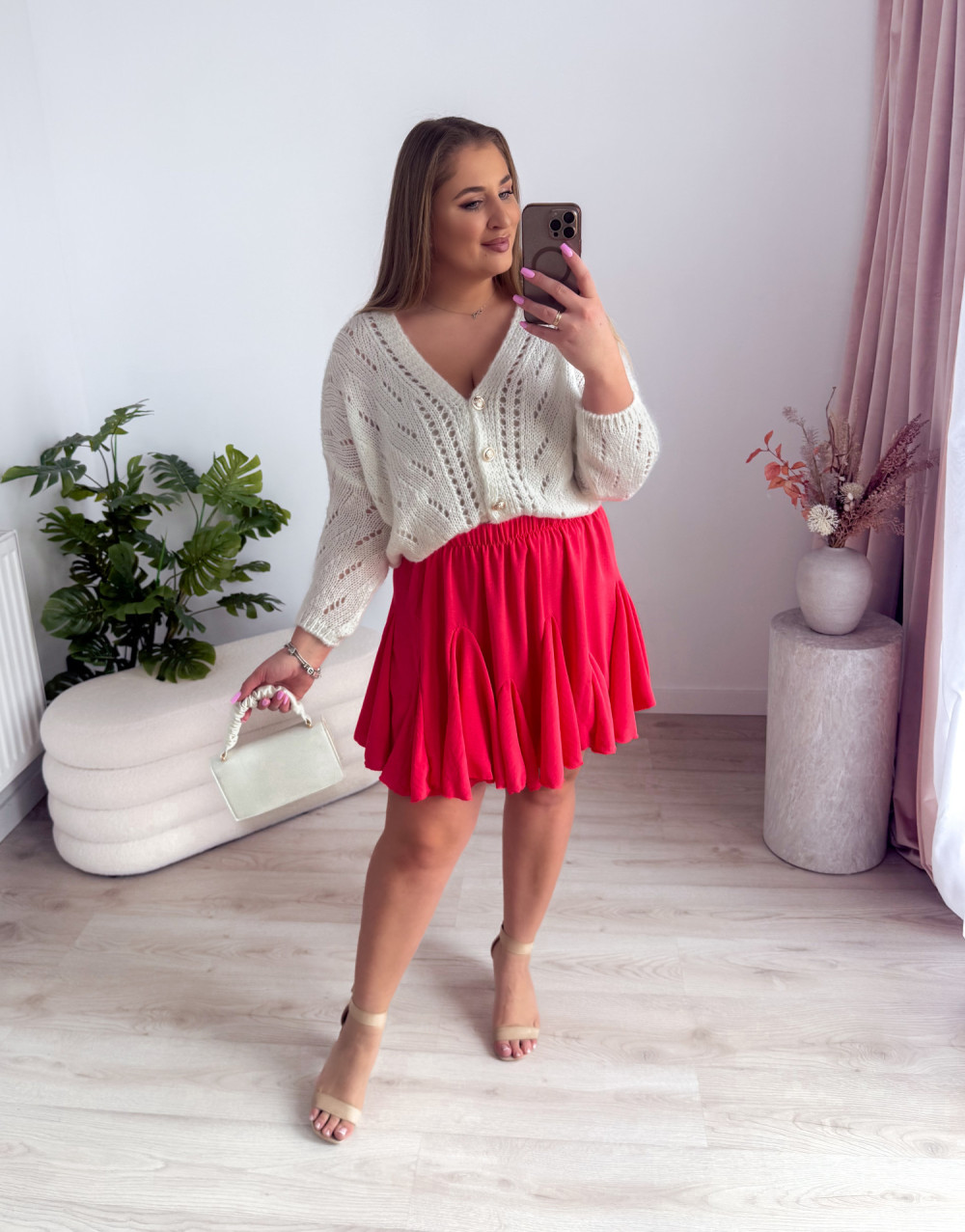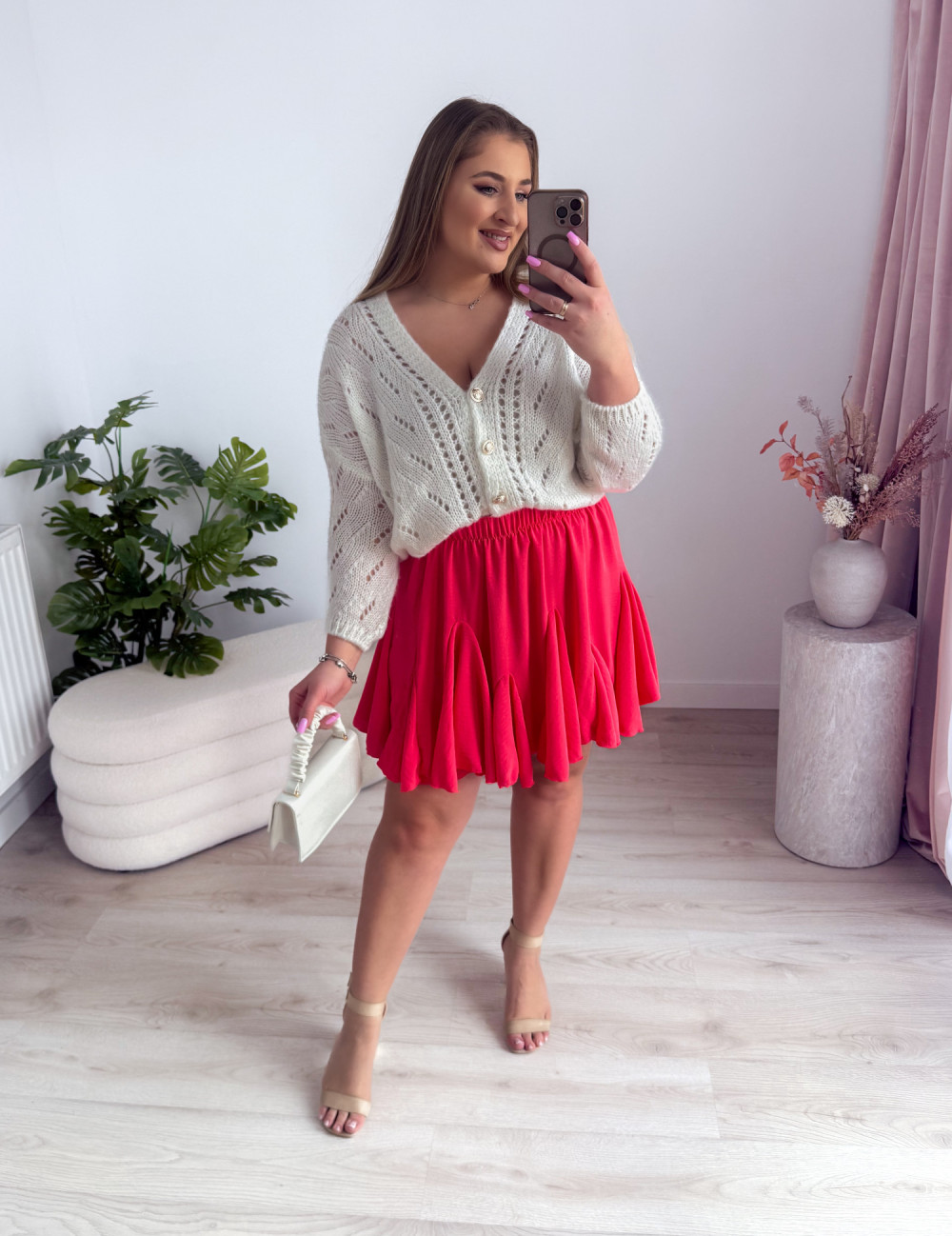 Urocza krótka spódniczka o rozkloszowanym kroju z zakładkami, która świetnie się układa, dodając sylwetce lekkości i kobiecego wdzięku. Gumka w pasie zapewnia komfort noszenia oraz idealne dopasowanie do figury. Doskonale komponuje się ze swetrami, koszulami czy bluzami, tworząc stylowe zestawy na co dzień i wyjątkowe okazje.