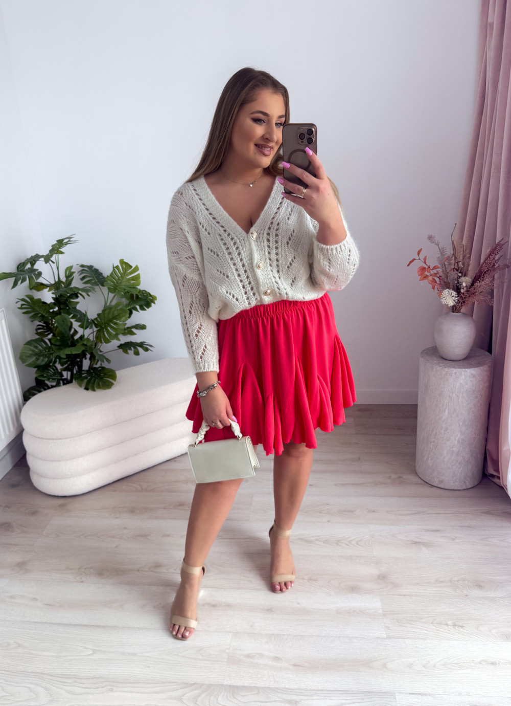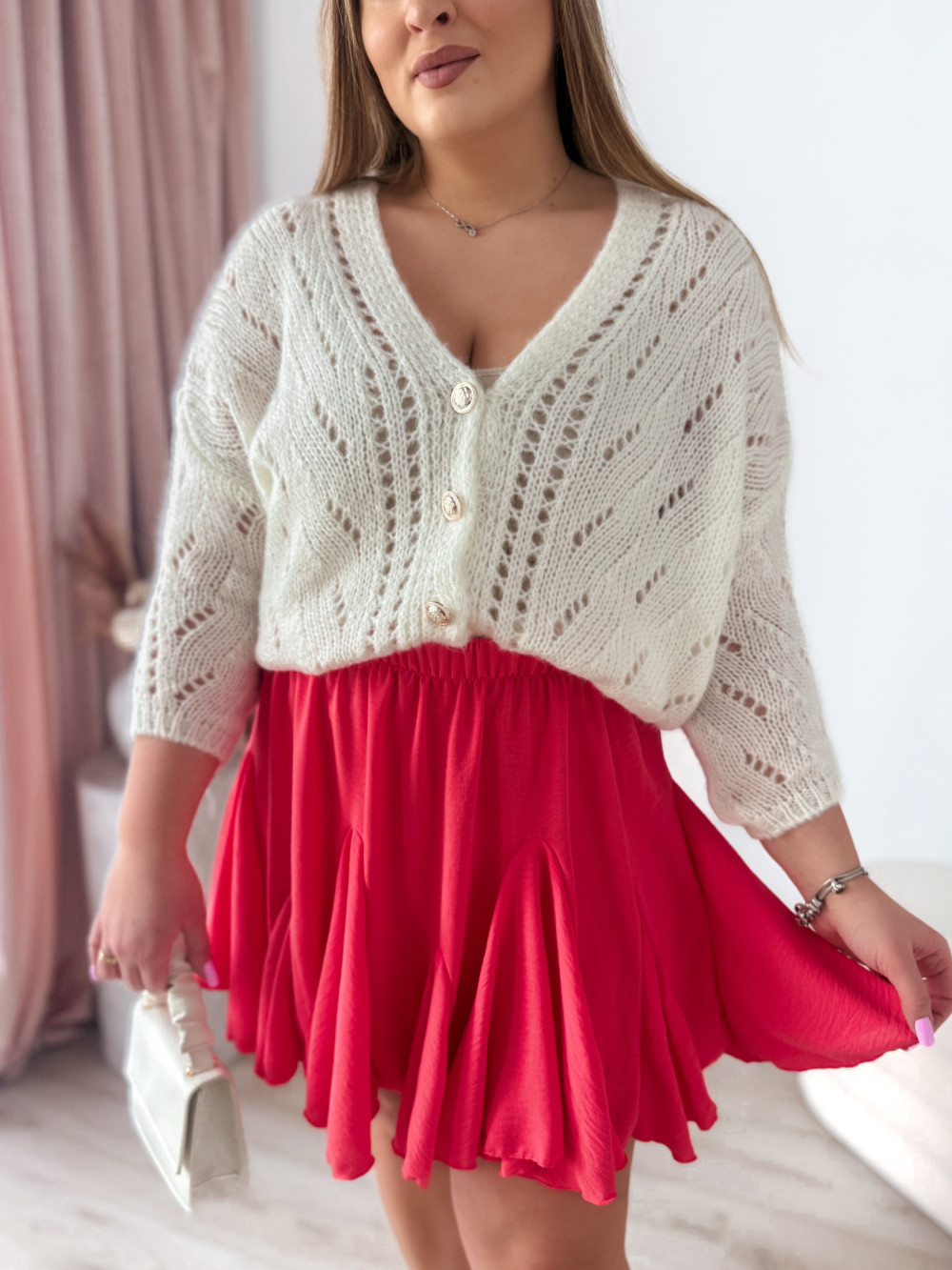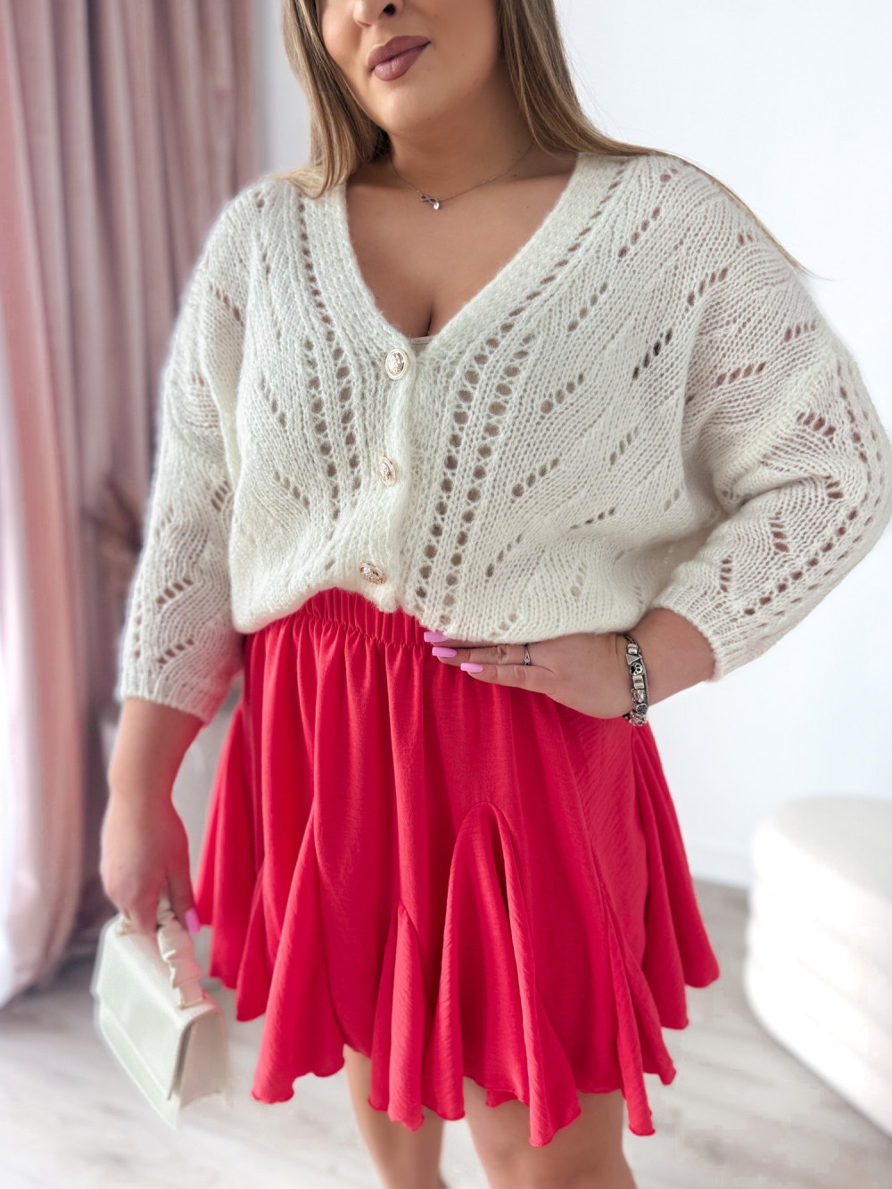 - Krótka, rozkloszowana spódniczka z zakładkami