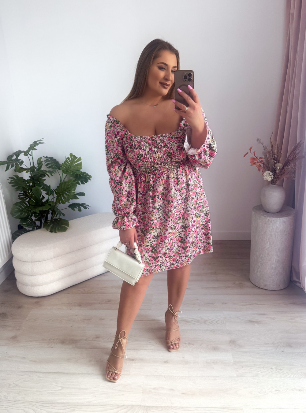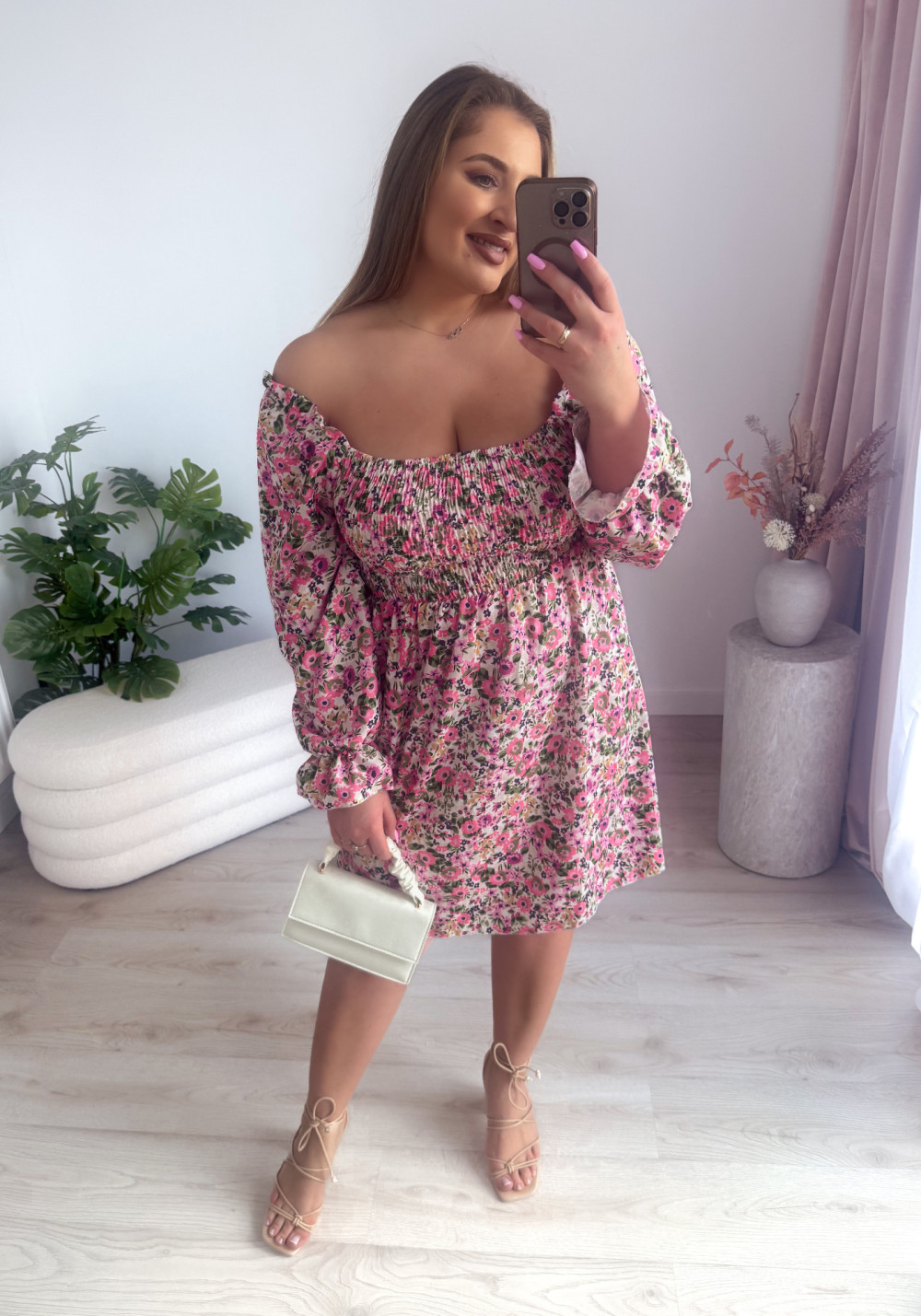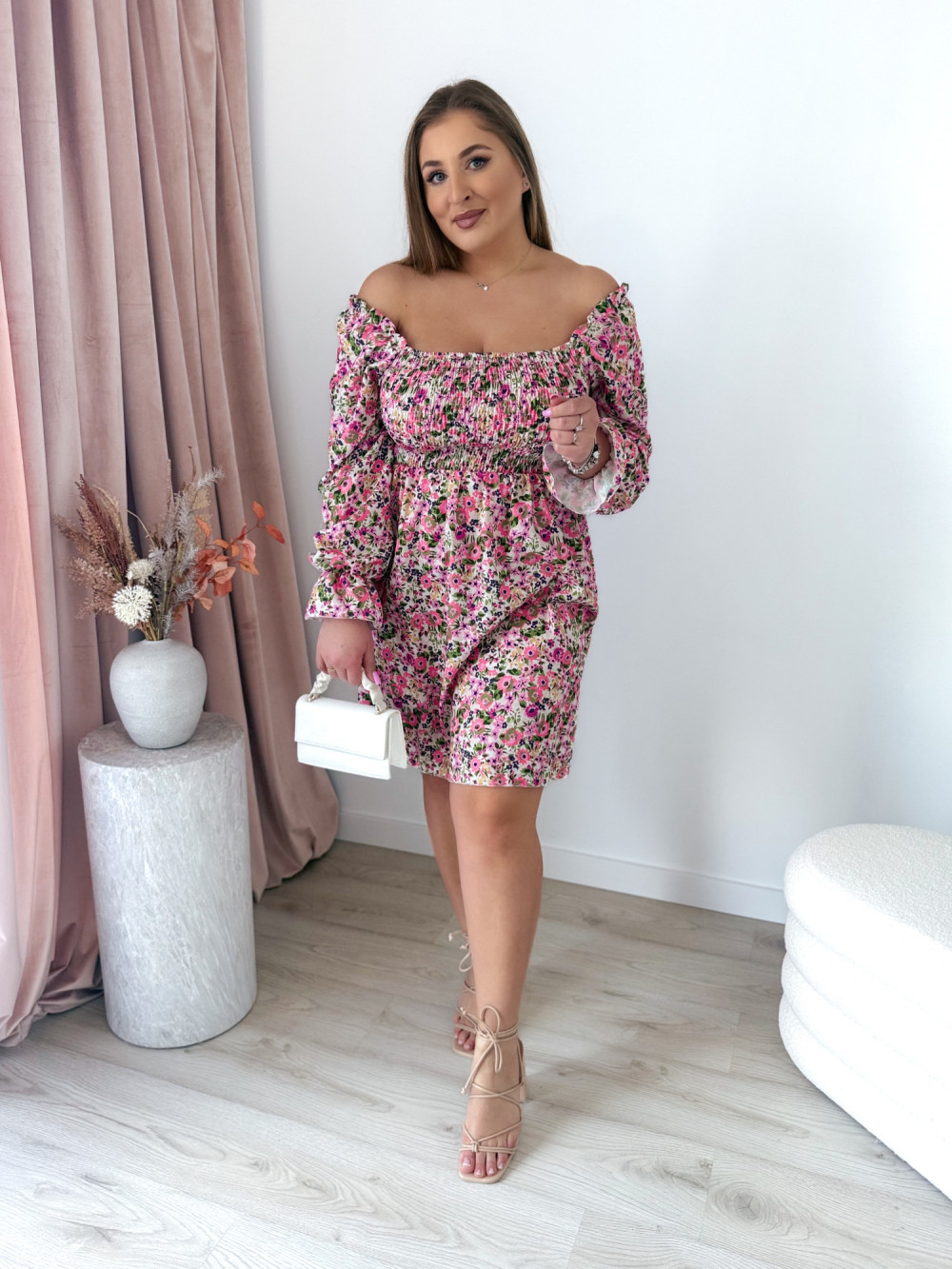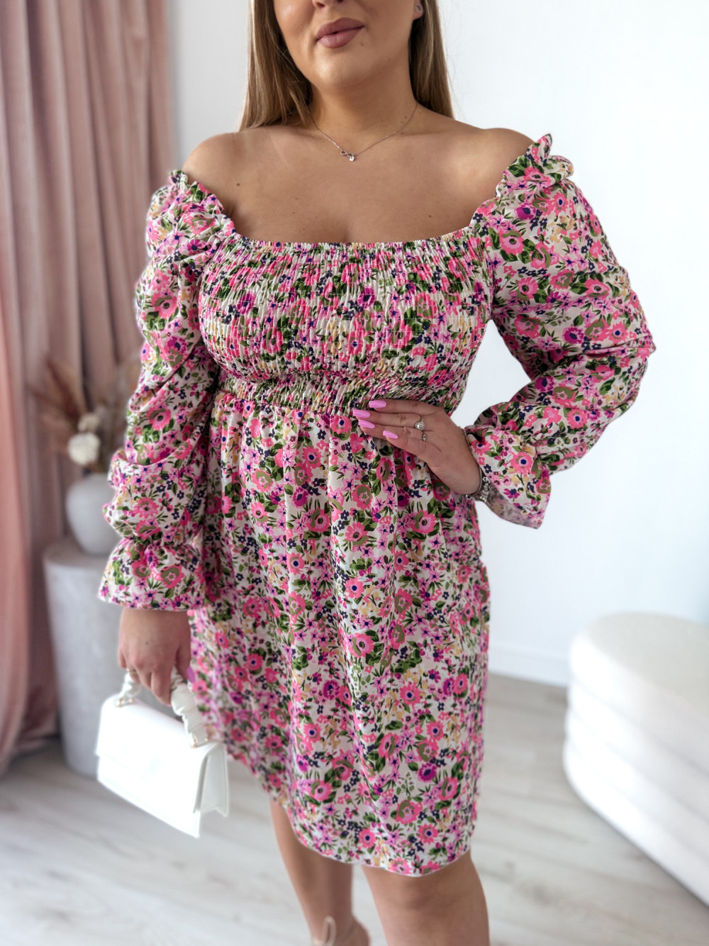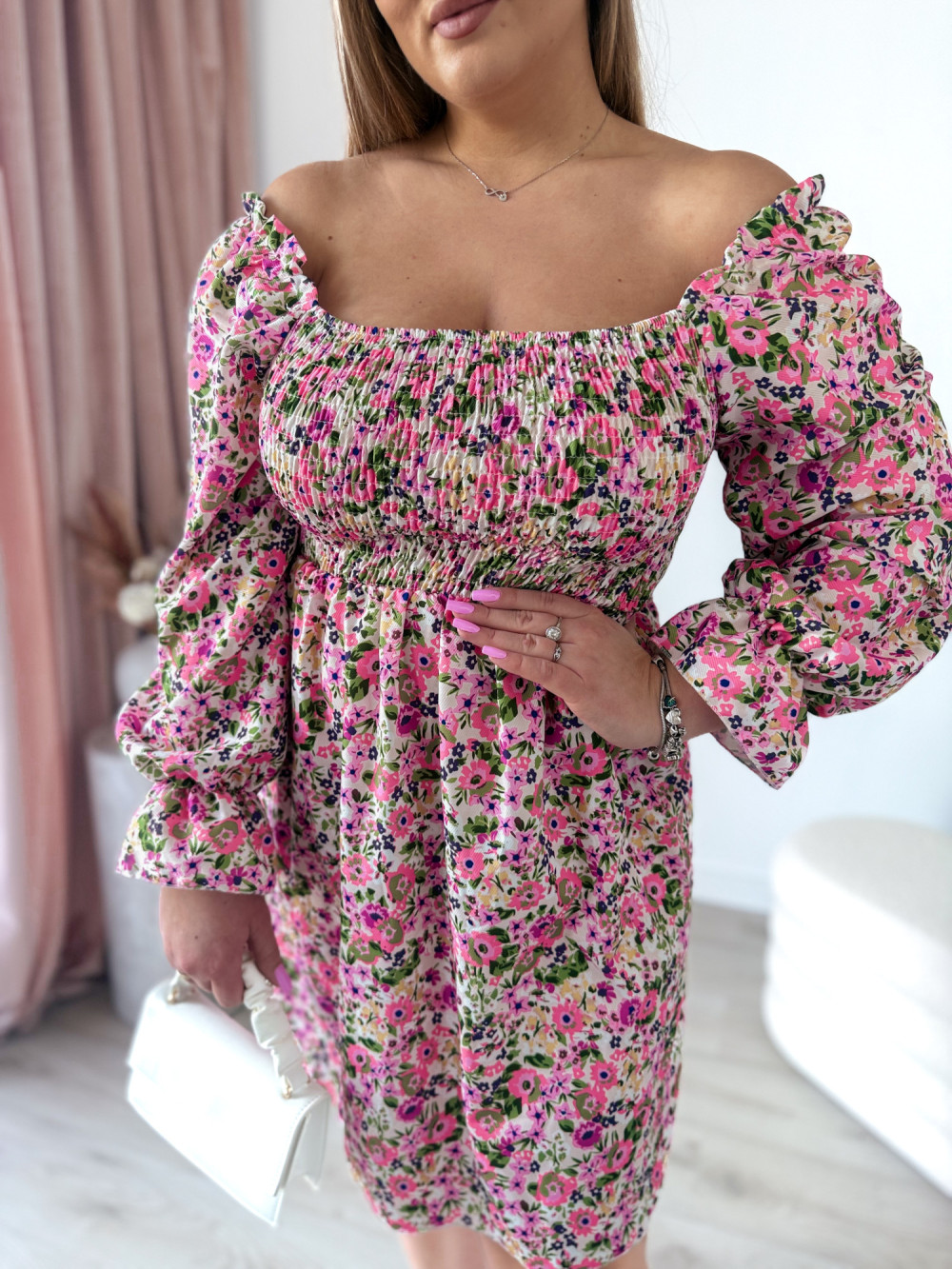 Sukienka z gumkami na dekolcie biała w kolorowe kwiaty Harper mini