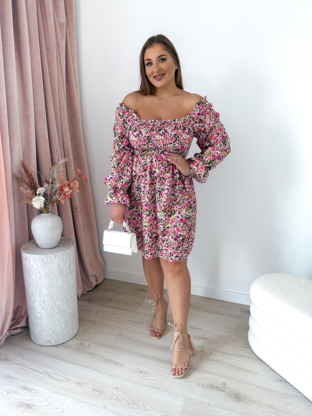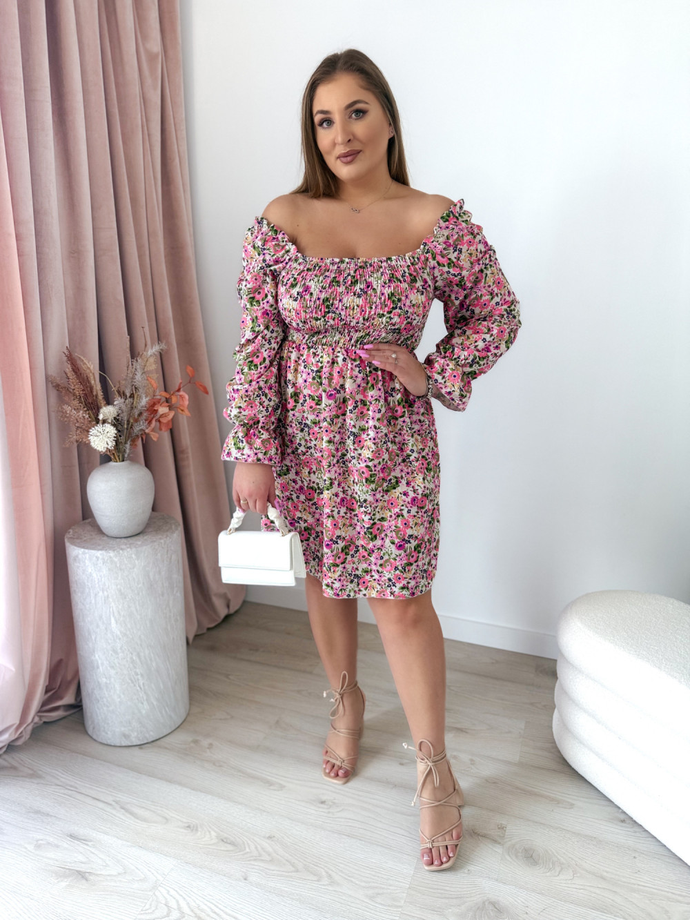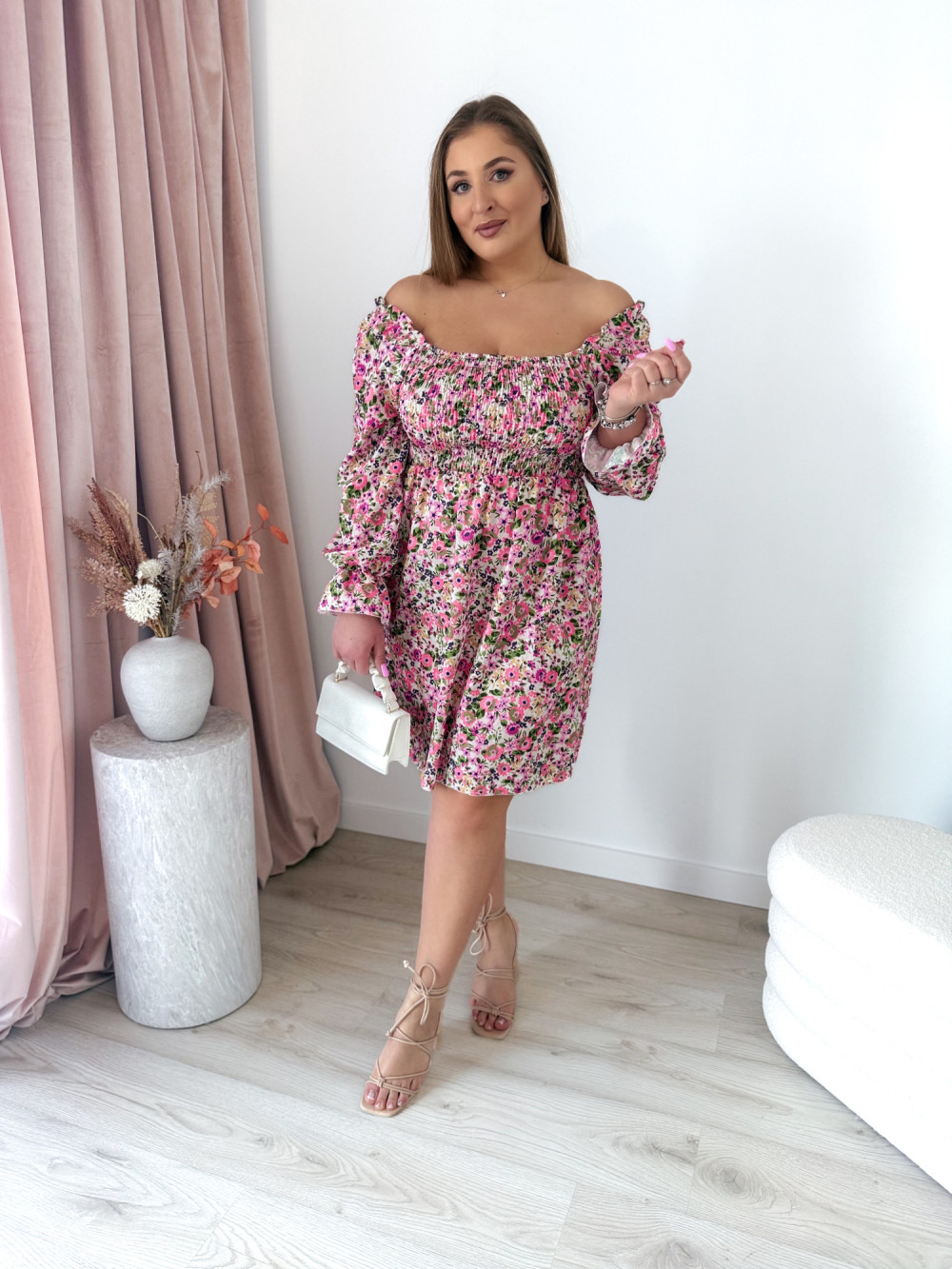 - Możliwość noszenia jako hiszpanka: Dzięki elastycznemu dekoltowi, sukienkę można nosić na ramionach lub zsunąć na barki, co daje możliwość dopasowania do różnych stylizacji.