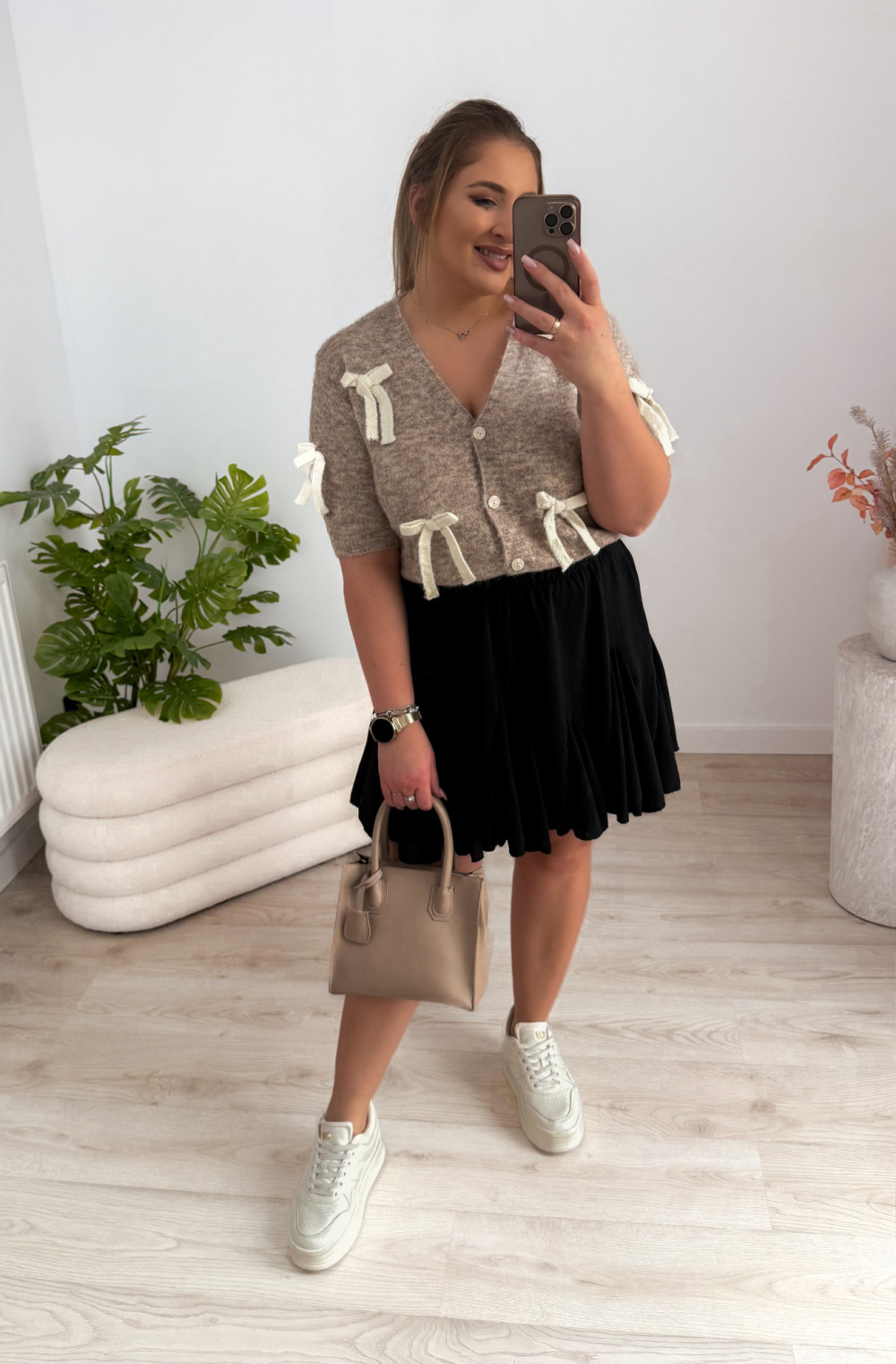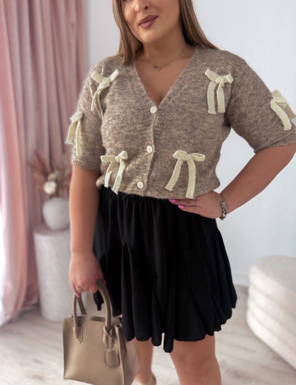 Uroczy, kobiecy sweter, który pięknie podkreśli każdą stylizację i doda jej delikatnego charakteru. Zapinany fason z krótkim rękawem sprawia, że jest idealny zarówno na co dzień, jak i na bardziej eleganckie wyjścia.