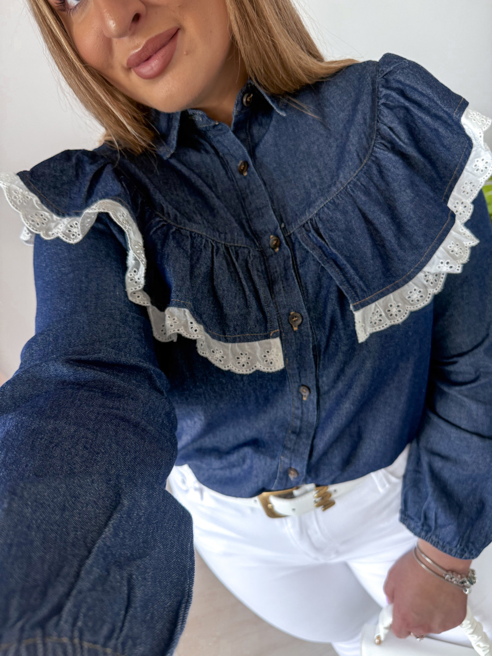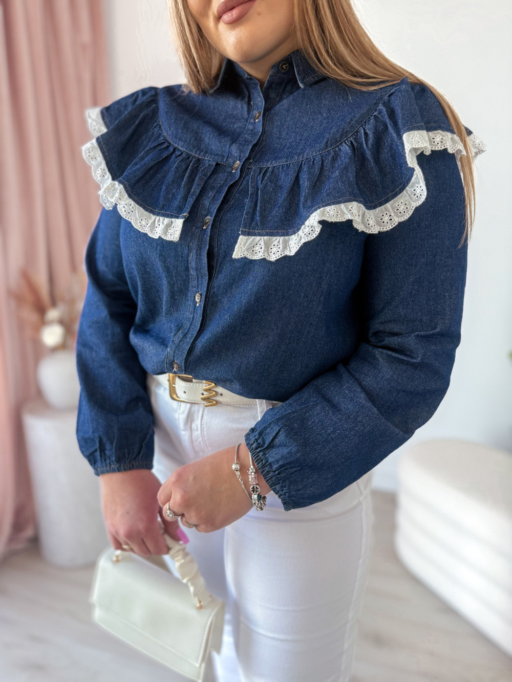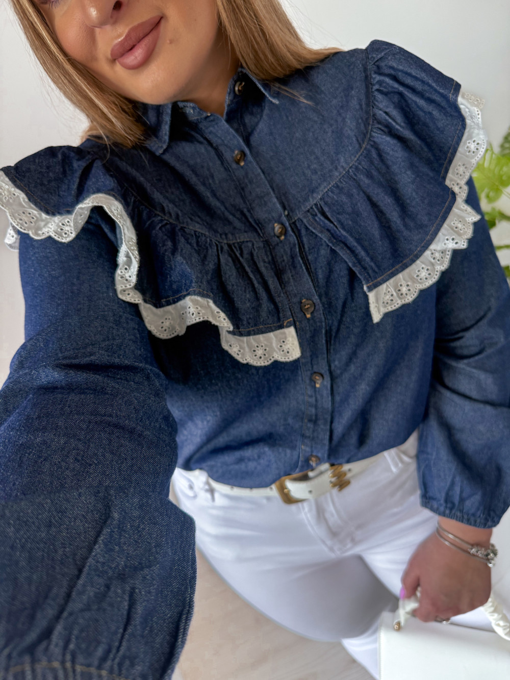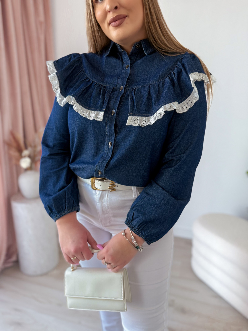 Koszula z miękkiego materiału imitującego ciemny jeans zachwyca nietuzinkowym połączeniem klasyki z romantycznym detalem. Ozdobny kołnierz z koronkową falbanką nadaje jej eleganckiego, wyjątkowego charakteru i sprawia, że wyróżnia się na tle standardowych modeli.
