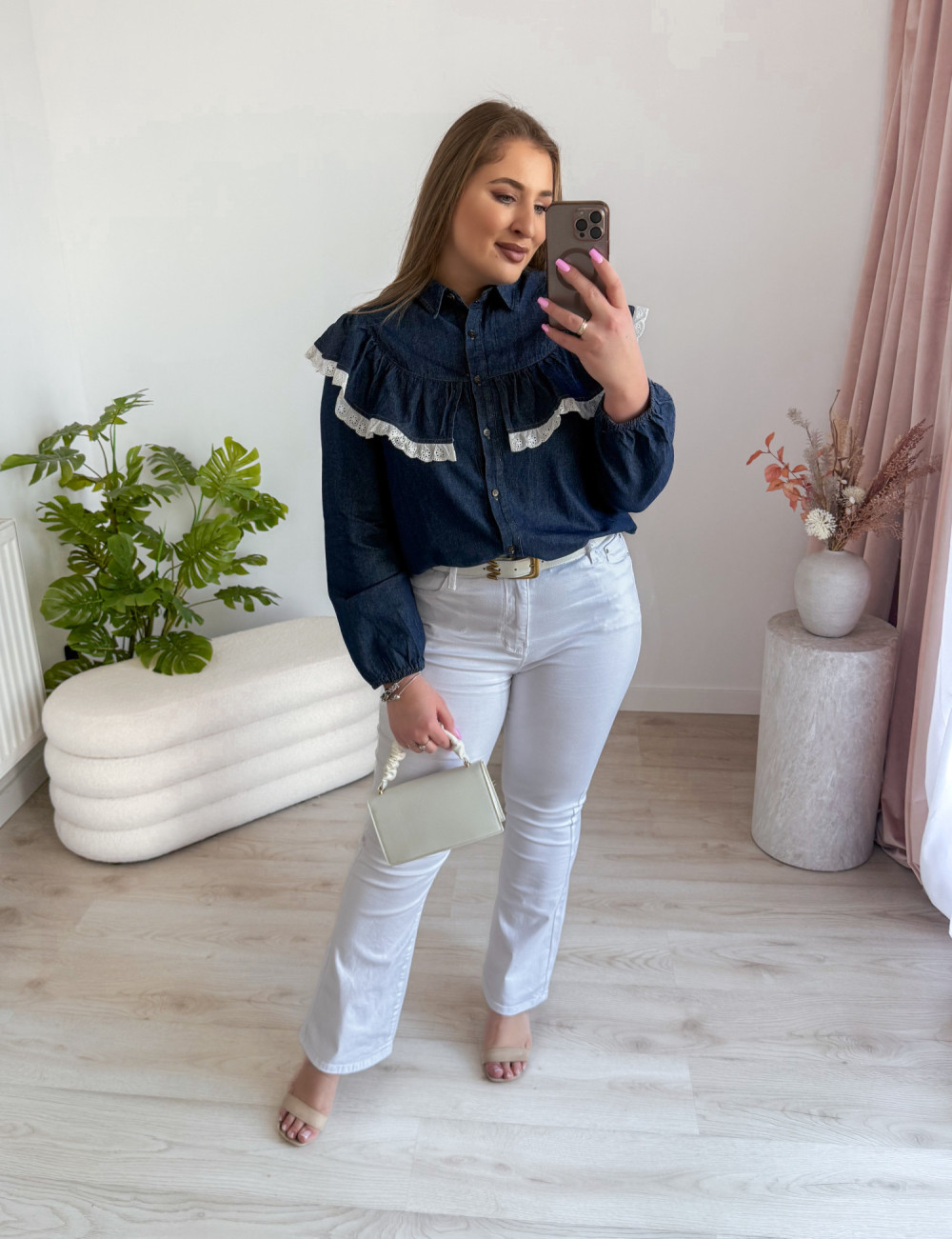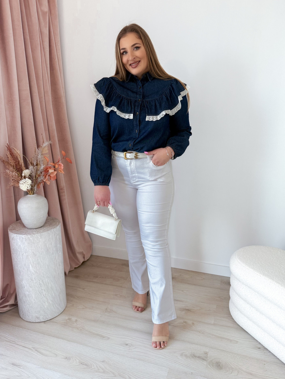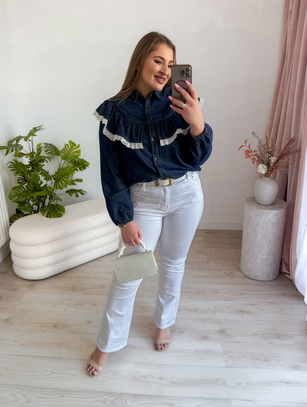 Koszula z miękkiego materiału imitującego ciemny jeans zachwyca nietuzinkowym połączeniem klasyki z romantycznym detalem. Ozdobny kołnierz z koronkową falbanką nadaje jej eleganckiego, wyjątkowego charakteru i sprawia, że wyróżnia się na tle standardowych modeli.