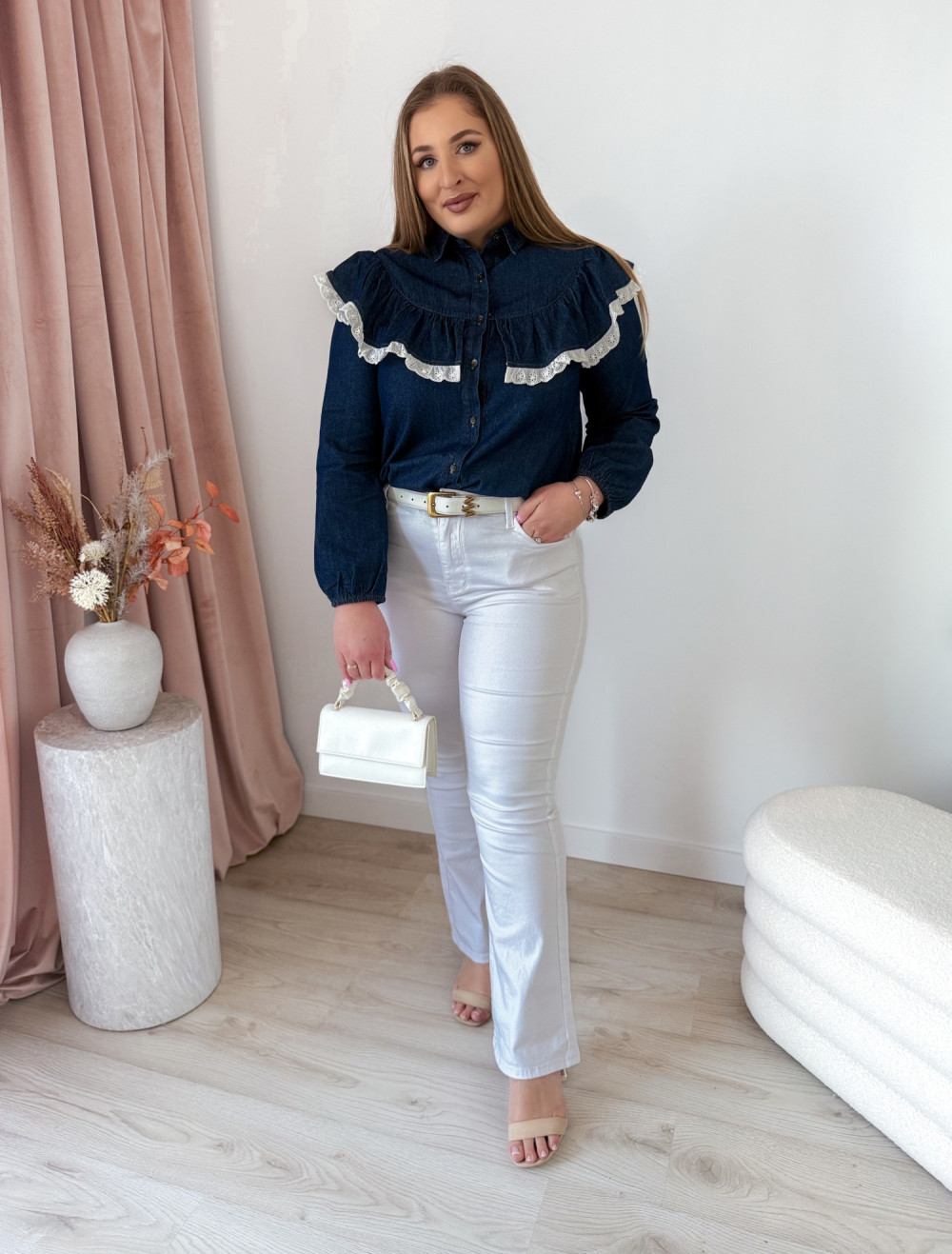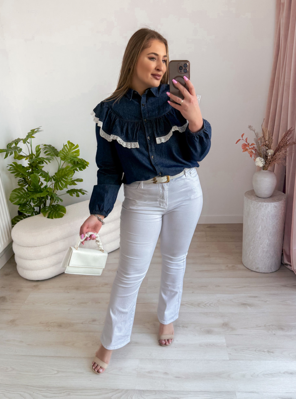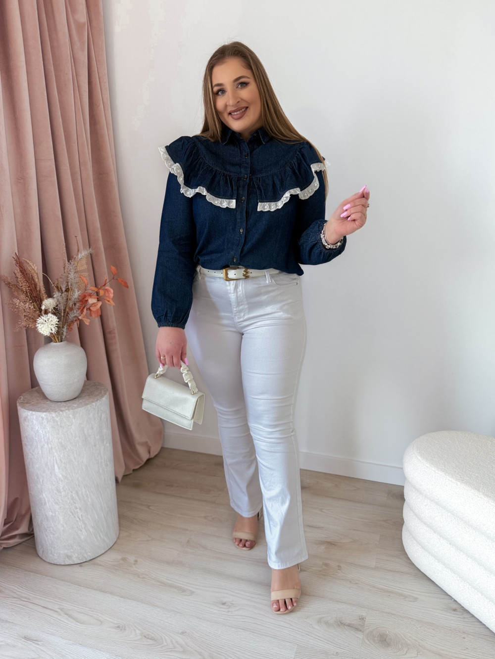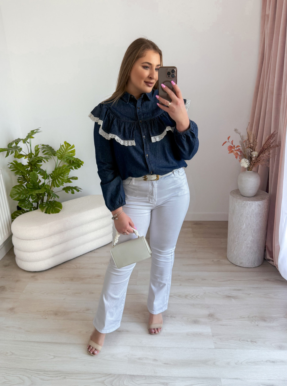 Koszula z miękkiego materiału imitującego ciemny jeans zachwyca nietuzinkowym połączeniem klasyki z romantycznym detalem. Ozdobny kołnierz z koronkową falbanką nadaje jej eleganckiego, wyjątkowego charakteru i sprawia, że wyróżnia się na tle standardowych modeli.