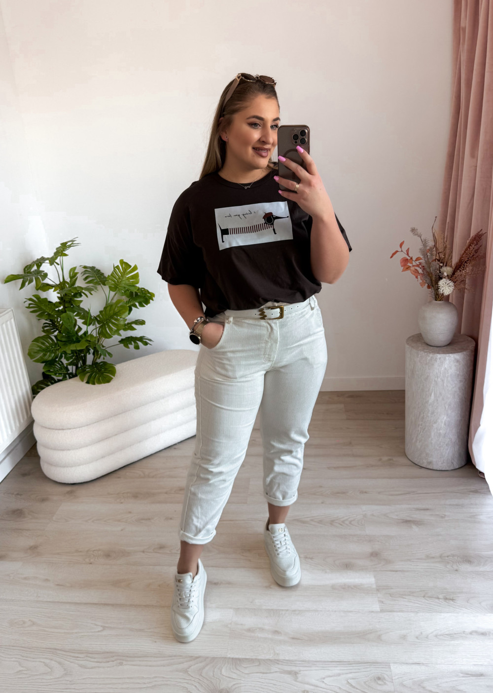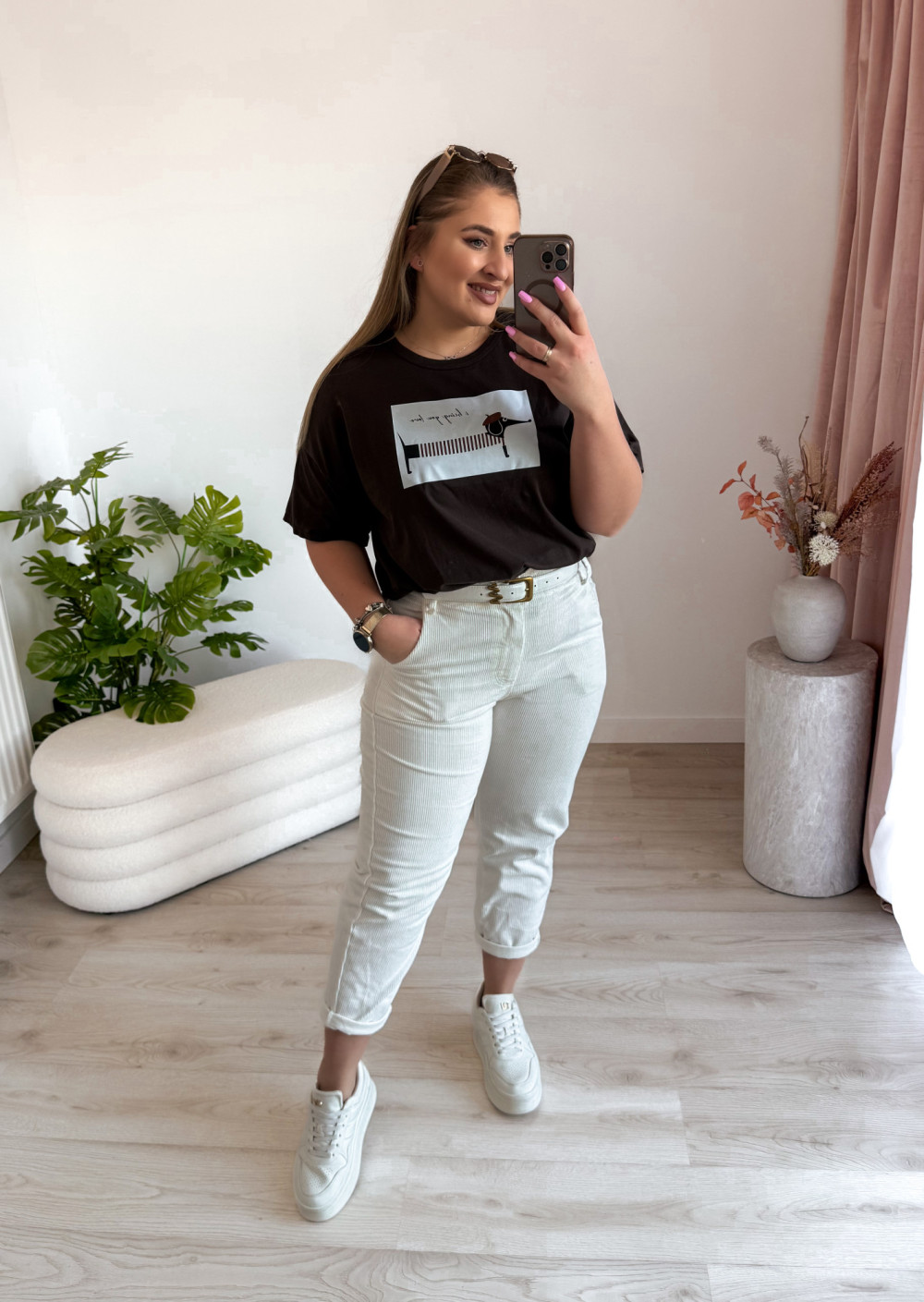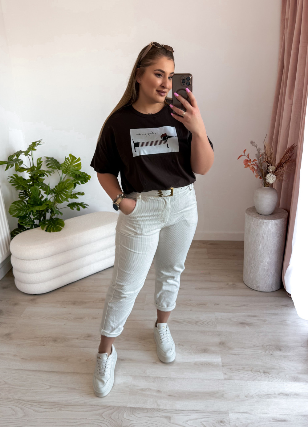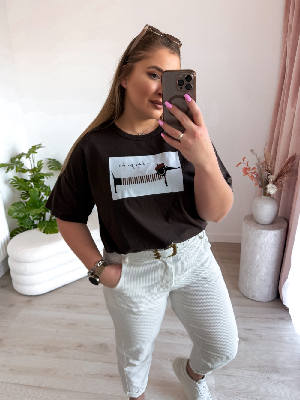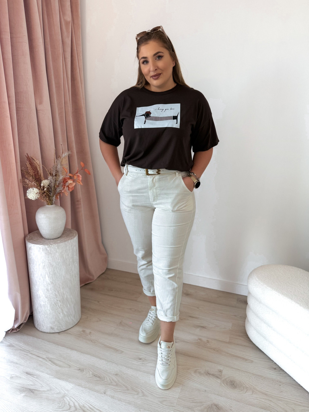 Luźna bluzka oversize z uroczym nadrukiem jamnika to idealna propozycja dla miłośniczek wygodnych i stylowych looków. Krótki rękaw oraz swobodny fason zapewniają komfort noszenia, a zabawny print dodaje całości charakteru.