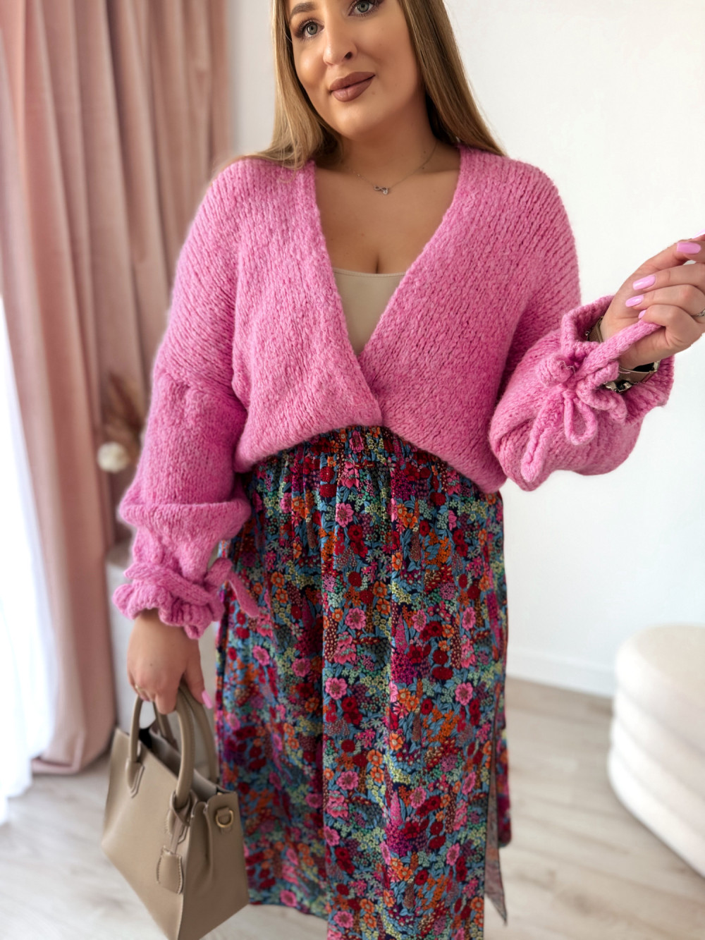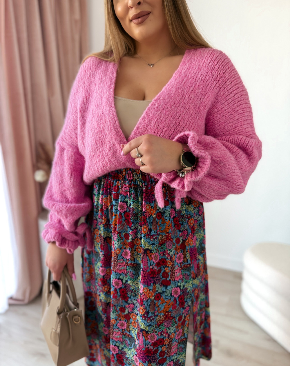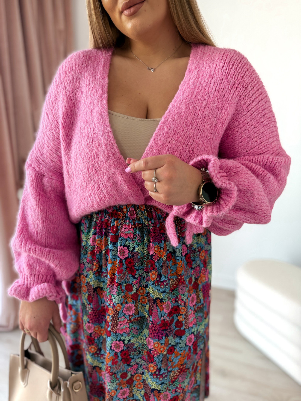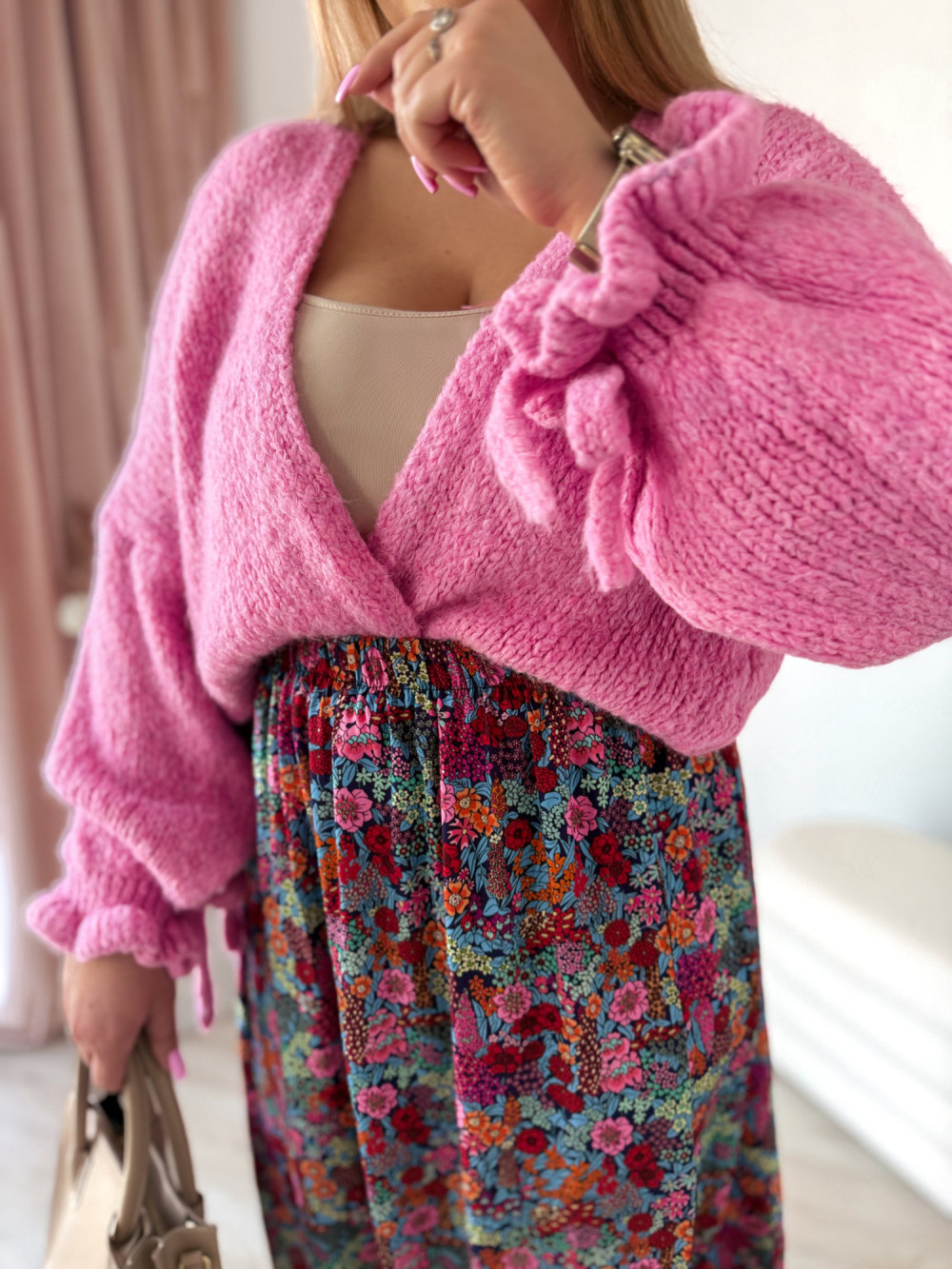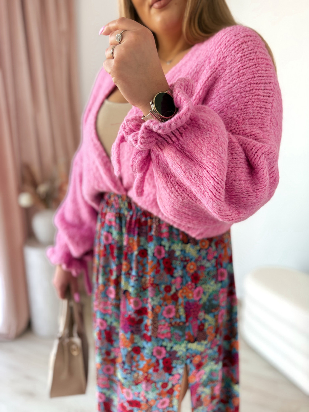 Ten kardigan to wyjątkowe połączenie wygody i subtelnej kobiecości. Delikatna kokardka na rękawie dodaje mu uroku i sprawia, że nawet prosta stylizacja wygląda bardziej stylowo.