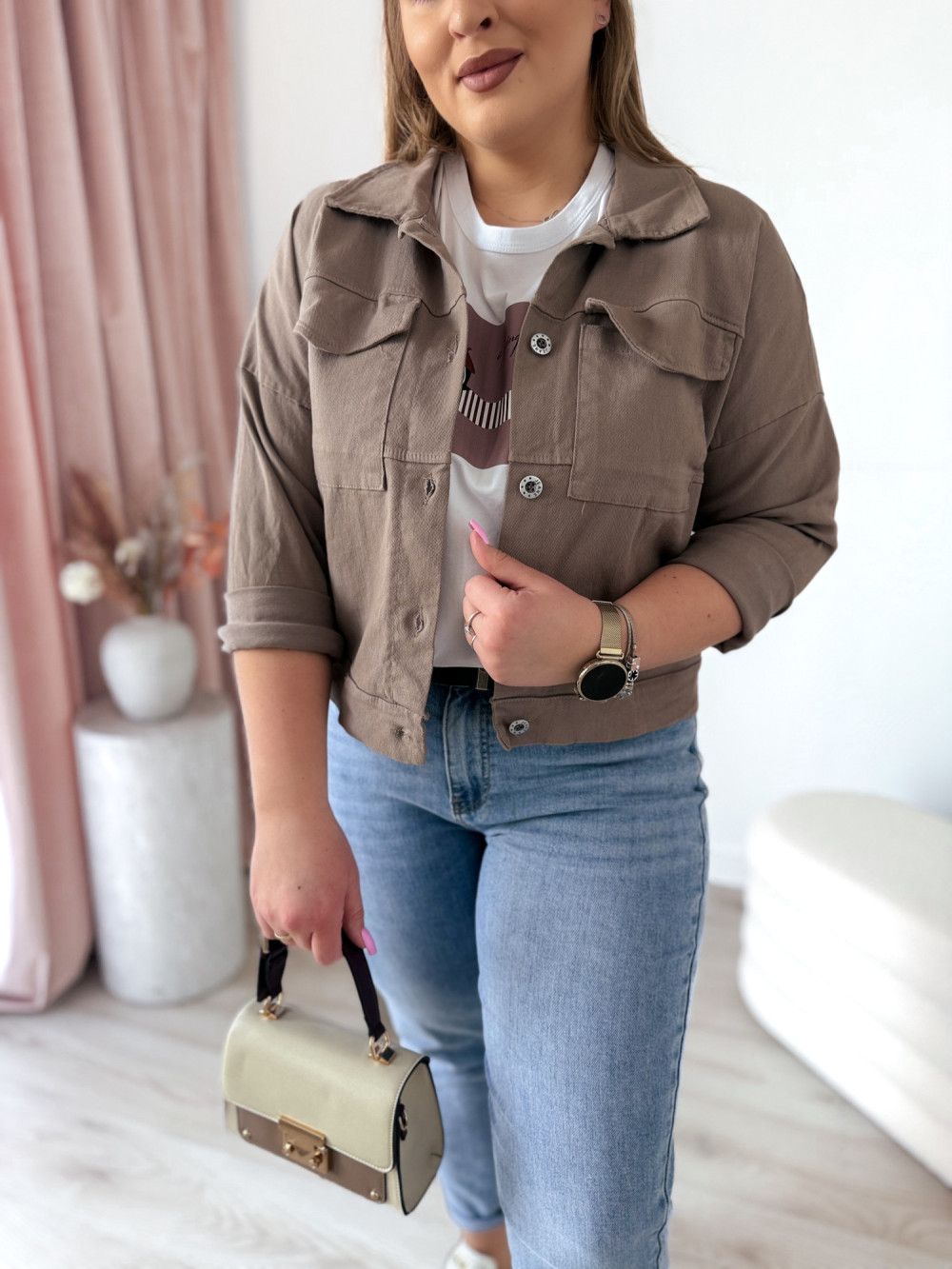Krótka katana z miękkiego jeansu to ponadczasowy element garderoby, który świetnie dopełni wiele stylizacji. Gładki materiał i luźniejszy krój sprawiają, że jest niezwykle wygodna, a jednocześnie stylowa i łatwa do łączenia z różnymi ubraniami.