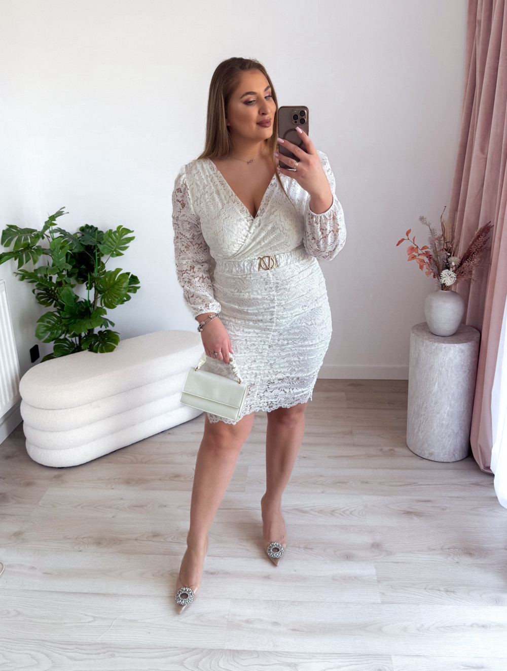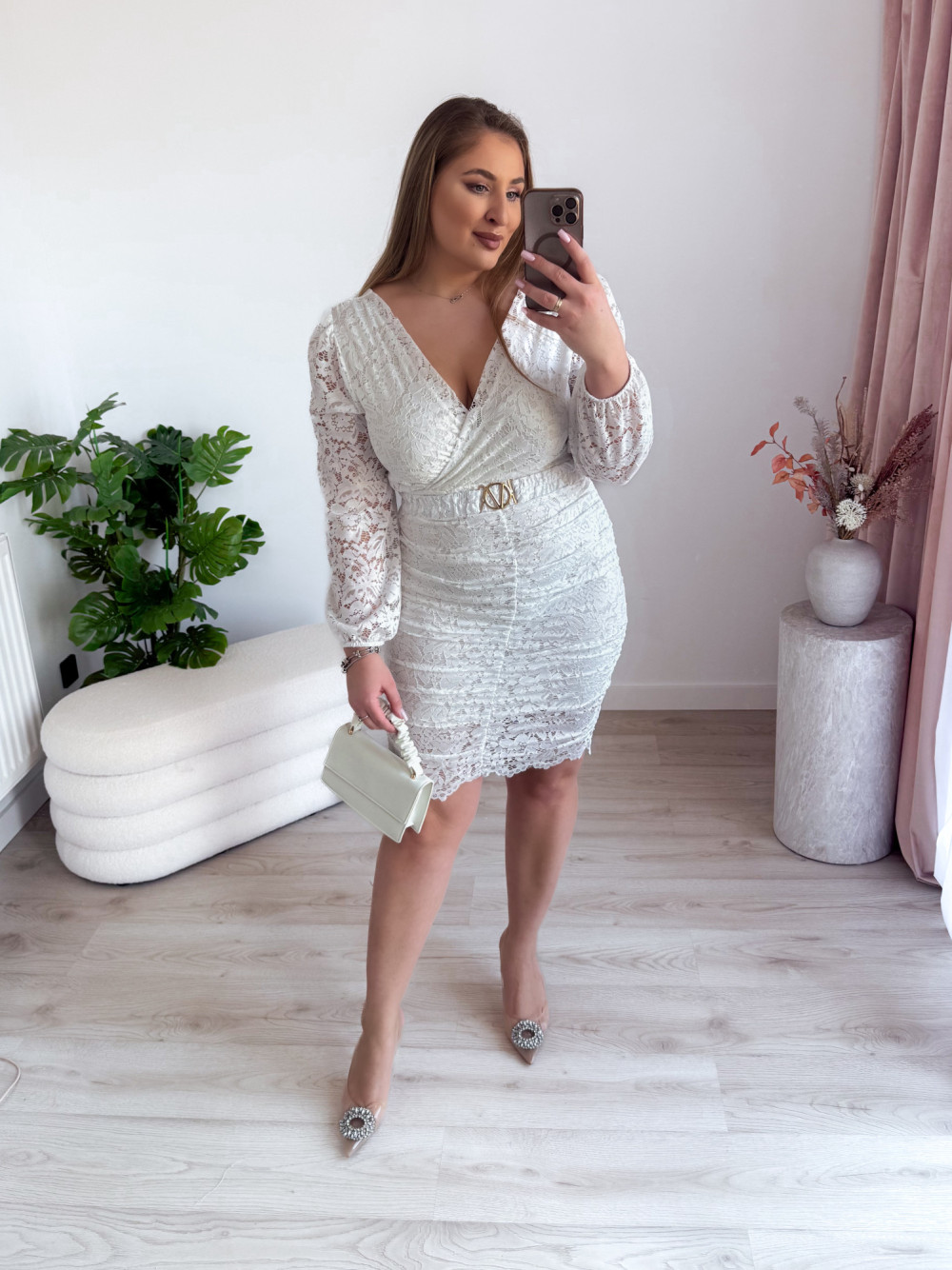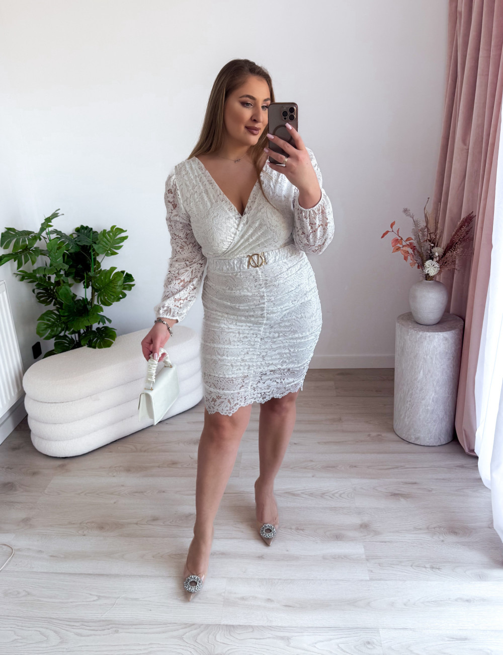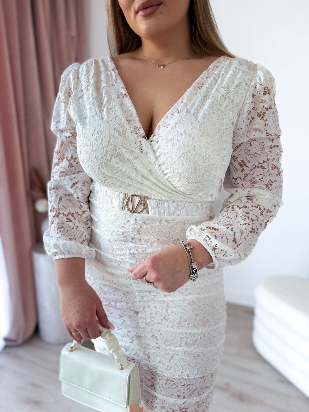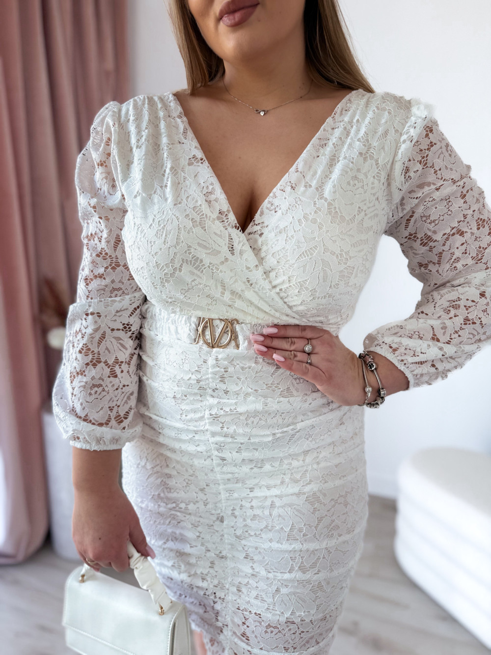 Ta wyjątkowa sukienka łączy w sobie delikatność koronki z kobiecym, zmysłowym krojem. Krótki fason podkreśla nogi, a subtelne marszczenia pięknie modelują sylwetkę, nadając jej lekkości i elegancji. Dekolt w kształcie litery V zarówno z przodu, jak i z tyłu dodaje kreacji wyrazistości oraz romantycznego charakteru. Długie, koronkowe rękawy dopełniają całość, tworząc efektowną, a jednocześnie szykowną stylizację idealną na wyjątkowe okazje.