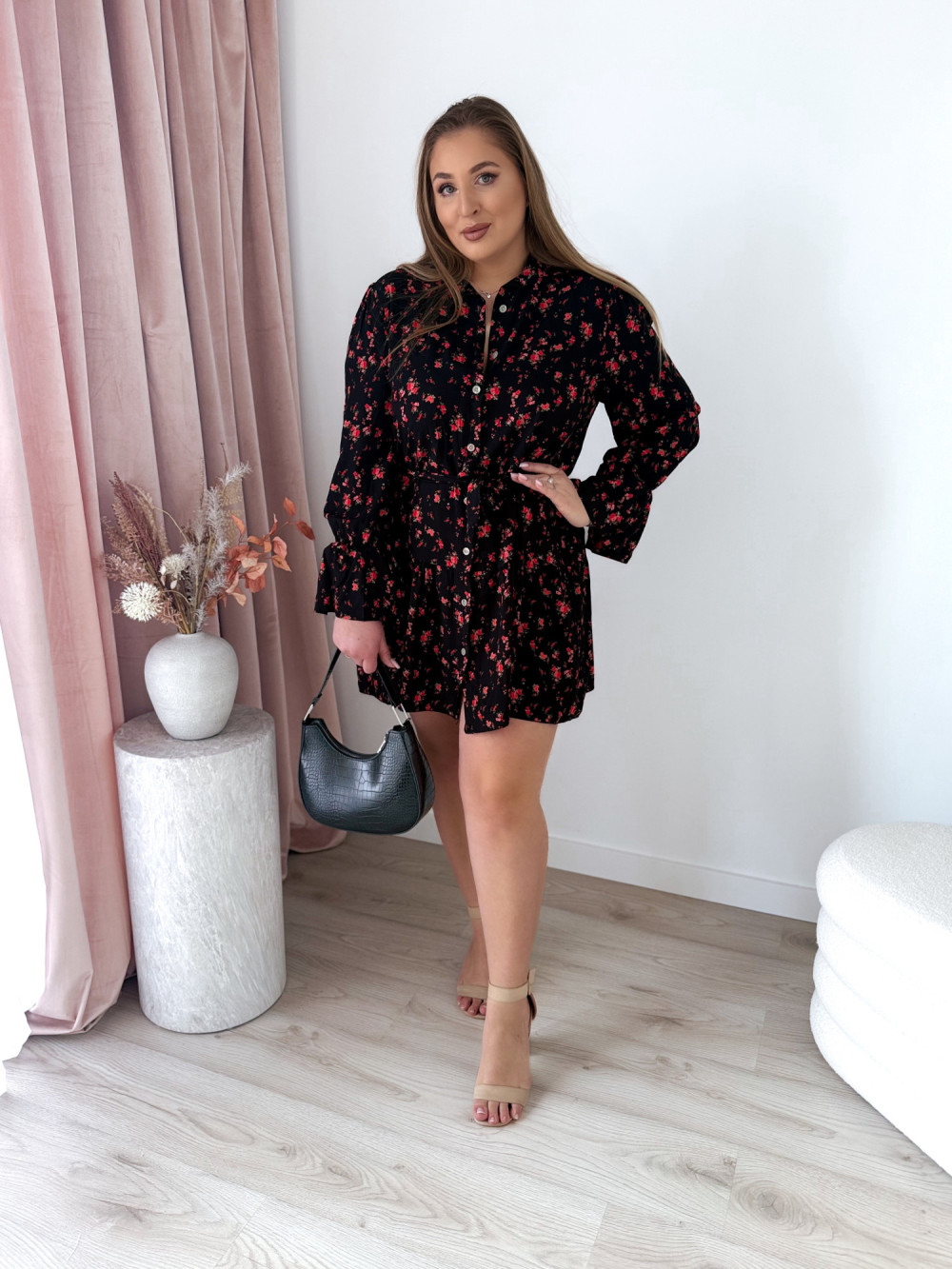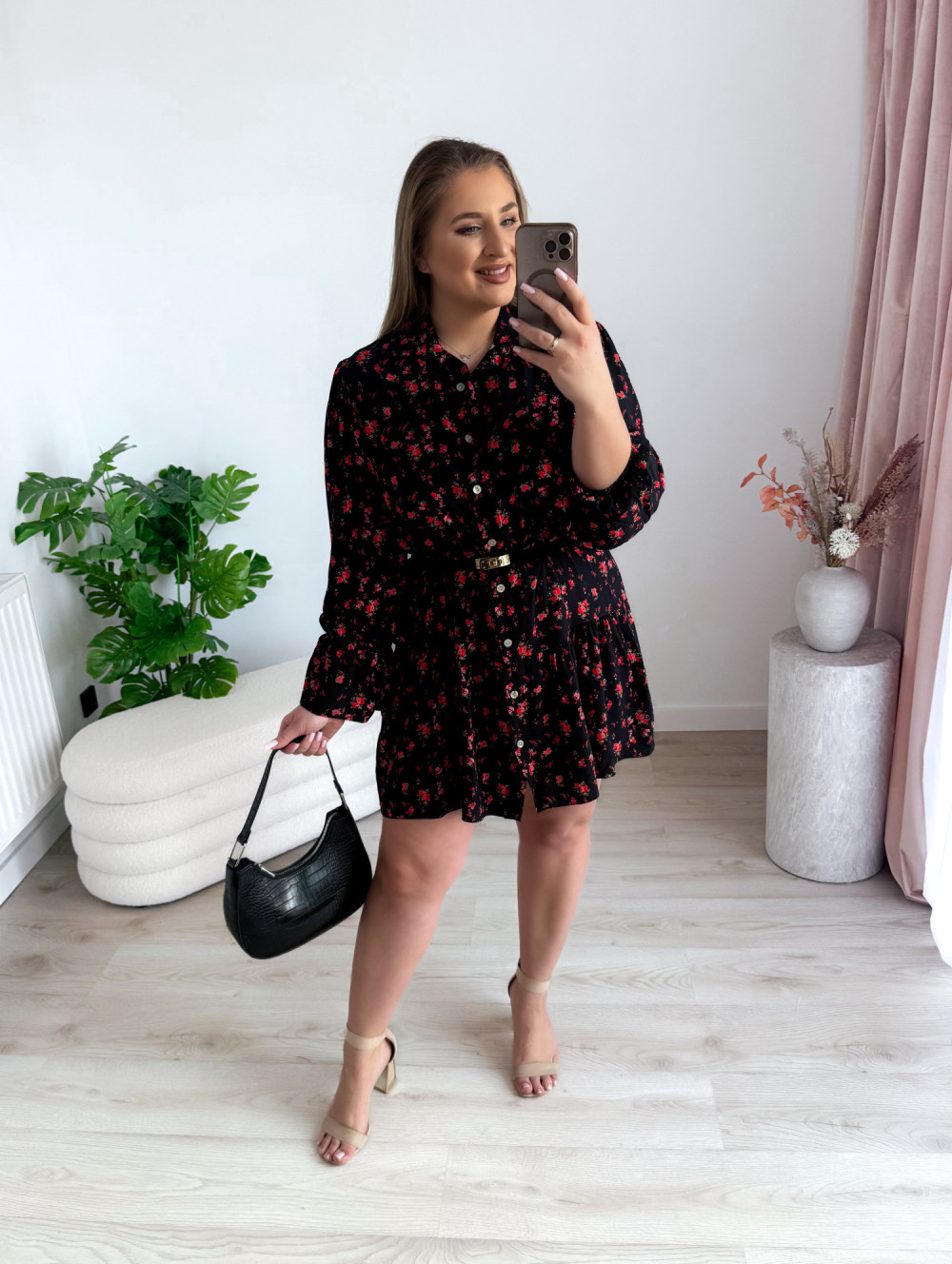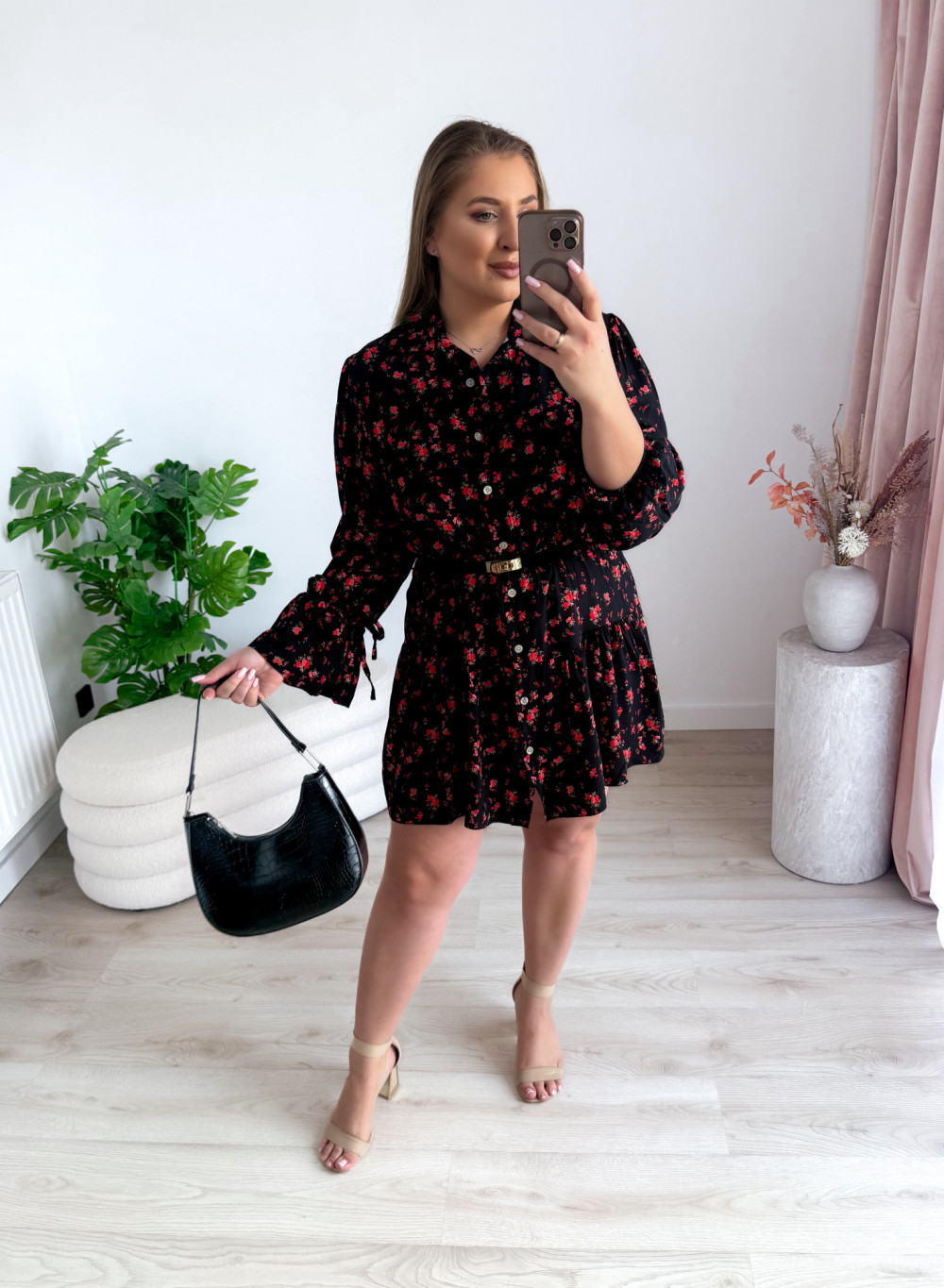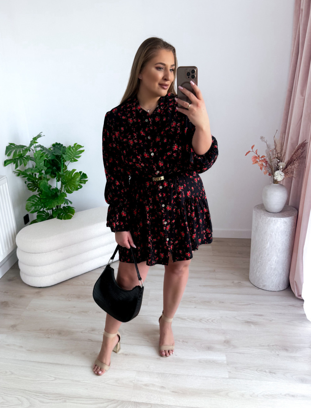 Sukienka z falbanką przy rękawie czarna w drobne kwiaty Emily